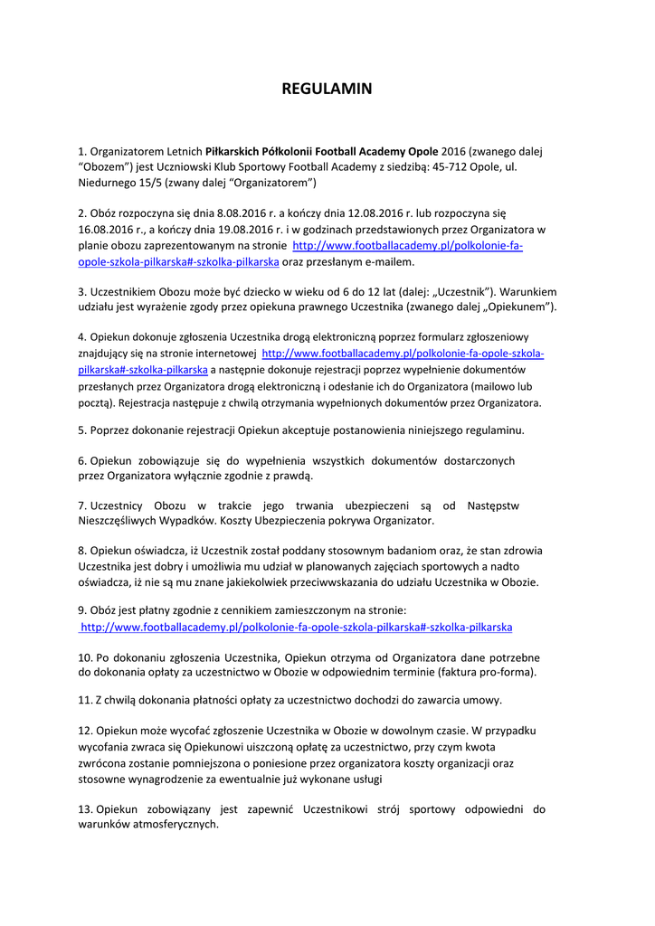 REGULAMIN 1. Organizatorem Letnich Piłkarskich Półkolonii Football Academy Opole 2016 (zwanego dalej “Obozem”) jest Uczniowski Klub Sportowy Football Academy z siedzibą: 45-712 Opole, ul. Niedurnego 15/5 (zwany dalej “Organizatorem”) 2. Obóz rozpoczyna się dnia 8.08.2016 r. a kończy dnia 12.08.2016 r. lub rozpoczyna się 16.08.2016 r., a kończy dnia 19.08.2016 r. i w godzinach przedstawionych przez Organizatora w planie obozu zaprezentowanym na stronie http://www.footballacademy.pl/polkolonie-faopole-szkola-pilkarska#-szkolka-pilkarska oraz przesłanym e-mailem. 3. Uczestnikiem Obozu może być dziecko w wieku od 6 do 12 lat (dalej: „Uczestnik”). Warunkiem udziału jest wyrażenie zgody przez opiekuna prawnego Uczestnika (zwanego dalej „Opiekunem”). 4. Opiekun dokonuje zgłoszenia Uczestnika drogą elektroniczną poprzez formularz zgłoszeniowy znajdujący się na stronie internetowej http://www.footballacademy.pl/polkolonie-fa-opole-szkolapilkarska#-szkolka-pilkarska a następnie dokonuje rejestracji poprzez wypełnienie dokumentów przesłanych przez Organizatora drogą elektroniczną i odesłanie ich do Organizatora (mailowo lub pocztą). Rejestracja następuje z chwilą otrzymania wypełnionych dokumentów przez Organizatora. 5. Poprzez dokonanie rejestracji Opiekun akceptuje postanowienia niniejszego regulaminu. 6. Opiekun zobowiązuje się do wypełnienia wszystkich dokumentów dostarczonych przez Organizatora wyłącznie zgodnie z prawdą. 7. Uczestnicy Obozu w trakcie jego trwania ubezpieczeni są od Następstw Nieszczęśliwych Wypadków. Koszty Ubezpieczenia pokrywa Organizator. 8. Opiekun oświadcza, iż Uczestnik został poddany stosownym badaniom oraz, że stan zdrowia Uczestnika jest dobry i umożliwia mu udział w planowanych zajęciach sportowych a nadto oświadcza, iż nie są mu znane jakiekolwiek przeciwwskazania do udziału Uczestnika w Obozie. 9. Obóz jest płatny zgodnie z cennikiem zamieszczonym na stronie: http://www.footballacademy.pl/polkolonie-fa-opole-szkola-pilkarska#-szkolka-pilkarska 10. Po dokonaniu zgłoszenia Uczestnika, Opiekun otrzyma od Organizatora dane potrzebne do dokonania opłaty za uczestnictwo w Obozie w odpowiednim terminie (faktura pro-forma). 11. Z chwilą dokonania płatności opłaty za uczestnictwo dochodzi do zawarcia umowy. 12. Opiekun może wycofać zgłoszenie Uczestnika w Obozie w dowolnym czasie. W przypadku wycofania zwraca się Opiekunowi uiszczoną opłatę za uczestnictwo, przy czym kwota zwrócona zostanie pomniejszona o poniesione przez organizatora koszty organizacji oraz stosowne wynagrodzenie za ewentualnie już wykonane usługi 13. Opiekun zobowiązany jest zapewnić Uczestnikowi strój sportowy odpowiedni do warunków atmosferycznych. 14. W ramach Obozu Organizator zapewnia jego Uczestnikom: wyżywienie oraz zajęcia sportowe wraz z innymi atrakcjami opisanymi na stronie http://www.footballacademy.pl/polkolonie- faopole-szkola-pilkarska#-szkolka-pilkarska 15. Uczestnik w trakcie trwania Obozu pozostaje pod opieką Organizatora i powinien wykonywać wszystkie jego polecenia. Nie wykonywanie przez Uczestnika poleceń porządkowych Opiekuna, prowadzące do zagrożenia życia lub zdrowia tego Uczestnika lub innych osób biorących udział w Obozie jest podstawą do odstąpienia od umowy przez Organizatora. Przed odstąpieniem Organizator poinformuje Opiekuna o zachowaniu Uczestnika wzywając do wykonywania poleceń.