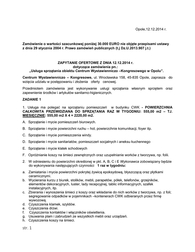 Opole,12.12.2014 r. Zamówienie o wartości szacunkowej poniżej 30.000 EURO nie objęte przepisami ustawy z dnia 29 stycznia 2004 r. Prawo zamówień publicznych (t.j Dz.U.2013.907 j.t.) ZAPYTANIE OFERTOWE Z DNIA 12.12.2014 r. dotyczące zamówienia pn.: „Usługa sprzątania obiektu Centrum Wystawienniczo –Kongresowego w Opolu”. Centrum Wystawienniczo – Kongresowe, ul. Wrocławska 158, 45-835 Opole, zaprasza do wzięcia udziału w postępowaniu i złożenia oferty cenowej. Przedmiotem zamówienia jest wykonywanie usługi sprzątania własnym sprzętem oraz zapewnienie środków i artykułów sanitarno-higienicznych. ZADANIE 1 1. Usługa ma polegać na sprzątaniu pomieszczeń w budynku CWK - POWIERZCHNIA CAŁKOWITA PRZEWIDZIANA DO SPRZĄTANIA RAZ W TYGODNIU: 555,00 m2 – TJ. MIESIĘCZNIE: 555,00 m2 X 4 = 2220,00 m2. A. Sprzątanie i mycie pomieszczeń biurowych. B. Sprzątanie i mycie powierzchni ruchu – hol, powierzchnie komunikacji, foyer itp. C. Sprzątanie i mycie pomieszczenia windy. D. Sprzątanie i mycie sanitariatów, pomieszczeń socjalnych i aneksu kuchennego E. Sprzątanie i mycie klatek schodowych F. Opróżnianie koszy na śmieci zewnętrznych oraz uzupełnianie worków z tworzywa, np. folii. 2. W odniesieniu do powierzchni określonej w pkt. A, B, C i E Wykonawca zobowiązany będzie do wykonywania następujących czynności 1 raz w tygodniu: a. Zamiatania i mycia powierzchni pokrytej żywicą epoksydową, błyszczącą oraz płytkami ceramicznymi. b. Wycierania kurzu z biurek, stolików, mebli, parapetów, półek, telefonów, grzejników, elementów dekoracyjnych, luster, lady recepcyjnej, tablic informacyjnych, szafek instalacyjnych, itp. c. Zbierania i wynoszenia śmieci z koszy oraz wkładanie do nich worków z tworzywa, np. z foli; segregowanie odpadków w pojemnikach –kontenerach CWK odbieranych przez firmę wywozową. d. Czyszczenia klamek, szyldów. e. Czyszczenia drzwi. f. Czyszczenia kontaktów i włączników oświetlenia. g. Usuwania plam i zabrudzeń ze wszystkich mebli oraz urządzeń. h. Czyszczenia koszy na śmieci. str. 1 3. W odniesieniu do powierzchni określonych w pkt. D Wykonawca zobowiązany będzie do wykonywania następujących czynności 1 raz w tygodniu: a. Czyszczenia luster. b. Czyszczenia dozowników mydła, podajników papieru toaletowego i ręczników papierowych. c. Mycia i dezynfekowania misek ustępowych, pisuarów, desek sedesowych, płytek przycisku, umywalek, baterii łazienkowych, brodzika prysznicowego, zlewów ze stali nierdzewnej i wnętrza szafek pod nimi, zaworów i rur we wnętrzach pomieszczeń, pojemników ze szczotkami wc. d. Mycia posadzek pomieszczeń – płytki ceramiczne. e. Czyszczenia drzwi, klamek, szyldów. f. Opróżniania koszy na śmieci oraz uzupełniania worków z tworzywa, np. folii. g. Zakładania kostek zapachowych w sanitariatach i rozkładanie odświeżaczy powietrza w toaletach. h. Zakładania ręczników papierowych i uzupełnianie mydła w pojemnikach. i. Zakładania papieru toaletowego w toaletach. j. Opróżniania i mycie wiaderek na odpady. 4. Wykonawca w ramach zlecenia zapewnia środki czystości tj. detergenty do mycia i czyszczenia powierzchni, urządzeń, sanitariatów, mydło w płynie toaletowe, kostki zapachowe, papier toaletowy, worki na śmieci, ręczniki papierowe, itp. (wszystkie wymienione produkty muszą spełniać przewidziane prawem normy i posiadać stosowne atesty). Wyżej wymienione środki czystości będą uzupełniane przez Wykonawcę wg. zużycia. ZADANIE 2 1. Usługa ma polegać na sprzątaniu wraz z zapewnieniem sprzętu, artykułów i środków czystości, według wyżej wymienionych (w opisie Zadania 1) zasad, pomieszczeń wykorzystywanych podczas imprez przeprowadzanych w Centrum Wystawienniczo – Kongresowym w Opolu. 2. Maksymalna sprzątana powierzchnia nie może wynieść więcej niż 3 505,00 m2 –wykluczone jest liczenie powierzchni dwa razy, czyli przed i po imprezie. 3. Pomieszczenia do sprzątania będą wskazywane przez ZAMAWIAJACEGO przed daną imprezą. 4. W czasie imprezy Wykonawca ma zapewnić dyżur sprzątającego/sprzątających. 5. Zawiadomienie o imprezie zostanie przesłane firmie minimum 5 dni przed imprezą (za zgodą Wykonawcy termin może być krótszy), z możliwością odwołania usługi przez Zamawiającego. 6. Przewidywana ilość imprez wymagających usługi sprzątania w okresie zamówienia szacowana jest na ok.15 imprez – po ok. 18 h każda. Określona przez Zamawiającego prognozowana ilość imprez ma charakter orientacyjny; wielkość ta nie odzwierciedla realnej lub deklarowanej w czasie trwania umowy ilości imprez wymagających sprzątania i nie może być podstawą jakichkolwiek roszczeń ze strony Wykonawcy. ZADANIE 1 i ZADANIE 2 1. Wykonawca odpowiada za przeprowadzenie prac zgodnie z obowiązującymi przepisami prawa, w tym dopilnuje, aby osoby wykonujące przedmiotowe prace posiadały odpowiednie kwalifikacje. str. 2 Ponad to, Wykonawca będzie zobowiązany do: a) usuwania w pomieszczeniach wskazanych w pkt. D kamienia z misek ustępowych, pisuarów, umywalek, brodzika, zlewozmywaków, baterii łazienkowych i kuchennych / pokój socjalny/aneks kuchenny oraz płytek – według potrzeb (kamień nie może się pojawić). b) czyszczenia ścian pokrytych farbą żywiczną (do wys. 2 m) w łazienkach i pomieszczeniach socjalnych/kuchennych, szatniach co najmniej 1 raz w miesiącu. c) zapewnienia osób i środków (oprzyrządowanie, środki czystości, worki foliowe itp.) koniecznych do wykonania przedmiotowego zamówienia. d) zapewnienia sprzętu do sprzątania, materiałów sanitarnych typu: papier toaletowy, ręczniki papierowe, mydło w płynie, itp. 2. Wymienione w pkt. c) i d) materiały muszą spełniać warunki przewidziane przez dostawców urządzeń oraz posiadać wymagane atesty. 3. Istnieje możliwość obejrzenia na miejscu obiektu Zamawiającego, po wcześniejszym uzgodnieniu terminu. W przypadku organizowan
