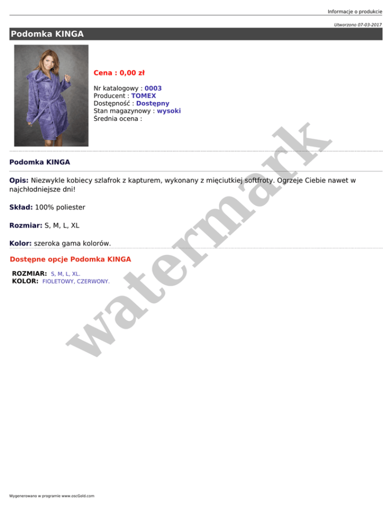 Informacje o produkcie Utworzono 07-03-2017 Podomka KINGA Cena : 0,00 zł Podomka KINGA er m ar k Nr katalogowy : 0003 Producent : TOMEX Dostępność : Dostępny Stan magazynowy : wysoki Średnia ocena : Opis: Niezwykle kobiecy szlafrok z kapturem, wykonany z mięciutkiej softfroty. Ogrzeje Ciebie nawet w najchłodniejsze dni! Skład: 100% poliester Rozmiar: S, M, L, XL Kolor: szeroka gama kolorów. Dostępne opcje Podomka KINGA w at ROZMIAR: S, M, L, XL. KOLOR: FIOLETOWY, CZERWONY. Wygenerowano w programie www.oscGold.com