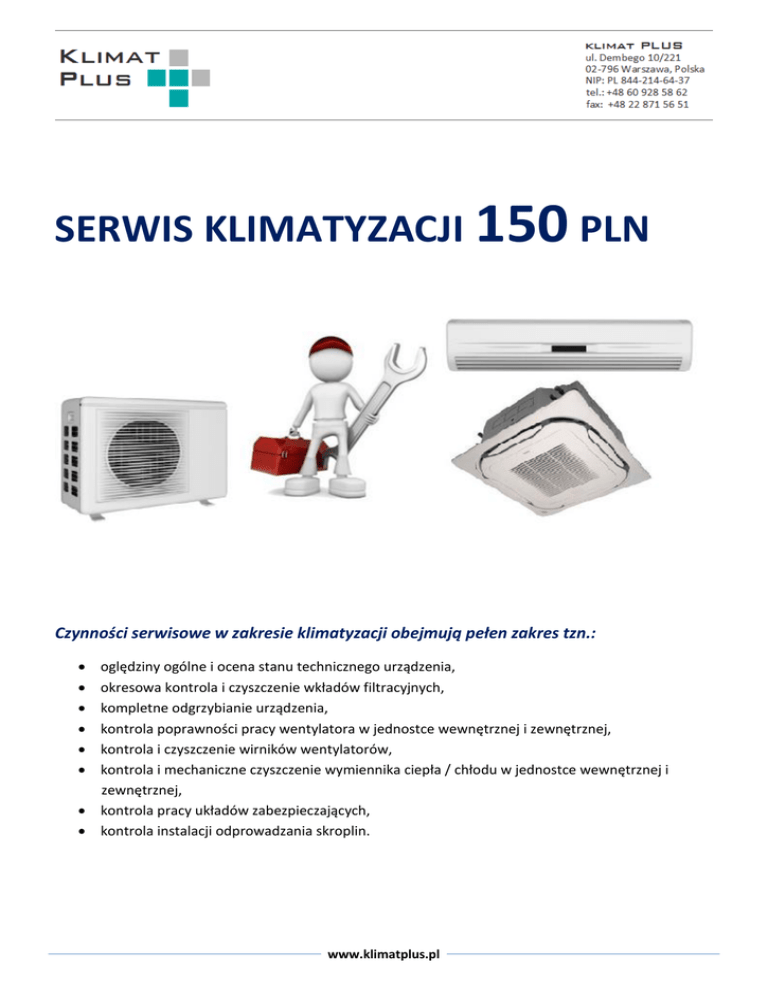 SERWIS KLIMATYZACJI 150 PLN Czynności serwisowe w zakresie klimatyzacji obejmują pełen zakres tzn.: oględziny ogólne i ocena stanu technicznego urządzenia, okresowa kontrola i czyszczenie wkładów filtracyjnych, kompletne odgrzybianie urządzenia, kontrola poprawności pracy wentylatora w jednostce wewnętrznej i zewnętrznej, kontrola i czyszczenie wirników wentylatorów, kontrola i mechaniczne czyszczenie wymiennika ciepła / chłodu w jednostce wewnętrznej i zewnętrznej, kontrola pracy układów zabezpieczających, kontrola instalacji odprowadzania skroplin. www.klimatplus.pl