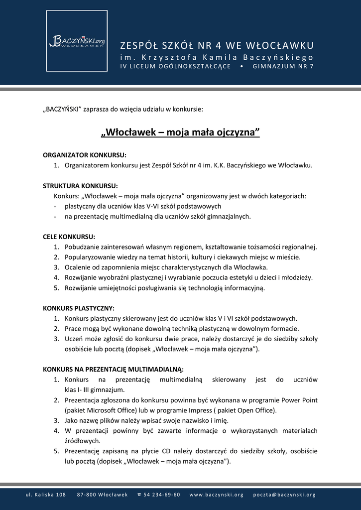 ZESPÓŁ SZKÓŁ NR 4 WE WŁOCŁAWKU im. Krzysztofa Kamila Baczyńskiego IV LICEUM OGÓLNOKSZTAŁCĄCE • GIMNAZJUM NR 7 „BACZYŃSKI” zaprasza do wzięcia udziału w konkursie: „Włocławek – moja mała ojczyzna” ORGANIZATOR KONKURSU: 1. Organizatorem konkursu jest Zespół Szkół nr 4 im. K.K. Baczyńskiego we Włocławku. STRUKTURA KONKURSU: Konkurs: „Włocławek – moja mała ojczyzna” organizowany jest w dwóch kategoriach: - plastyczny dla uczniów klas V-VI szkół podstawowych - na prezentację multimedialną dla uczniów szkół gimnazjalnych. CELE KONKURSU: 1. Pobudzanie zainteresowań własnym regionem, kształtowanie tożsamości regionalnej. 2. Popularyzowanie wiedzy na temat historii, kultury i ciekawych miejsc w mieście. 3. Ocalenie od zapomnienia miejsc charakterystycznych dla Włocławka. 4. Rozwijanie wyobraźni plastycznej i wyrabianie poczucia estetyki u dzieci i młodzieży. 5. Rozwijanie umiejętności posługiwania się technologią informacyjną. KONKURS PLASTYCZNY: 1. Konkurs plastyczny skierowany jest do uczniów klas V i VI szkół podstawowych. 2. Prace mogą być wykonane dowolną techniką plastyczną w dowolnym formacie. 3. Uczeń może zgłosić do konkursu dwie prace, należy dostarczyć je do siedziby szkoły osobiście lub pocztą (dopisek „Włocławek – moja mała ojczyzna”). KONKURS NA PREZENTACJĘ MULTIMADIALNĄ: 1. Konkurs na prezentację multimedialną skierowany jest do uczniów klas I- III gimnazjum. 2. Prezentacja zgłoszona do konkursu powinna być wykonana w programie Power Point (pakiet Microsoft Office) lub w programie Impress ( pakiet Open Office). 3. Jako nazwę plików należy wpisać swoje nazwisko i imię. 4. W prezentacji powinny być zawarte informacje o wykorzystanych materiałach źródłowych. 5. Prezentację zapisaną na płycie CD należy dostarczyć do siedziby szkoły, osobiście lub pocztą (dopisek „Włocławek – moja mała ojczyzna”). ul. Kaliska 108 87-800 Włocławek % 54 234-69-60 www.baczynski.org [email protected] ZESPÓŁ SZKÓŁ NR 4 WE WŁOCŁAWKU im. Krzysztofa Kamila Baczyńskiego IV LICEUM OGÓLNOKSZTAŁCĄCE • GIMNAZJUM NR 7 KRYTERIA OCENY: - Oryginalność i pomysłowość tematu, - Walory edukacyjne i promocyjne, - Zakres i przekaz informacji. POZOSTAŁE POSTANOWIENIA ORGANIZACYJNE: 1. Każda praca powinna zawierać dane: - imię i nazwisko uczestnika konkursu oraz dołączony formularz zgłoszeniowy. 2. Prace należy dostarczyć do siedziby szkoły ul. Kaliska 108, 87-800 Włocławek w terminie do 08.05.2014 3. Prace konkursowe będą oceniane przez jury w składzie określonym przez organizatora. Decyzje jury są ostateczne. 4. Złożone prace przechodzą na własność organizatora konkursu i nie podlegają zwrotowi. 5. Złożenie pracy konkursowej jest równoznaczne z przyjęciem warunków konkursu. 6. Ogłoszenie wyników i wręczenie nagród nastąpi 22. 05. 2014 o godz. 16:00 w trakcie Drzwi Otwartych w siedzibie „Baczyńskiego”. 7. Więcej informacji pod nr telefonu 54 234 69 60 ul. Kaliska 108 87-800 Włocławek % 54 234-69-60 www.baczynski.org [email protected] Pieczęć szkoły zgłaszającej: FORMULARZ ZGŁOSZENIOWY W KONKURSIE „WŁOCŁAWEK – MOJA MAŁA OJCZYZNA” Imię i nazwisko ucznia Nazwa szkoły Adres szkoły Telefon do szkoły Klasa ucznia Wiek ucznia e-mail ucznia Imię i nazwisko nauczyciela – opiekuna ucznia e-mail nauczyciela - opiekuna Telefon nauczyciela -opiekuna Wyrażam zgodę na udział mojego dziecka ................................................................................................... w w/w konkursie i wykorzystanie przez Organizatora danych osobowych mojego dziecka dla potrzeb przeprowadzenia konkursu. Podanie danych osobowych jest dobrowolne , choć niezbędne dla prawidłowego przeprowadzenia i rozstrzygnięcia konkursu. ................................................... .................................................................... podpis uczestnika konkursu miejscowość, data, podpis opiekuna prawnego Formularz zgłoszeniowy wraz z pracą konkursową należy dostarczyć do 8 maja 2014, do sekretariatu ZS nr 4 im. K. K. Baczyńskiego, ul. Kaliska 108, 87-800 Włocławek, lub przesłać skan w wersji elektronicznej na adres e-mail: [email protected] ul. Kaliska 108 87-800 Włocławek % 54 234-69-60 www.baczynski.org [email protected]