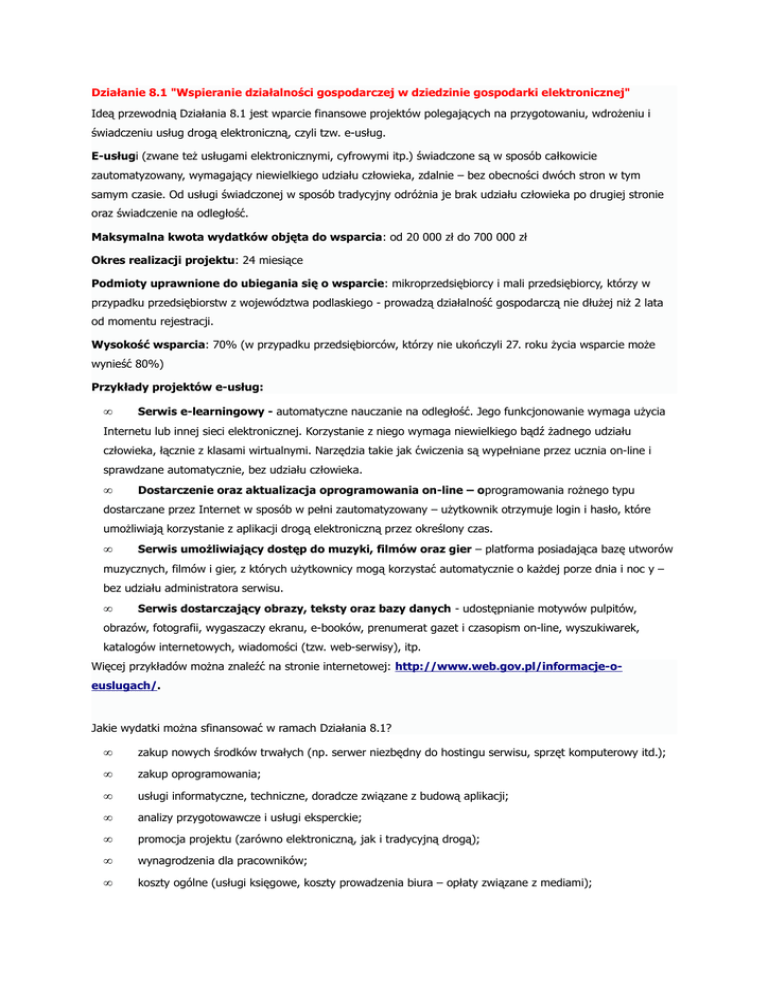 Działanie 8.1 "Wspieranie działalności gospodarczej w dziedzinie gospodarki elektronicznej" Ideą przewodnią Działania 8.1 jest wparcie finansowe projektów polegających na przygotowaniu, wdrożeniu i świadczeniu usług drogą elektroniczną, czyli tzw. e-usług. E-usługi (zwane też usługami elektronicznymi, cyfrowymi itp.) świadczone są w sposób całkowicie zautomatyzowany, wymagający niewielkiego udziału człowieka, zdalnie – bez obecności dwóch stron w tym samym czasie. Od usługi świadczonej w sposób tradycyjny odróżnia je brak udziału człowieka po drugiej stronie oraz świadczenie na odległość. Maksymalna kwota wydatków objęta do wsparcia: od 20 000 zł do 700 000 zł Okres realizacji projektu: 24 miesiące Podmioty uprawnione do ubiegania się o wsparcie: mikroprzedsiębiorcy i mali przedsiębiorcy, którzy w przypadku przedsiębiorstw z województwa podlaskiego - prowadzą działalność gospodarczą nie dłużej niż 2 lata od momentu rejestracji. Wysokość wsparcia: 70% (w przypadku przedsiębiorców, którzy nie ukończyli 27. roku życia wsparcie może wynieść 80%) Przykłady projektów e-usług: • Serwis e-learningowy - automatyczne nauczanie na odległość. Jego funkcjonowanie wymaga użycia Internetu lub innej sieci elektronicznej. Korzystanie z niego wymaga niewielkiego bądź żadnego udziału człowieka, łącznie z klasami wirtualnymi. Narzędzia takie jak ćwiczenia są wypełniane przez ucznia on-line i sprawdzane automatycznie, bez udziału człowieka. • Dostarczenie oraz aktualizacja oprogramowania on-line – oprogramowania rożnego typu dostarczane przez Internet w sposób w pełni zautomatyzowany – użytkownik otrzymuje login i hasło, które umożliwiają korzystanie z aplikacji drogą elektroniczną przez określony czas. • Serwis umożliwiający dostęp do muzyki, filmów oraz gier – platforma posiadająca bazę utworów muzycznych, filmów i gier, z których użytkownicy mogą korzystać automatycznie o każdej porze dnia i noc y – bez udziału administratora serwisu. • Serwis dostarczający obrazy, teksty oraz bazy danych - udostępnianie motywów pulpitów, obrazów, fotografii, wygaszaczy ekranu, e-booków, prenumerat gazet i czasopism on-line, wyszukiwarek, katalogów internetowych, wiadomości (tzw. web-serwisy), itp. Więcej przykładów można znaleźć na stronie internetowej: http://www.web.gov.pl/informacje-oeuslugach/. Jakie wydatki można sfinansować w ramach Działania 8.1? • zakup nowych środków trwałych (np. serwer niezbędny do hostingu serwisu, sprzęt komputerowy itd.); • zakup oprogramowania; • usługi informatyczne, techniczne, doradcze związane z budową aplikacji; • analizy przygotowawcze i usługi eksperckie; • promocja projektu (zarówno elektroniczną, jak i tradycyjną drogą); • wynagrodzenia dla pracowników; • koszty ogólne (usługi księgowe, koszty prowadzenia biura – opłaty związane z mediami); • szkolenia pracowników zaangażowanych w realizację projektu (do 10% pozostałych kosztów).