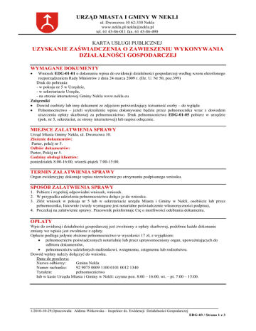 URZĄD MIASTA I GMINY W NEKLI ul. Dworcowa 10 62-330 Nekla www.nekla.pl [email protected] tel. 61 43-86-011 fax. 61 43-86-490 KARTA USŁUGI PUBLICZNEJ UZYSKANIE ZAŚWIADCZENIA O ZAWIESZENIU WYKONYWANIA DZIAŁALNOŚCI GOSPODARCZEJ WYMAGANE DOKUMENTY • Wniosek EDG-01-01 o dokonaniu wpisu do ewidencji działalności gospodarczej według wzoru określonego rozporządzeniem Rady Ministrów z dnia 24 marca 2009 r. (Dz. U. Nr 50, poz.399) Druk do pobrania: - w pokoju nr 5 w Urzędzie, - w sekretariacie Urzędu, - na stronie internetowej Gminy Nekla www.nekla.eu Załączniki • Dowód osobisty lub inny dokument ze zdjęciem potwierdzający tożsamość osoby – do wglądu • Pełnomocnictwo – jeżeli wykreślenie wpisu dokonywane będzie przez pełnomocnika wraz z dowodem uiszczenia opłaty skarbowej za pełnomocnictwo. Druk pełnomocnictwa EDG-01-05 pobierz w urzędzie (pok. nr 5, sekretariat, ze strony internetowej) lub napisz odręcznie. MIEJSCE ZAŁATWIENIA SPRAWY Urząd Miasta Gminy Nekla, ul. Dworcowa 10. Złożenie dokumentów: Parter, pokój nr 5. Odbiór dokumentów: Parter, Pokój nr 5. Godziny obsługi klientów: poniedziałek 8:00-16:00, wtorek-piątek 7:00-15:00. TERMIN ZAŁATWIENIA SPRAWY Organ ewidencyjny dokonuje wpisu niezwłocznie po otrzymaniu podpisanego wniosku. SPOSÓB ZAŁATWIENIA SPRAWY 1. Pobierz i wypełnij odpowiedni wniosek, wniosek. 2. W przypadku udzielenia pełnomocnictwa dołącz je do wniosku. 3. Złóż wniosek w pokoju nr 5 lub w sekretariacie urzędu Miasta i Gminy w Nekli, osobiście lub przez pełnomocnika, listownie (wtedy wymagane jest notarialne poświadczenie własnoręczności podpisu), 4. Poczekaj na załatwienie sprawy. Pracownik poinformuje Cię o możliwości odebrania dokumentu. OPŁATY Wpis do ewidencji działalności gospodarczej jest zwolniony z opłaty skarbowej, podobnie każde dokonanie zmiany we wpisie jest zwolnione z opłaty. Opłacie podlega jedynie złożone pełnomocnictwo w wysokości 17 zł, z wyjątkiem: • pełnomocnictw poświadczonych notarialnie lub przez uprawomocniony organ, upoważniających do odbioru dokumentów, • pełnomocnictw udzielonych małżonkowi, wstępnemu, zstępnemu lub rodzeństwu. Dowód wpłaty należy dołączyć do wniosku. Dane do przelewu: Nazwa odbiorcy: Gmina Nekla Numer rachunku: 92 9075 0009 1100 0101 0012 1340 Tytułem: pełnomocnictwo lub w kasie Urzędu Miasta i Gminy w Nekli: czynna pon. 8:00 – 16:00, wt. – pt. 7:00 – 15:00. 1/2010-10-29,Opracowała: Aldona Witkowska – Inspektor ds. Ewidencji Działalności Gospodarczej EDG-03 / Strona 1 z 3 URZĄD MIASTA I GMINY W NEKLI ul. Dworcowa 10 62-330 Nekla www.nekla.pl [email protected] tel. 61 43-86-011 fax. 61 43-86-490 KARTA USŁUGI PUBLICZNEJ TRYB ODWOŁAWCZY Nie przysługuje odwołanie. DODATKOWE INFORMACJE • • • • • • • • • • • • • Wniosek EDG-01-01 jest jednocześnie - wnioskiem wpisu do krajowego rejestru urzędowego podmiotów gospodarki narodowej (REGON), - zgłoszeniem identyfikacyjnym albo aktualizacyjnym do naczelnika urzędu skarbowego - zgłoszeniem albo zmianą zgłoszenia płatnika do Zakładu Ubezpieczeń Społecznych albo oświadczeniem o kontynuowaniu ubezpieczenia społecznego rolników Dane z wniosku o wpis do ewidencji działalności gospodarczej, organ ewidencyjny niezwłocznie , nie później niż w ciągu 3 dni od dnia dokonania wpisu, przesyła do wskazanego przez przedsiębiorcę naczelnika Urzędu Skarbowego, właściwego Urzędu Statystycznego oraz właściwej jednostki terenowej Zakładu Ubezpieczeń Społecznych albo Centrali Kasy Rolniczego Ubezpieczenia Społecznego wraz z kopią zaświadczenia o wpisie do ewidencji działalności gospodarczej. Przedsiębiorca, który nie zatrudnia pracowników, może zawiesić wykonywanie działalności gospodarczej na okres od 1 miesiąca do 24 miesięcy. Zawieszenie następuje na wniosek przedsiębiorcy Okres zawieszenia liczy się od dnia wskazanego we wniosku, nie wcześniej niż dzień złożenia wniosku i trwa do dnia złożenia wniosku o wznowienie działalności gospodarczej. Zawieszenie działalności wywiera skutki prawne od dnia, w którym rozpoczyna się zawieszenie wykonywania działalności i trwa do dnia poprzedzającego dzień złożenia wniosku o wznowienie działalności gospodarczej. W czasie trwania zawieszenie działalności gospodarczej przedsiębiorca nie może wykonywać działalności gospodarczej i osiągać bieżących przychodów z pozarolniczej działalności gospodarczej. Jeśli działalność gospodarcza prowadzona jest przez spółkę cywilną to zawieszenie wykonywania działalności będzie skutkować tylko wtedy gdy zawieszenia dokonają wszyscy wspólnicy spółki. W okresie zawieszenia działalności przedsiębiorca ma prawo: - wykonywać czynności niezbędne do zachowania lub zabezpieczenia źródła przychodów, - przyjmować należności powstałych przed datą zawieszenia działalności (ma też obowiązek regulowania zobowiązań powstałych przed datą zawieszenia), - zbywać środki trwałe i wyposażenie, - osiągać przychody finansowe, także z działalności prowadzonej przed zawieszeniem wykonywania działalności. W okresie zawieszenia działalności przedsiębiorca musi wykonywać wszelkie obowiązki nakazane przepisami prawa, może też zostać poddany kontroli na zasadach przewidzianych dla przedsiębiorców wykonujących działąln0ość gospodarczą. Przedsiębiorca, który zawiesi działalność gospodarczą nie podlega ubezpieczeniu emerytalnemu, rentowemu, chorobowemu, wypadkowemu. Zaświadczenie może być wydane innej osobie, o ile posiada stosowne pełnomocnictwo lub upoważnienie, które podlega opłacie skarbowej w wysokości 17,00 zł z wyjątkiem pełnomocnictw poświadczonych notarialnie lub przez uprawniony organ, udzielonych małżonkowi, wstępnemu, zstępnemu lub rodzeństwu. Dodatkowych informacji udziela również p. Aldona Witkowska pok. nr 5 oraz pod nr tel. (61) 4373 