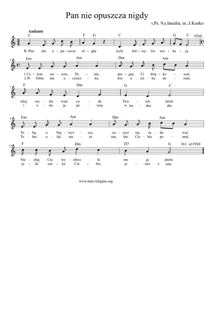 Pan nie opuszcza nigdy t.Ps. 9;s.Imedia; m.:J.Kosko Andante C 3 4 R.:Pan 5 łym Tobie ser ma cem, u C ni gdy tych, Go Pa cziecz pra kto dzię ku roz o sła sto wiać ję bą, bie o u Naj fać wyż mo szy, że Cię szu wy ka chwa Cie Ci cis Two w tru ka ją. FINE Am ko do wać, znał, ich dne dzieł, dni. cie ten, www.nuty.religijne.org C Dm la bie, G C Dm chaj śli gnę u szu G da wną Am rzy Dm nie, ka, cu pe któ Dm F Nie je G Am Em To To 11 pu szcza F chcę i 9 o Em 1.Ca 2.W 7 nie F Am szyć kto się, Cie ra bie do po D7 mo je wać. znał, G ja steś z pieśń. nim. D.C. al FINE