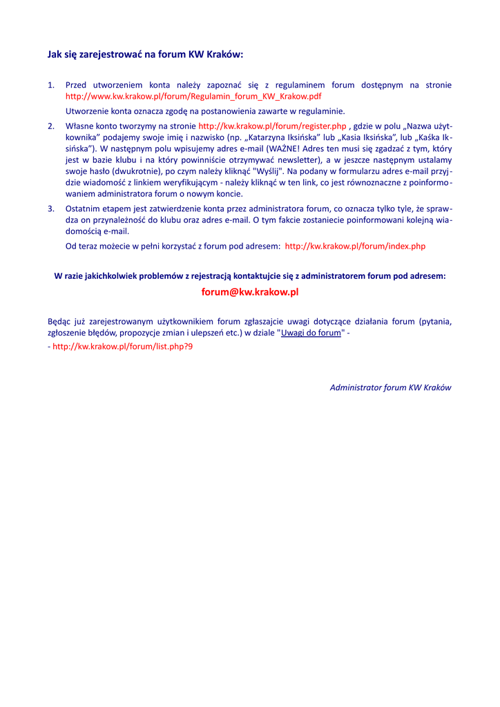 Jak się zarejestrować na forum KW Kraków: 1. Przed utworzeniem konta należy zapoznać się z regulaminem forum dostępnym na stronie http://www.kw.krakow.pl/forum/Regulamin_forum_KW_Krakow.pdf Utworzenie konta oznacza zgodę na postanowienia zawarte w regulaminie. 2. Własne konto tworzymy na stronie http://kw.krakow.pl/forum/register.php , gdzie w polu „Nazwa użytkownika” podajemy swoje imię i nazwisko (np. „Katarzyna Iksińska” lub „Kasia Iksińska”, lub „Kaśka Iksińska”). W następnym polu wpisujemy adres e-mail (WAŻNE! Adres ten musi się zgadzać z tym, który jest w bazie klubu i na który powinniście otrzymywać newsletter), a w jeszcze następnym ustalamy swoje hasło (dwukrotnie), po czym należy kliknąć "Wyślij". Na podany w formularzu adres e-mail przyjdzie wiadomość z linkiem weryfikującym - należy kliknąć w ten link, co jest równoznaczne z poinformo waniem administratora forum o nowym koncie. 3. Ostatnim etapem jest zatwierdzenie konta przez administratora forum, co oznacza tylko tyle, że sprawdza on przynależność do klubu oraz adres e-mail. O tym fakcie zostaniecie poinformowani kolejną wiadomością e-mail. Od teraz możecie w pełni korzystać z forum pod adresem: http://kw.krakow.pl/forum/index.php W razie jakichkolwiek problemów z rejestracją kontaktujcie się z administratorem forum pod adresem: [email protected] Będąc już zarejestrowanym użytkownikiem forum zgłaszajcie uwagi dotyczące działania forum (pytania, zgłoszenie błędów, propozycje zmian i ulepszeń etc.) w dziale "Uwagi do forum" - http://kw.krakow.pl/forum/list.php?9 Administrator forum KW Kraków