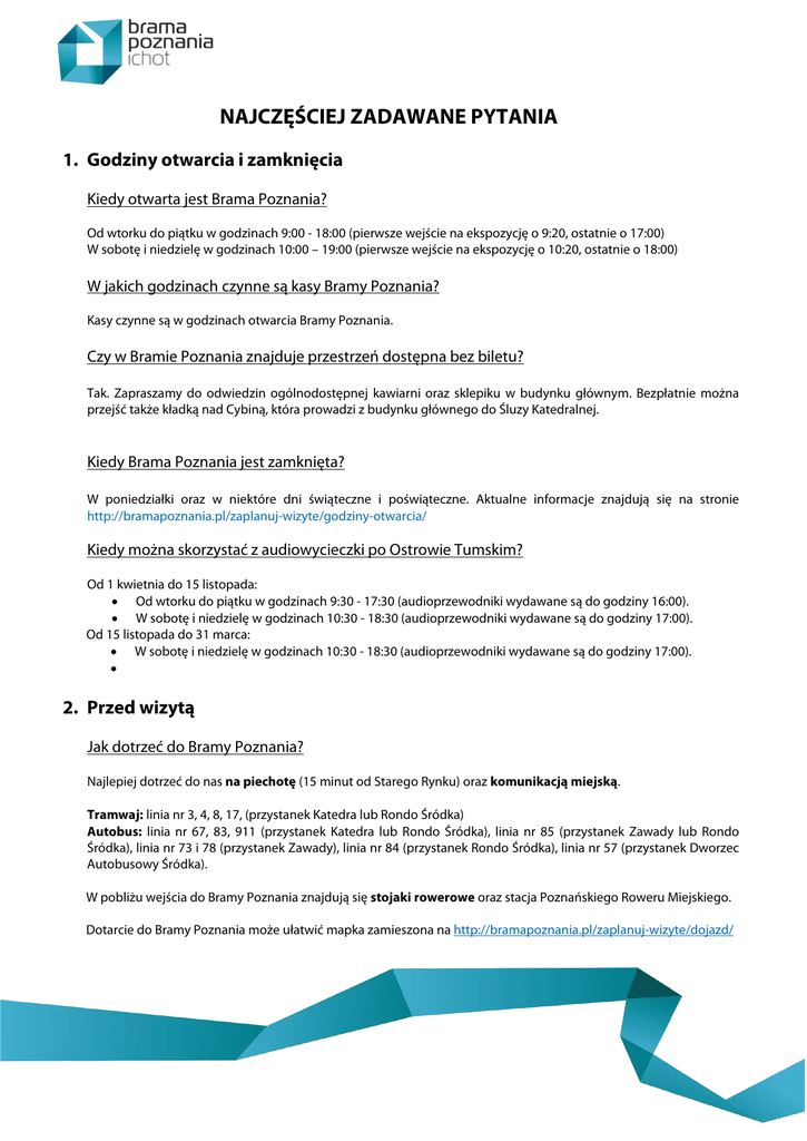 NAJCZĘŚCIEJ ZADAWANE PYTANIA 1. Godziny otwarcia i zamknięcia Kiedy otwarta jest Brama Poznania? Od wtorku do piątku w godzinach 9:00 - 18:00 (pierwsze wejście na ekspozycję o 9:20, ostatnie o 17:00) W sobotę i niedzielę w godzinach 10:00 – 19:00 (pierwsze wejście na ekspozycję o 10:20, ostatnie o 18:00) W jakich godzinach czynne są kasy Bramy Poznania? Kasy czynne są w godzinach otwarcia Bramy Poznania. Czy w Bramie Poznania znajduje przestrzeń dostępna bez biletu? Tak. Zapraszamy do odwiedzin ogólnodostępnej kawiarni oraz sklepiku w budynku głównym. Bezpłatnie można przejść także kładką nad Cybiną, która prowadzi z budynku głównego do Śluzy Katedralnej. Kiedy Brama Poznania jest zamknięta? W poniedziałki oraz w niektóre dni świąteczne i poświąteczne. Aktualne informacje znajdują się na stronie http://bramapoznania.pl/zaplanuj-wizyte/godziny-otwarcia/ Kiedy można skorzystać z audiowycieczki po Ostrowie Tumskim? Od 1 kwietnia do 15 listopada: • Od wtorku do piątku w godzinach 9:30 - 17:30 (audioprzewodniki wydawane są do godziny 16:00). • W sobotę i niedzielę w godzinach 10:30 - 18:30 (audioprzewodniki wydawane są do godziny 17:00). Od 15 listopada do 31 marca: • W sobotę i niedzielę w godzinach 10:30 - 18:30 (audioprzewodniki wydawane są do godziny 17:00). • 2. Przed wizytą Jak dotrzeć do Bramy Poznania? Najlepiej dotrzeć do nas na piechotę (15 minut od Starego Rynku) oraz komunikacją miejską. Tramwaj: linia nr 3, 4, 8, 17, (przystanek Katedra lub Rondo Śródka) Autobus: linia nr 67, 83, 911 (przystanek Katedra lub Rondo Śródka), linia nr 85 (przystanek Zawady lub Rondo Śródka), linia nr 73 i 78 (przystanek Zawady), linia nr 84 (przystanek Rondo Śródka), linia nr 57 (przystanek Dworzec Autobusowy Śródka). W pobliżu wejścia do Bramy Poznania znajdują się stojaki rowerowe oraz stacja Poznańskiego Roweru Miejskiego. Dotarcie do Bramy Poznania może ułatwić mapka zamieszona na http://bramapoznania.pl/zaplanuj-wizyte/dojazd/ Gdzie można zaparkować samochód? Najbliższy parking znajduje się przy ul. Komandoria. Parkować można również na wyznaczonych do tego miejscach na Ostrowie Tumskim (w okolicach Katedry), Zagórzu oraz Śródce. Gdzie można zaparkować autokar? Najbliższy parking znajduje się przy ul. Bydgoskiej (dojazd do parkingu od strony ul. Podwale i prymasa A. Hlonda). Parkować można również na wyznaczonych do tego miejscach na Ostrowie Tumskim (przy ul. Panny Mari). Jaki jest czas oczekiwania na wejście na ekspozycję? Jest on zależny od dnia i godziny oraz liczby zwiedzających, ponieważ liczba osób, które mogą jednocześnie przebywać na ekspozycji Bramy Poznania jest ograniczona ze względu na ich komfort i bezpieczeństwo. Zazwyczaj czas oczekiwania na wejście to około 5-10 minut. Jak zorganizowany jest system wejścia na ekspozycję? Wejście na ekspozycję odbywa się co 20 minut. Maksymalna liczba zwiedzających, którzy mogą wejść o danej godzinie na ekspozycję wynosi 30 osób. W przypadku większej liczby zwiedzających, goście są dzieleni na grupy do 30 osób. Wejście na ekspozycję nie jest uzależnione od zebrania się minimalnej liczby zwiedzających. Jeżeli na daną godzinę bilet wykupi tylko jedna osoba, to może ona wejść na ekspozycję. Czy na terenie Bramy Poznania jest szatnia? Tak. Szatnia i przechowalnia drobnego bagażu znajduje się w holu głównym obok kasy i jest bezpłatna. Czy Brama Poznania przystosowana jest do potrzeb osób z niepełnosprawnościami? Tak. Przestrzeń Bramy Poznania (ekspozycja, ciągi komunikacyjne, toalety) przystosowana jest do potrzeb osób z niepełnosprawnościami. Brama Poznania jako instytucja przyjazna osobom niesłyszącym i niedosłyszącym oferuje zwiedzającym możliwość skorzystania z pętli indukcyjnej oraz usługi wideotłumacza oraz usługi tłumaczenia języka migowego on-line. Czy na terenie Bramy Poznania są windy? Tak. Brama Poznania jest wyposażona w windę, która może zabrać zwiedzających na każde z pięter ekspozycji. Winda nie dojeżdża jedynie na taras widokowy. W przestrzeni zewnętrznej Bramy Poznania znajduje się platforma przyschodowa, która może zabrać osoby z ograniczoną sprawnością na poziom Amfiteatru nad Cybiną. Czy na terenie Bramy Poznania znajdują się miejsca, w których można wypocząć? Tak. Po zwiedzeniu ekspozycji można wypocząć w kawiarni w budynku głównym oraz w przestrzeni zewnętrznej Bramy Poznania, np. w położonym nad Cybiną Amfiteatrze lub w położonym przy ulicy Gdańskiej Parku pod parasolami. Czy w sąsiedztwie Bramy Poznania znajdują się miejsca atrakcyjne turystycznie? Oczywiście! Z jednej strony to Ostrów Tumski z Katedrą, Kościołem Najświętszej Marii Panny, Psałterią, Muzeum Archidiecezjalnym (dawną Akademią Lubrańskiego), rezerwatem archeologicznym Genius Loci, z drugiej zaś Śródka z Kościołem św. Małgorzaty, Szkołą Katedralną (dawnym klasztorem Filipinów), Rynkiem Śródeckim i ciekawymi kamienicami z przełomu XIX i XX wieku. Niedaleko Bramy Poznania leży Komandoria z Kościołem św. Jana Jerozolimskiego oraz jezioro Malta z rozległymi terenami rekreacyjnymi i parkiem wodnym Termy Maltańskie. Chciałbym uzyskać dodatkowe informacje dotyczące Bramy Poznania, Ostrowa Tumskiego, Śródki itp. Gdzie mogę się zgłosić? Zapraszamy do punktów Informacji mieszczących się w budynku głównym oraz w Śluzie Katedralnej. Pracownicy Biura Obsługi Klienta służą swoją wiedzą i przydatnymi materiałami w postaci planów i ulotek. Czy uzyskam informacje w języku obcym? Tak. Obsługa Bramy Poznania udziela informacji w języku angielskim, niemieckim, francuskim, rosyjskim, włoskim i hiszpańskim. Dysponujemy materiałami dla zwiedzających w języku angielskim i niemieckim. Jak się z nami skontaktować? Informacja: 61 647 7634 Rezerwacja: 61 647 7629 Kasa: 61 647 7633 Sekretariat: 61 647 7606 e-mail: [email