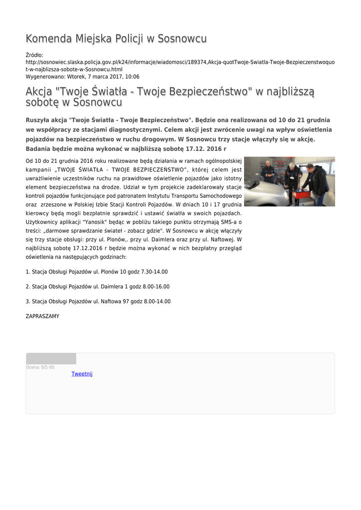 Komenda Miejska Policji w Sosnowcu Źródło: http://sosnowiec.slaska.policja.gov.pl/k24/informacje/wiadomosci/189374,Akcja-quotTwoje-Swiatla-Twoje-Bezpieczenstwoquo t-w-najblizsza-sobote-w-Sosnowcu.html Wygenerowano: Wtorek, 7 marca 2017, 10:06 Akcja "Twoje Światła - Twoje Bezpieczeństwo" w najbliższą sobotę w Sosnowcu Ruszyła akcja "Twoje Światła - Twoje Bezpieczeństwo". Będzie ona realizowana od 10 do 21 grudnia we współpracy ze stacjami diagnostycznymi. Celem akcji jest zwrócenie uwagi na wpływ oświetlenia pojazdów na bezpieczeństwo w ruchu drogowym. W Sosnowcu trzy stacje włączyły się w akcję. Badania będzie można wykonać w najbliższą sobotę 17.12. 2016 r Od 10 do 21 grudnia 2016 roku realizowane będą działania w ramach ogólnopolskiej kampanii „TWOJE ŚWIATŁA - TWOJE BEZPIECZEŃSTWO”, której celem jest uwrażliwienie uczestników ruchu na prawidłowe oświetlenie pojazdów jako istotny element bezpieczeństwa na drodze. Udział w tym projekcie zadeklarowały stacje kontroli pojazdów funkcjonujące pod patronatem Instytutu Transportu Samochodowego oraz zrzeszone w Polskiej Izbie Stacji Kontroli Pojazdów. W dniach 10 i 17 grudnia kierowcy będą mogli bezpłatnie sprawdzić i ustawić światła w swoich pojazdach. Użytkownicy aplikacji "Yanosik" będąc w pobliżu takiego punktu otrzymają SMS-a o treści: „darmowe sprawdzanie świateł - zobacz gdzie". W Sosnowcu w akcję włączyły się trzy stacje obsługi: przy ul. Plonów,. przy ul. Daimlera oraz przy ul. Naftowej. W najbliższą sobotę 17.12.2016 r będzie można wykonać w nich bezpłatny przegląd oświetlenia na następujących godzinach: 1. Stacja Obsługi Pojazdów ul. Plonów 10 godz 7.30-14.00 2. Stacja Obsługi Pojazdów ul. Daimlera 1 godz 8.00-16.00 3. Stacja Obsługi Pojazdów ul. Naftowa 97 godz 8.00-14.00 ZAPRASZAMY Ocena: 0/5 (0) Tweetnij