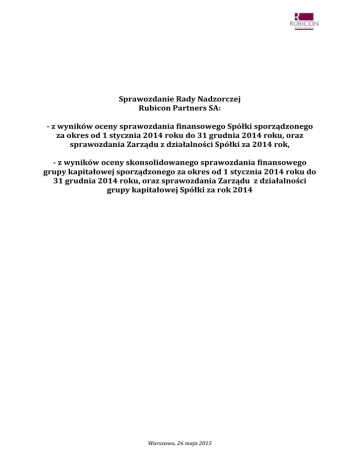 Sprawozdanie Rady Nadzorczej Rubicon Partners SA: - z wyników oceny sprawozdania finansowego Spółki sporządzonego za okres od 1 stycznia 2014 roku do 31 grudnia 2014 roku, oraz sprawozdania Zarządu z działalności Spółki za 2014 rok, - z wyników oceny skonsolidowanego sprawozdania finansowego grupy kapitałowej sporządzonego za okres od 1 stycznia 2014 roku do 31 grudnia 2014 roku, oraz sprawozdania Zarządu z działalności grupy kapitałowej Spółki za rok 2014 Warszawa, 26 maja 2015 Sprawozdanie Rady Nadzorczej z wyników oceny sprawozdania jednostkowego i skonsolidowanego spółki Rubicon Partners SA za 2014 rok ____________________________________________________________________________________________________ I. Na podstawie Art. 382 § 3 Kodeksu Spółek Handlowych oraz w związku z postanowieniami art. 24.2 lit. a, b, c, d Statutu Spółki – Rada Nadzorcza dokonała analizy sporządzonego i zbadanego przez biegłego rewidenta sprawozdania finansowego Spółki sporządzonego za okres od 1 stycznia 2014 roku do 31 grudnia 2014 roku składającego się z : 1. sprawozdania z sytuacji finansowej sporządzonego na dzień 31 grudnia 2014 roku, które po stronie aktywów i pasywów wykazuje sumę 59 990 tys. zł; 2. skróconego jednostkowego sprawozdania z zysków lub strat i innych całkowitych dochodów za okres od 1 stycznia 2014 do dnia 31 grudnia 2014 roku, wykazującego stratę netto w kwocie 16 972 707,66 zł oraz dochody całkowite ogółem w wysokości minus 16 973 tys. zł; 3. sprawozdania ze zmian w kapitale własnym za rok obrotowy od dnia 1 stycznia 2014 roku do dnia 31 grudnia 2014 roku, wykazującego zmniejszenie kapitału własnego o kwotę 16 971 tys. zł; 4. sprawozdania z przepływów pieniężnych za rok obrotowy od dnia 1 stycznia 2014 roku do dnia 31 grudnia 2014 roku, wykazującego zwiększenie stanu środków pieniężnych netto o kwotę 101 tys. zł; 5. informacji dodatkowej o przyjętych zasadach rachunkowości oraz dodatkowych informacji i objaśnień. Rada Nadzorcza zapoznała się ponadto z raportem i opinią WBS Audyt Sp. z o.o. podpisaną przez biegłego rewidenta Pana Andrzeja Pulut, który potwierdził, iż sprawozdanie finansowe we wszystkich istotnych aspektach: a) zostało sporządzone zgodnie z Międzynarodowymi Standardami Rachunkowości, Międzynarodowymi Standardami Sprawozdawczości Finansowej oraz związanymi z nimi interpretacjami ogłoszonymi w formie rozporządzeń Komisji Europejskiej, a w zakresie nieuregulowanym w tych standardach – stosownie do wymogów ustawy o rachunkowości i wydanych na jej podstawie przepisów wykonawczych oraz na podstawie prawidłowo prowadzonych ksiąg rachunkowych; b) jest zgodne z wpływającymi na treść sprawozdania finansowego przepisami prawa i postanowieniami Statutu Spółki; c) przedstawia rzetelnie i jasno wszystkie informacje istotne dla oceny sytuacji majątkowej i finansowej Spółki na dzień 31 grudnia 2014 roku, jak też jej wyniku finansowego za rok obrotowy od 1 stycznia 2014 roku do 31 grudnia 2014 roku. Ponadto, zgodnie z opinią biegłego rewidenta, Sprawozdanie z działalności Spółki jest kompletne, zgodne z wymogami art. 49 ust. 2 ustawy o rachunkowości oraz rozporządzenia Ministra Finansów 19 lutego 2009 roku w sprawie informacji bieżących i okresowych przekazywanych przez emitentów papierów wartościowych oraz warunków uznawania za równoważne informacji wymaganych przepisami prawa państwa nie będącego państwem członkowskim (Dz. U. z 2009 r. nr 33 poz. 259, z późniejszymi zmianami), a zawarte w nim informacje, pochodzące ze zbadanego sprawozdania finansowego, są z nim zgodne. Strona 2 z 6 Sprawozdanie Rady Nadzorczej z wyników oceny sprawozdania jednostkowego i skonsolidowanego spółki Rubicon Partners SA za 2014 rok ____________________________________________________________________________________________________ 1. Sprawozdanie z sytuacji finansowej Sprawozdanie z sytuacji finansowej na 31 grudnia 2014 r. wykazuje aktywa netto w wysokości 27 363 tys. zł. W roku 2014 Spółka poniosła stratę w wysokości 16 973 tys. zł. 2. Sprawozdanie z przepływów środków pieniężnych W okresie sprawozdawczym przepływy pieniężne z działalności operacyjnej były dodatnie i wyniosły 2 681 tys. zł. Wpływy z działalności finansowej wyniosły 3 595 tys. zł, w tym 3 593 tys. zł z tytułu kredytu i pożyczek oraz 2 tys. zł z tytułu wydania udziałów (emisji akcji) i innych instrumentów kapitałowych oraz dopłat do kapitału. Natomiast wydatki z działalności finansowej wynosiły 6 175 tys. zł, obejmowały spłatę kredytu i pożyczek o wartości 5 579 tys. zł oraz z tytułu odsetek w wysokości 596 tys. zł. 3. P o r t f e l i n w e s t y c y j n y Na 31 grudnia 2014 roku wartość portfela inwestycyjnego wynosiła 51 073 tys. zł. Spółka była właścicielem akcji/udziałów w 3 podmiotach zależnych, w jednym podmiocie współkontrolowanym, w 3 podmiotach stowarzyszonych i w 7 podmiotach mniejszościowych. Wartość bilansowa w tys. zł Portfel inwestycyjny 3 spółki zależne 3 spółki stowarzyszone i 1 współkontrolowana 7 spółek mniejszościowych Obligacje Miraculum SA wraz z odsetkami Pozostałe Razem wartość bilansowa: w% 30 916 60,53% 9 395 18,40% 3 031 5,93% 7731 15,14% 0 0,00% 51 073 100% 4. I n w e s t y c j e i s p r z e d a ż e w 2 0 1 4 r o k u W 2014 r , Spółka dokonała inwestycji na łączną kwotę 26 366 tys. zł w tym: - nabycie akcji/udziałów w jednostkach zależnych – 5 209 tys. zł, - inwestycje w akcje/udziały spółek stowarzyszonych – 7 400 tys. zł, - zakup akcji/udziałów w jednostkach mniejszościowych - głównie transakcje na giełdzie papierów wartościowych – 13 757 tys. zł, W roku 2014 Spółka dokonała sprzedaży składników portfela o wartości bilansowej wynoszącej łącznie 22 545 tys. zł, w tym: - sprzedaży akcji/udziałów w jednostkach zależnych – 100 tys. zł, - sprzeda
