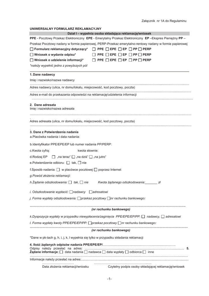 Załącznik nr 1A do Regulaminu UNIWERSALNY FORMULARZ REKLAMACYJNY Dział I – wypełnia osoba składająca reklamację/wniosek PPE - Pocztowy Przekaz Elektroniczny EPE - Emerytalny Przekaz Elektroniczny EP –Ekspres Pieniężny PP – Przekaz Pocztowy nadany w formie papierowej, PERP-Przekaz emerytalno-rentowy nadany w formie papierowej Formularz reklamacyjny dotyczący* PPE EPE EP PP PERP Wniosek o wydanie odpisu* PPE EPE EP PP PERP Wniosek o udzielenie informacji* PPE EPE EP PP PERP *należy wypełnić jedno z powyższych pól 1. Dane nadawcy Imię i nazwisko/nazwa nadawcy …………...……………………………………..…………………………………..............................................………........ Adres nadawcy (ulica, nr domu/lokalu, miejscowość, kod pocztowy, poczta) ….………………………………………………………….................................................................................................... Adres e-mail do przekazania odpowiedzi na reklamację/udzielenia informacji ….………………………………………………………….................................................................................................... 2. Dane adresata Imię i nazwisko/nazwa adresata ........................................................................................................................................................................................ . Adres adresata (ulica, nr domu/lokalu, miejscowość, kod pocztowy, poczta) ........................................................................................................................................................................................ . 3. Dane z Potwierdzenia nadania a.Placówka nadania i data nadania: b.Identyfikator PPE/EPE/EP lub numer nadania PP/PERP: c.Kwota cyfrą: d.Rodzaj EP kwota słownie: „na teraz” e.Potwierdzenie odbioru: f.Sposób nadania: „na dziś” tak, „na jutro” nie w placówce pocztowej poprzez Internet g.Powód złożenia reklamacji: h.Żądanie odszkodowania: tak, i. Odszkodowanie wypłacić: nadawcy j. Forma wypłaty odszkodowania: nie Kwota żądanego odszkodowania:_______ zł adresatowi przekaz pocztowy nr rachunku bankowego: …………………………………………………………………………………………………………………………………. (nr rachunku bankowego) k.Dyspozycja wypłaty w przypadku niewypłacenia/zaginięcia PPE/EPE/EP/PP: nadawcy, adresatowi l. Forma wypłaty kwoty PPE/EPE/EP/PP: przekaz pocztowy nr rachunku bankowego: …………………………………………………………………………………………………………………………………… (nr rachunku bankowego) *Dane w pk-tach g, h, i, j, k, l wypełnia się tylko w przypadku składania reklamacji 4. Ilość żądanych odpisów nadania PPE/EPE/EP/................................................................................... Odpisy należy przesłać na adres: ................................................................................................................. 5. Żądane informacje; data nadania nadawca data wypłaty odbiorca inne .................................................................................................................................................................................... Informacje należy przesłać na adres:.......................................................................................................................... ………………………… .......…………………….………………....... Data złożenia reklamacji/wniosku Czytelny podpis osoby składającej reklamację/wniosek -1- Dział II – wypełnia placówka pocztowa przyjmująca reklamacje/wniosek 1.Potwierdzam zgodność danych umieszczonych na formularzu z danymi zawartymi na oryginale potwierdzenia nadania PPE/EPE/EP/PP/PERP 2.Potwierdzam, że formularz został złożony przez osobę uprawnioną do złożenia reklamacji/wniosku. 3.Opłatę za wydanie odpisu/udzielenie informacji: Pobrano w wysokości:.................................. Nie pobrano …......................................................................................... Odcisk pieczątki firmowej Urzędu Odcisk datownika przyjmującego formularz/wniosek Data oraz imię i nazwisko pracownika Formularz został zarejestrowany i uzyskał numer: ………………………………………………................................... Nazwa i adres jednostki rozpatrującej reklamację: .................................................................................................... Dział III – wypełnia COF Pozycja z rejestru COF 1.Status PPE/EPE/EP/PP/PERP:................................................................................................................................... ..................................................................................................................................................................................... 2. Urząd wypłaty, data wypłaty:................................................................................................................................... .................................................................................................................................................................................... 3. Załączniki do formularza:......................................................................................................................................... ..................................................................................................................................................................................... Odcisk pieczątki firmowej COF Data oraz imię i nazwisko pracownika COF Dział IV – wypełnia oddawcza/nadawcza placówka pocztowa Pozycja z rejestru placówki oddawczej/nadawczej 1.Data wypła