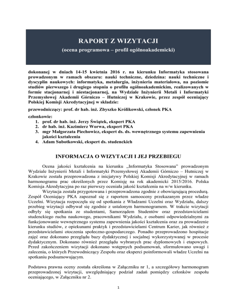 RAPORT Z WIZYTACJI (ocena programowa – profil ogólnoakademicki) dokonanej w dniach 14-15 kwietnia 2016 r. na kierunku Informatyka stosowana prowadzonym w ramach obszaru: nauki techniczne, dziedzina: nauki techniczne i dyscyplin naukowych: informatyka, metalurgia, inżynieria materiałowa, na poziomie studiów pierwszego i drugiego stopnia o profilu ogólnoakademickim, realizowanych w formie stacjonarnej i niestacjonarnej, na Wydziale Inżynierii Metali i Informatyki Przemysłowej Akademii Górniczo – Hutniczej w Krakowie, przez zespół oceniający Polskiej Komisji Akredytacyjnej w składzie: przewodniczący: prof. dr hab. inż. Zbyszko Królikowski, członek PKA członkowie: 1. prof. dr hab. inż. Jerzy Świątek, ekspert PKA 2. dr hab. inż. Kazimierz Worwa, ekspert PKA 3. mgr Małgorzata Piechowicz, ekspert ds. ds. wewnętrznego systemu zapewnienia jakości kształcenia 4. Adam Subotkowski, ekspert ds. studenckich INFORMACJA O WIZYTACJI I JEJ PRZEBIEGU Ocena jakości kształcenia na kierunku „Informatyka Stosowana” prowadzonym Wydziale Inżynierii Metali i Informatyki Przemysłowej Akademii Górniczo – Hutniczej w Krakowie została przeprowadzona z inicjatywy Polskiej Komisji Akredytacyjnej w ramach harmonogramu prac określonych przez Komisję na rok akademicki 2015/2016. Polska Komisja Akredytacyjna po raz pierwszy oceniała jakość kształcenia na w/w kierunku. Wizytacja została przygotowana i przeprowadzona zgodnie z obowiązującą procedurą. Zespół Oceniający PKA zapoznał się z raportem samooceny przekazanym przez władze Uczelni. Wizytacja rozpoczęła się od spotkania z Władzami Uczelni oraz Wydziału, dalszy przebieg wizytacji odbywał się zgodnie z ustalonym harmonogramem. W trakcie wizytacji odbyły się spotkania ze studentami, Samorządem Studentów oraz przedstawicielami studenckiego ruchu naukowego, pracownikami Wydziału, z osobami odpowiedzialnymi za funkcjonowanie wewnętrznego systemu zapewnienia jakości kształcenia oraz za prowadzenie kierunku studiów, z opiekunami praktyk i przedstawicielami Centrum Karier, jak również z przedstawicielami otoczenia społeczno-gospodarczego. Ponadto przeprowadzono hospitacje zajęć oraz dokonano przeglądu bazy dydaktycznej i socjalnej wykorzystywanej w procesie dydaktycznym. Dokonano również przeglądu wybranych prac dyplomowych i etapowych. Przed zakończeniem wizytacji dokonano wstępnych podsumowań, sformułowano uwagi i zalecenia, o których Przewodniczący Zespołu oraz eksperci poinformowali władze Uczelni na spotkaniu podsumowującym. Podstawa prawna oceny została określona w Załączniku nr 1, a szczegółowy harmonogram przeprowadzonej wizytacji, uwzględniający podział zadań pomiędzy członków zespołu oceniającego, w Załączniku nr 2. 1 OCENA SPEŁNIENIA KRYTERIÓW OCENY PROGRAMOWEJ DLA KIERUNKÓW STUDIÓW O PROFILU OGÓLNOAKADEMICKIM Ocena końcowa spełnienia kryterium Kryterium oceny wyróżniająco 1. Jednostka sformułowała koncepcję kształcenia i realizuje na ocenianym kierunku studiów program kształcenia umożliwiający osiągnięcie zakładanych efektów kształcenia 2. Liczba i jakość kadry naukowodydaktycznej oraz prowadzone w jednostce badania naukowe1 zapewniają realizację programu kształcenia na ocenianym kierunku oraz osiągnięcie przez studentów zakładanych efektów kształcenia 3. Współpraca z otoczeniem społecznym, gospodarczym lub kulturalnym w procesie kształcenia 4. Jednostka dysponuje infrastrukturą dydaktyczną i naukową umożliwiającą realizację programu kształcenia o profilu ogólnokademickim i osiągnięcie przez studentów zakładanych efektów kształcenia, oraz prowadzenie badań naukowych 5. Jednostka zapewnia studentom wsparcie w procesie uczenia się, prowadzenia badań i wchodzenia na rynek pracy 6. W jednostce działa skuteczny wewnętrzny system zapewniania jakości kształcenia zorientowany na ocenę realizacji efektów kształcenia i doskonalenia programu kształcenia oraz podniesienie jakości na ocenianym kierunku studiów w pełni znacząco częściowo niedostatecznie X X X X X X 1 Określenia: obszar wiedzy, dziedzina nauki i dyscyplina naukowa, dorobek naukowy, osiągnięcia naukowe, stopień i tytuł naukowy oznaczają odpowiednio: obszar sztuki, dziedziny sztuki i dyscypliny artystyczne, dorobek artystyczny, osiągnięcia artystyczne oraz stopień i tytuł w zakresie sztuki. 2 Jeżeli argumenty przedstawione w odpowiedzi na raport z wizytacji lub wniosku o ponowne rozpatrzenie sprawy będą uzasadniały zmianę uprzednio sformułowanych ocen, raport powinien zostać uzupełniony. Należy, w odniesieniu do każdego z kryteriów, w obrębie którego ocena została zmieniona, wskazać dokumenty, przedstawić dodatkowe informacje i syntetyczne wyjaśnienia przyczyn, które spowodowały zmianę, a ostateczną ocenę umieścić w tabeli nr 1. Wydział Inżynierii Metali i Informatyki Przemysłowej Akademii Górniczo-Hutniczej w Krakowie w po otrzymaniu raportu z wizytacji przedstawił na niego odpowiedź z dnia 27 września 2016 roku (pismo WIMiIP-b 121/16). Wydział ustosunkował się do uwag zawartych w raporcie, przyjął zalecenia oraz przedstawił dodatkowe informacje dotyczące jakości kształcenia. Przedstawiona odpowiedź pozwoliła dokonać zmiany oceny spełnienia kryterium jakościowego: „Współpraca z otoczeniem społecznym, gospodarczym lub kulturalnym w procesie kształcenia”. Po zapoznaniu się z wyjaśnieniami zawartymi w piśmie Dziekana Wydziału Inżynierii Metali i Informatyki Przemysłowej dr hab. inż. Tadeusza Telejko z dnia 27.09.2016 r., Zespół Oceniający (ZO) stwierdził, co następuje: 1. W kwestii uwagi dotyczącej naruszenia zasady równych szans przy egzaminie wstępnym na studia II stopnia ZO przyjął wyjaśnienia przytoczone przez Dziekana Wydziału Inżynierii Metali i Informatyki Przemysłowej, wycofał sformułowane w podsumowaniu kryterium 1 zalecenia, stwierdzając jednocze