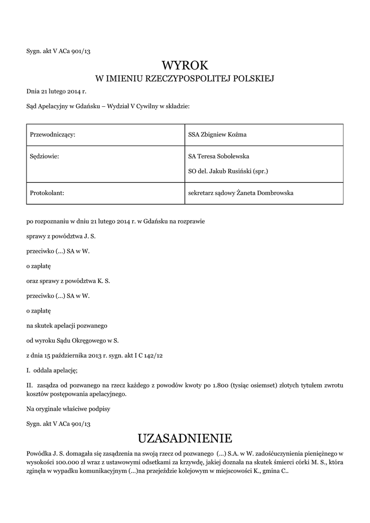 Sygn. akt V ACa 901/13 WYROK W IMIENIU RZECZYPOSPOLITEJ POLSKIEJ Dnia 21 lutego 2014 r. Sąd Apelacyjny w Gdańsku – Wydział V Cywilny w składzie: Przewodniczący: SSA Zbigniew Koźma Sędziowie: SA Teresa Sobolewska SO del. Jakub Rusiński (spr.) Protokolant: sekretarz sądowy Żaneta Dombrowska po rozpoznaniu w dniu 21 lutego 2014 r. w Gdańsku na rozprawie sprawy z powództwa J. S. przeciwko (...) SA w W. o zapłatę oraz sprawy z powództwa K. S. przeciwko (...) SA w W. o zapłatę na skutek apelacji pozwanego od wyroku Sądu Okręgowego w S. z dnia 15 października 2013 r. sygn. akt I C 142/12 I. oddala apelację; II. zasądza od pozwanego na rzecz każdego z powodów kwoty po 1.800 (tysiąc osiemset) złotych tytułem zwrotu kosztów postępowania apelacyjnego. Na oryginale właściwe podpisy Sygn. akt V ACa 901/13 UZASADNIENIE Powódka J. S. domagała się zasądzenia na swoją rzecz od pozwanego (...) S.A. w W. zadośćuczynienia pieniężnego w wysokości 100.000 zł wraz z ustawowymi odsetkami za krzywdę, jakiej doznała na skutek śmierci córki M. S., która zginęła w wypadku komunikacyjnym (...)na przejeździe kolejowym w miejscowości K., gmina C.. Powód K. S. – ojciec M. S. – osobnym pozwem domagał się z tytułu tego samego zdarzenia zasądzenia na swoją rzecz od pozwanego (...) S.A. w W. zadośćuczynienia pieniężnego w wysokości 90.000 zł wraz z ustawowymi odsetkami. Wymienione sprawy zostały połączone przez Sąd Okręgowy w S. do łącznego rozpoznania i rozstrzygnięcia. Pozwany (...) S.A. w W. w odpowiedzi na pozew wniósł o oddalenie powództwa zarówno J. S., jak i K. S.. W uzasadnieniu swojego stanowiska pozwany podniósł, iż w myśl regulacji zawartej w art. 34 ustawy o ubezpieczeniach obowiązkowych (...) i (...) umowa ubezpieczenia OC posiadacza pojazdu mechanicznego (sprawcy wypadku) nie obejmuje odpowiedzialności cywilnej z tytułu naruszenia dóbr osobistych przez sprawcę wypadku. W dniu 28 grudnia 2012 r. doszło do przejęcia spółki (...) S.A. w W. przez (...)S.A. w W.. Spółka przejmująca z dniem połączenia wstąpiła we wszystkie prawa i obowiązki spółki przejmowanej. Wyrokiem z dnia 15 października 2013 r. Sąd Okręgowy w S. zasądził od pozwanego na rzecz powódki J. S. kwotę 80.000 zł z ustawowymi odsetkami od dnia 2 marca 2012 r. (pkt I.1) oddalił powództwo w pozostałej części (pkt I.2) i pozostawił rozstrzygnięcie o kosztach referendarzowi sądowemu z ustaleniem, że powódka wygrała w 80% (pkt I.3) oraz zasądził od pozwanego na rzecz K. S. kwotę 60.000 zł z ustawowymi odsetkami od dnia 18 czerwca 2012 r. (pkt II.1), oddalił powództwo w pozostałej części (pkt II.2) i pozostawił rozstrzygnięcie o kosztach referendarzowi sądowemu z ustaleniem, że powód wygrał w 67% (pkt II.3). Swoje rozstrzygniecie oparł na ustaleniach i rozważaniach prawnych przedstawionych w uzasadnieniu wyroku. Wynika z nich, że córka powodów – M. S. – (...)zginęła w wypadku komunikacyjnym, do którego doszło (...)na przejeździe kolejowym w miejscowości K., gmina C.. Kierujący samochodem osobowym D. S., na przejeździe kolejowym nie ustąpił pierwszeństwa przejazdu składowi pociągu osobowego i doprowadził do zderzenia, w następstwie którego śmierć na miejscu ponieśli kierowca samochodu oraz jego pasażerka, którą była M. S.. Prokurator Rejonowy w C. w sprawie (...)umorzył postępowanie z uwagi na śmierć sprawcy wypadku – D. S.. W dniu zdarzenia pojazd, którym poruszał się sprawca wypadku, posiadał ważne ubezpieczenie OC w (...) S.A. w W.. Do wypadku doszło na przejeździe kolejowym oddalonym około 300 m od miejsca zamieszkania M. S., w kilka chwil po jej wyjeździe z domu wraz z kolegą jego samochodem (...). Do wypadku doszło nieomal na oczach rodziny. W domu matka (powódka) słyszała gwizd lokomotywy i odgłosy gwałtownego hamowania pociągu. Biegła w stronę wypadku – została zatrzymana przez sąsiadkę. (...) Ojciec (powód) widział, jak skład pociągu ciągnął za sobą samochód, którym jechała córka (M. S.). Zasłabł – z miejsca zdarzenia został zabrany do szpitala karetką Pogotowia. W chwili krytycznego zdarzenia (...). M. S. przez całe swoje życie mieszkała wraz z rodziną – rodzicami (powodami w tej sprawie) J. S. i K. S. oraz z rodzeństwem – bratem S., siostrą A., bratem P., siostrą D. i siostrą B.. W chwili zdarzenia rodzeństwo poszkodowanej miało odpowiednio: (...) W czasie, kiedy doszło do wypadku, powódka J. S. nie pracowała – zajmowała się prowadzeniem domu. Powód K. S. pracował w(...) – wrócił do domu na kilka dni przed tym zdarzeniem. Rodzina wszystkie święta zawsze spędzała i nadal spędza razem. Do dnia dzisiejszego przy stole wigilijnym jest stawiany talerzyk dla M.. Najtrudniejsze dla powodów jest to, że do tragedii doszło niedaleko domu i za każdym razem, kiedy przechodzą przez przejazd kolejowy, przypomina im się wypadek i śmierć córki. Na miejscu zdarzenia zaraz po wypadku powód postawił pamiątkowy krzyż, niedawno ten krzyż wymienił – wykonał ze stali nierdzewnej, aby był trwały. (...) Śmierć córki, zarówno dla powódki, jak i powoda, była bardzo silnym przeżyciem traumatycznym. Do chwili obecnej rodzice przeżywają poczucie straty, które nasila się w okresie świąt Bożego Narodzenia. W rodzinie powodów były i są bardzo silne więzi emocjonalne między rodzicami i dziećmi. Opierając się na opinii biegłego(...)Sąd Okręgowy stwierdził, że tragiczna śmierć córki M. S. (...) wywołała u (...). Czynnikami, które spotęgowały emocjonalne obciążenie, były niewątpliwie: moment wypadku (...) oraz fakt, że M. przed tym wypadkiem była (...), radosna, pełna nadziei na przyszłość i taka została przez matkę zapamiętana. (...). (...) Według przyjętej przez Sąd meriti opinii biegłego (...) Tragiczna śmierć córki M. S. wywołała u powoda K. S. (...). Bezpo