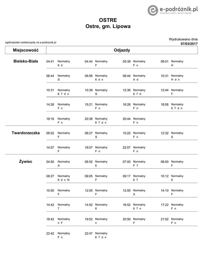 OSTRE Ostre, gm. Lipowa Wydrukowano dnia 07/03/2017 ogólnopolski rozkład jazdy na e-podroznik.pl Miejscowość Bielsko-Biała Odjazdy 04:41 06:44 10:31 14:26 18:16 Twardorzeczka 06:52 14:57 Żywiec 04:50 08:27 10:50 14:42 18:42 22:42 Normalny 6 d 04:44 Normalny Normalny S 06:56 Normalny Normalny 6 7 d n 10:39 Normalny Normalny F n 15:21 Normalny Normalny F n 20:36 Normalny Normalny F 08:27 Normalny Normalny F 16:07 Normalny Normalny A 06:52 Normalny Normalny 6 d n N 09:05 Normalny Normalny F 12:05 Normalny 12:50 Normalny 14:10 Normalny F A F Normalny 7 14:52 Normalny 16:52 Normalny 17:22 Normalny Normalny n F 19:52 Normalny 20:50 Normalny n F Normalny F n 22:47 Normalny F 6 d n S F n 6 7 d n S F n 6 F 6 6 7 d n 05:39 Normalny F n 08:44 Normalny A d 12:36 Normalny 6 7 d 16:26 Normalny F n 06:01 Normalny H 10:31 Normalny H d n 12:44 Normalny F 18:06 Normalny 6 7 d n 20:44 Normalny F n 10:22 Normalny F n 12:32 Normalny S 22:57 Normalny F n 07:00 Normalny F 7 09:17 Normalny 6 7 6 7 n 08:00 Normalny F 10:12 Normalny 6 F n 21:02 Normalny F n Oznaczenia 6 kursuje w soboty 7 kursuje w niedziele A nie kursuje w niedziele i święta F kursuje od poniedziałku do piątku w dni robocze H kursuje w okresie wakacji i ferii szkolnych w dni robocze N nie kursuje 25 i 26 grudzień oraz w Święta Wielkanocne S Kursuje w dni nauki szkolnej d nie kursuje w Wielką Sobotę n NIE KURSUJE 24 i 31 XII ORAZ W WIELKĄ SOBOTĘ