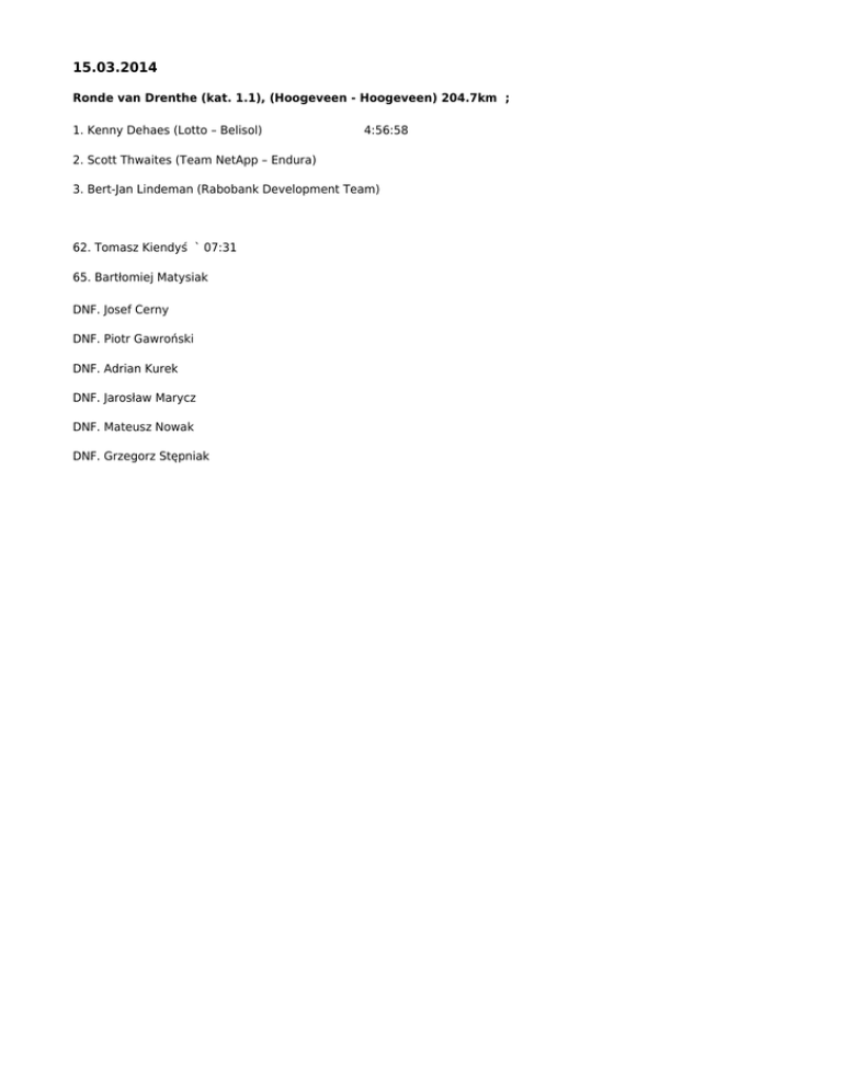15.03.2014 Ronde van Drenthe (kat. 1.1), (Hoogeveen - Hoogeveen) 204.7km ; 1. Kenny Dehaes (Lotto – Belisol) 4:56:58 2. Scott Thwaites (Team NetApp – Endura) 3. Bert-Jan Lindeman (Rabobank Development Team) 62. Tomasz Kiendyś ` 07:31 65. Bartłomiej Matysiak DNF. Josef Cerny DNF. Piotr Gawroński DNF. Adrian Kurek DNF. Jarosław Marycz DNF. Mateusz Nowak DNF. Grzegorz Stępniak