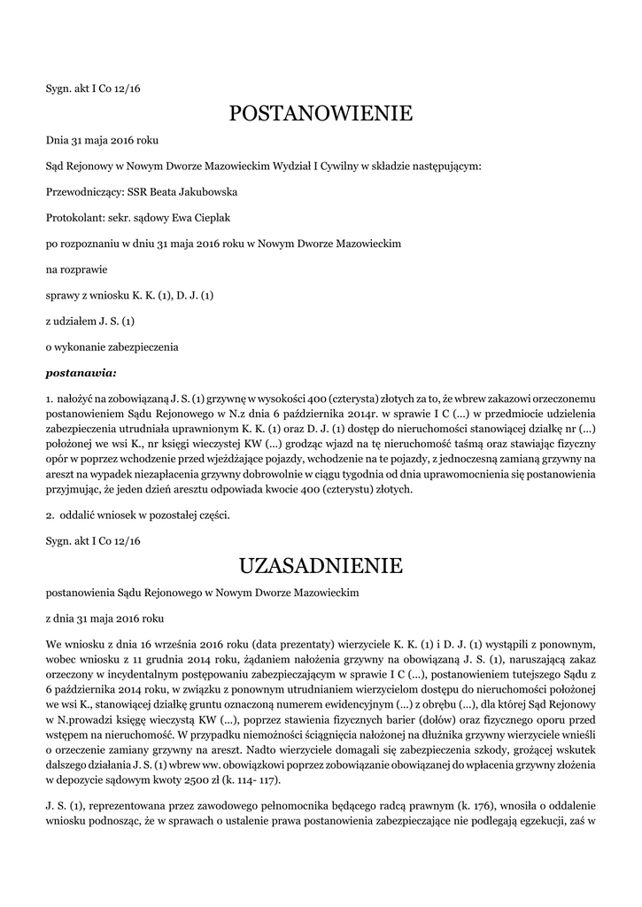 Sygn. akt I Co 12/16 POSTANOWIENIE Dnia 31 maja 2016 roku Sąd Rejonowy w Nowym Dworze Mazowieckim Wydział I Cywilny w składzie następującym: Przewodniczący: SSR Beata Jakubowska Protokolant: sekr. sądowy Ewa Cieplak po rozpoznaniu w dniu 31 maja 2016 roku w Nowym Dworze Mazowieckim na rozprawie sprawy z wniosku K. K. (1), D. J. (1) z udziałem J. S. (1) o wykonanie zabezpieczenia postanawia: 1. nałożyć na zobowiązaną J. S. (1) grzywnę w wysokości 400 (czterysta) złotych za to, że wbrew zakazowi orzeczonemu postanowieniem Sądu Rejonowego w N.z dnia 6 października 2014r. w sprawie I C (...) w przedmiocie udzielenia zabezpieczenia utrudniała uprawnionym K. K. (1) oraz D. J. (1) dostęp do nieruchomości stanowiącej działkę nr (...) położonej we wsi K., nr księgi wieczystej KW (...) grodząc wjazd na tę nieruchomość taśmą oraz stawiając fizyczny opór w poprzez wchodzenie przed wjeżdżające pojazdy, wchodzenie na te pojazdy, z jednoczesną zamianą grzywny na areszt na wypadek niezapłacenia grzywny dobrowolnie w ciągu tygodnia od dnia uprawomocnienia się postanowienia przyjmując, że jeden dzień aresztu odpowiada kwocie 400 (czterystu) złotych. 2. oddalić wniosek w pozostałej części. Sygn. akt I Co 12/16 UZASADNIENIE postanowienia Sądu Rejonowego w Nowym Dworze Mazowieckim z dnia 31 maja 2016 roku We wniosku z dnia 16 września 2016 roku (data prezentaty) wierzyciele K. K. (1) i D. J. (1) wystąpili z ponownym, wobec wniosku z 11 grudnia 2014 roku, żądaniem nałożenia grzywny na obowiązaną J. S. (1), naruszającą zakaz orzeczony w incydentalnym postępowaniu zabezpieczającym w sprawie I C (...), postanowieniem tutejszego Sądu z 6 października 2014 roku, w związku z ponownym utrudnianiem wierzycielom dostępu do nieruchomości położonej we wsi K., stanowiącej działkę gruntu oznaczoną numerem ewidencyjnym (...) z obrębu (...), dla której Sąd Rejonowy w N.prowadzi księgę wieczystą KW (...), poprzez stawienia fizycznych barier (dołów) oraz fizycznego oporu przed wstępem na nieruchomość. W przypadku niemożności ściągnięcia nałożonej na dłużnika grzywny wierzyciele wnieśli o orzeczenie zamiany grzywny na areszt. Nadto wierzyciele domagali się zabezpieczenia szkody, grożącej wskutek dalszego działania J. S. (1) wbrew ww. obowiązkowi poprzez zobowiązanie obowiązanej do wpłacenia grzywny złożenia w depozycie sądowym kwoty 2500 zł (k. 114- 117). J. S. (1), reprezentowana przez zawodowego pełnomocnika będącego radcą prawnym (k. 176), wnosiła o oddalenie wniosku podnosząc, że w sprawach o ustalenie prawa postanowienia zabezpieczające nie podlegają egzekucji, zaś w razie niepodzielenia powyższej oceny, o oddalenie w związku z tym, że obowiązana nie utrudniała dostępu na grunt sporny (k. 132- 140). Postępowanie dotyczące egzekucji obowiązku nałożonego postanowieniem w przedmiocie udzielenia zabezpieczenia, w toku którego wierzyciel może wielokrotnie zgłaszać żądanie nałożenia grzywny, toczy się do czasu jego umorzenia ex lege w trybie art. 823 kpc (tak K. Piasecki w komentarzu do art. 1051 kpc w:”Kodeks postępowania cywilnego. Komentarz do art. 730- 1088. Tom III”. Sąd ustalił i zważył, co następuje: Uprawnieni K. K. (1) i D. J. (1) są właścicielami nieruchomości położonej w K., składającej się działek o numerach ew. (...) i (...), przy czym część tej ostatniej działki ewidencyjnej to wąski pas gruntu położony między działkami zobowiązanej o numerach (...) i(...), pełniący funkcję drogi dojazdowej do rozszerzającej się nieruchomości uprawnionych (k. 53 – kopia mapy). Obowiązana jest zaś właścicielką kilku sąsiednich działek o nr ew. (...), (...) oraz nr (...),(...) (...), położonych po obu stronach gruntu działki nr (...) używanego jako wspomniana droga dojazdowa do nieruchomości uprawnionych. Uprawnieni i obowiązana do swoich działek dojeżdżają przez działkę nr (...) należącą do D., zaś J. S. (1) ma ograniczone prawo przechodu i przejazdu przez nieruchomość uprawnionych. Pomiędzy stronami toczą się równolegle dwa spory sądowe, jeden pod sygnaturą I C (...)z powództwa J. S. (1) przeciwko K. K. (1) i D. J. o ochronę naruszonego posiadania oraz drugi pod sygnaturą I C (...) z powództwa uprawnionych przeciwko J. S. (1) o ochronę własności. J. S. (1) cały czas pozostaje w przekonaniu, że opisany wąski pas działki nr (...) użytkowany jako dojazd stanowiący własność uprawnionych powinien należeć do jej działki nr (...), gdyż była pierwszym kupującym i z okazania jej nieruchomości przez sprzedającego podczas zakupu zrozumiała, że ww. sporny pas gruntu leży w granicach nabywanej nieruchomości (ze znania k. 55v, 315). Zobowiązana uważa, że uprawnieni nie mają z tego powodu prawa do spornej części gruntu. W dniu 6 października 2014 roku tutejszy Sąd wydał postanowienie w sprawie o sygn. akt I C (...), mocą którego udzielił zabezpieczenia roszczenia powodom K. K. (1) i D. J. (1) poprzez zakazanie pozwanej J. S. (1) utrudniania dostępu do nieruchomości położonej we wsi K. w gminie L., stanowiącej działkę gruntu oznaczoną numerem ewidencyjnym (...) z obrębu (...), dla której Sąd Rejonowy w N.prowadzi księgę wieczystą numer (...), w szczególności poprzez zakazanie pozwanej instalowania fizycznych barier – stawiania pojazdów, bram i ogrodzeń na terenie nieruchomości lub drodze dojazdowej. W dniu 20 listopada 2014 roku postanowienie zostało zaopatrzone w klauzulę wykonalności (k. 25- 27 tytuł zabezpieczenia). Odpis niniejszego postanowienia został doręczony J. S. (1) w dniu 27 października 2014 roku (okoliczność bezsporna). Postanowieniem z 1 kwietnia 2015 roku tutejszy Sąd w rozpoznawanej sprawie, prowadzonej wówczas pod sygnaturą I Co (...)nałożył na obowiązaną grzywnę w wysokości 400 złotych za działanie wbrew zakazowi orzeczonemu ww. postanowieniem