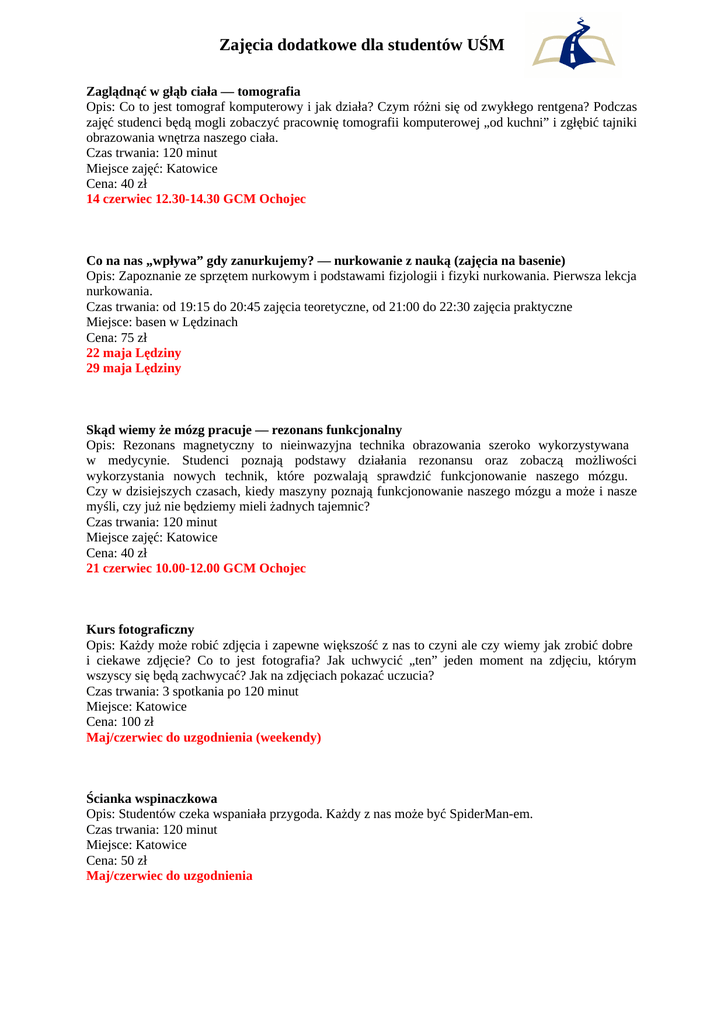 Zajęcia dodatkowe dla studentów UŚM Zaglądnąć w głąb ciała — tomografia Opis: Co to jest tomograf komputerowy i jak działa? Czym różni się od zwykłego rentgena? Podczas zajęć studenci będą mogli zobaczyć pracownię tomografii komputerowej „od kuchni” i zgłębić tajniki obrazowania wnętrza naszego ciała. Czas trwania: 120 minut Miejsce zajęć: Katowice Cena: 40 zł 14 czerwiec 12.30-14.30 GCM Ochojec Co na nas „wpływa” gdy zanurkujemy? — nurkowanie z nauką (zajęcia na basenie) Opis: Zapoznanie ze sprzętem nurkowym i podstawami fizjologii i fizyki nurkowania. Pierwsza lekcja nurkowania. Czas trwania: od 19:15 do 20:45 zajęcia teoretyczne, od 21:00 do 22:30 zajęcia praktyczne Miejsce: basen w Lędzinach Cena: 75 zł 22 maja Lędziny 29 maja Lędziny Skąd wiemy że mózg pracuje — rezonans funkcjonalny Opis: Rezonans magnetyczny to nieinwazyjna technika obrazowania szeroko wykorzystywana w medycynie. Studenci poznają podstawy działania rezonansu oraz zobaczą możliwości wykorzystania nowych technik, które pozwalają sprawdzić funkcjonowanie naszego mózgu. Czy w dzisiejszych czasach, kiedy maszyny poznają funkcjonowanie naszego mózgu a może i nasze myśli, czy już nie będziemy mieli żadnych tajemnic? Czas trwania: 120 minut Miejsce zajęć: Katowice Cena: 40 zł 21 czerwiec 10.00-12.00 GCM Ochojec Kurs fotograficzny Opis: Każdy może robić zdjęcia i zapewne większość z nas to czyni ale czy wiemy jak zrobić dobre i ciekawe zdjęcie? Co to jest fotografia? Jak uchwycić „ten” jeden moment na zdjęciu, którym wszyscy się będą zachwycać? Jak na zdjęciach pokazać uczucia? Czas trwania: 3 spotkania po 120 minut Miejsce: Katowice Cena: 100 zł Maj/czerwiec do uzgodnienia (weekendy) Ścianka wspinaczkowa Opis: Studentów czeka wspaniała przygoda. Każdy z nas może być SpiderMan-em. Czas trwania: 120 minut Miejsce: Katowice Cena: 50 zł Maj/czerwiec do uzgodnienia Zwiedzanie Centrum Informacji Naukowej i Biblioteki Akademickiej Uniwersytetu Śląskiego i Uniwersytetu Ekonomicznego w Katowicach Opis: Na zajęciach studenci poznają infrastrukturę i funkcjonowanie nowoczesnego Centrum Informacji Naukowej i Biblioteki Akademickiej. Czas trwania: 60 minut Miejsce: CINiBA, Katowice Maj/czerwiec do uzgodnienia Zwiedzanie Radia Katowice Opis: Studenci będą mieli możliwość zwiedzenia siedziby Radia a także wziąć udział w próbnym nagraniu audycji radiowej. Zobaczą jak powstaje audycja radiowa a zainteresowani będą mogli wziąć udział w prawdziwym nagraniu a nawet będą mieli szansę, pod okiem Pani Redaktor Beaty Tomanek poprowadzić audycję. Czas trwania: 60 minut Miejsce: Radio Katowice Maj/czerwiec do uzgodnienia Zapisu na zajęcia można dokonać poprzez wysłanie do 15 kwietnia na adres [email protected] wiadomości mailowej. Zajęcia będą się odbywać w maju i czerwcu. Zostaną uruchomione przy zapisie określonej liczby osób, o czym zostaniecie Państwo poinformowani po 15 kwietnia i poproszeni o uregulowanie odpłatności.