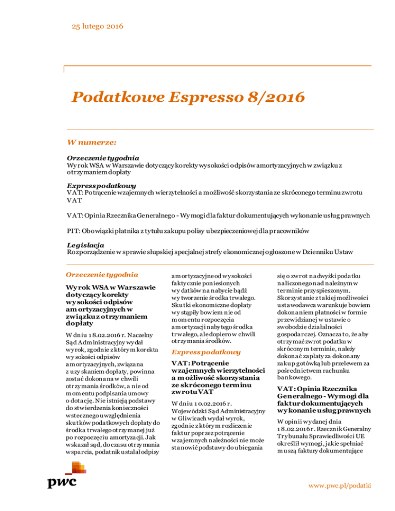 25 lutego 2016 Podatkowe Espresso 8/2016 W numerze: Orzeczenie tygodnia Wy rok WSA w Warszawie dotyczący korekty wysokości odpisów amortyzacyjnych w związku z otrzymaniem dopłaty Express podatkowy V AT: Potrącenie wzajemnych wierzytelności a możliwość skorzystania ze skróconego terminu zwrotu V AT V AT: Opinia Rzecznika Generalnego - Wy mogi dla faktur dokumentujących wykonanie usług prawnych PIT: Obowiązki płatnika z tytułu zakupu polisy ubezpieczeniowej dla pracowników Legislacja Rozporządzenie w sprawie słupskiej specjalnej strefy ekonomicznej ogłoszone w Dzienniku Ustaw Orzeczenie tygodnia Wy rok WSA w Warszawie dotyczący korekty wy sokości odpisów am ortyzacyjnych w związku z otrzymaniem dopłaty W dniu 1 8.02.2016 r. Naczelny Sąd Adm inistracyjny wydał wyrok, zgodnie z którym korekta wy sokości odpisów am ortyzacyjnych, związana z uzy skaniem dopłaty, powinna zostać dokonana w chwili otrzymania środków, a nie od m om entu podpisania umowy o dotację. Nie istnieją podstawy do stwierdzenia konieczności wstecznego uwzględnienia skutków podatkowych dopłaty do środka trwałego otrzymanej już po rozpoczęciu amortyzacji. Jak wskazał sąd, do czasu otrzymania wsparcia, podatnik ustalał odpisy am ortyzacyjne od wysokości faktycznie poniesionych wy datków na nabycie bądź wy tworzenie środka trwałego. Skutki ekonomiczne dopłaty wy stąpiły bowiem nie od m om entu rozpoczęcia am ortyzacji nabytego środka trwałego, ale dopiero w chwili otrzymania środków. Express podatkowy VAT: Potrącenie wzajemnych wierzytelności a m ożliwość skorzystania ze skróconego terminu zwrotu VAT W dniu 1 0.02.2016 r. Wojewódzki Sąd Administracyjny w Gliwicach wydał wyrok, zgodnie z którym rozliczenie faktur poprzez potrącenie wzajemnych należności nie może stanowić podstawy do ubiegania się o zwrot nadwyżki podatku naliczonego nad należnym w terminie przyspieszonym. Skorzystanie z takiej możliwości ustawodawca warunkuje bowiem dokonaniem płatności w formie przewidzianej w ustawie o swobodzie działalności gospodarczej. Oznacza to, że aby otrzymać zwrot podatku w skróconym terminie, należy dokonać zapłaty za dokonany zakup gotówką lub przelewem za pośrednictwem rachunku bankowego. VAT: Opinia Rzecznika Generalnego - Wymogi dla faktur dokumentujących wy konanie usług prawnych W opinii wydanej dnia 1 8.02.2016 r . Rzecznik Generalny Trybunału Sprawiedliwości UE określił wymogi, jakie spełniać m uszą faktury dokumentujące www.pwc.pl/podatki Podatkowe espresso 8/2016 wy konanie usług prawnych. Organ wskazał przede wszystkim, że ogólny opis „wykonanie usług prawnych” jest zgodny z prawem unijnym, chyba że prawo krajowe przewiduje odmienne zasady opodatkowania VAT dla określonych usług prawnych. Nie spełnia natomiast wymogów dy rektywy 2 006/112/WE określenie czasu wykonania usługi w formie opisu „wykonanie usług prawnych do dnia dzisiejszego” lub „wykonanie usług prawnych od określonej daty do dnia dzisiejszego”. Dodatkowo, Rzecznik Generalny zauważył, że dla skorzystania z prawa do odliczenia podatku co do zasady nie wystarczy uzupełnienie danych brakujących na fakturze informacjami, które nie wynikają z dokum entów będących elem entami samej faktury. Skorzystanie z prawa do odliczenia bez uzyskania skory gowanej faktury jest m ożliwe jedynie wtedy, gdy korekta w żaden sposób nie m oże już spełniać funkcji kontrolnej w odniesieniu do wystawcy faktury. PIT: Obowiązki płatnika z ty tułu zakupu polisy ubezpieczeniowej dla pracowników przy chód, a na pracodawcy ciążą obowiązki płatnika. Legislacja Dy rektor Izby Skarbowej w Poznaniu (w imieniu Ministra Finansów) wydał w dniu 04 .02.2016 r. interpretację indywidualną, w której uznał, że wy kupienie polisy ubezpieczeniowej w zakresie bagażu dla pracowników odby wających zagraniczną podróż służbową nie będzie generować po stronie pracowników powstania przy chodu – jest to bowiem zabezpieczenie się samego pracodawcy przed ewentualnymi, nieprzewidzianymi wydatkami związanymi ze zwrotem na rzecz pracownika wydatków na wy padek ziszczenia się określonych w umowie ubezpieczenia okoliczności. W tej sy tuacji pracodawca nie jest płatnikiem w PIT. Organ wskazał jednak, że odm iennie sytuacja kształtuje się w przypadku ubezpieczenia OC. Wówczas bowiem chronione są interesy pracownika, w związku z czym powstaje po jego stronie Rozporządzenie w sprawie słupskiej specjalnej strefy ekonomicznej ogłoszone w Dzienniku Ustaw W dniu 2 2.02.2016 r . w Dzienniku Ustaw opublikowane zostało rozporządzenie Rady Ministrów z dnia 5 lutego 2 016 r. zm ieniające rozporządzenie w sprawie słupskiej specjalnej strefy ekonomicznej. Wprowadzone zmiany dotyczą określenia i szczegółowego opisu powierzchni, granic i terenu słupskiej SSE. W efekcie zm ian w granice słupskiej strefy zostały włączone grunty o łącznej powierzchni prawie 11 ha. W wy niku zm ian powierzchnia słupskiej SSE wyniesie ponad 910 ha. Rozporządzenie wchodzi w ży cie po upływie 14 dni od dnia ogłoszenia, tj. 7 marca 2 015 r. Więcej informacji znajdą Państwo w serwisie www.taxonline.pl Porozmawiajmy dr Sławomir Krempa Partner +48 22 746 6874 [email protected] T omasz Misiak Starszy menedżer +48 502 18 4858 [email protected] Błażej Cieliński Menedżer +48 519 504 102 [email protected] Zastrzeżenie prawne: Publikacja ma jedynie charakter informacyjny i nie stanowi porady podatkowej w rozumieniu polskich przepisów, w szczególności Ustawy z dnia 5 lipca 1996 r. o doradztwie podatkowym. Nie powinni Państwo opierać swoich działań/decyzji na treści informacji zawartych w tej publikacji bez uprzedniego uzyskania profesjonalnej porady. © 2016 PricewaterhouseCoopers Sp. z o.o. Wszystkie prawa zastrzeżone. W tym dokumencie nazwa "PwC" odnosi się do PricewaterhouseCoopers Sp. z o.o., firmy wchodzącej w skład sieci Pricewaterh