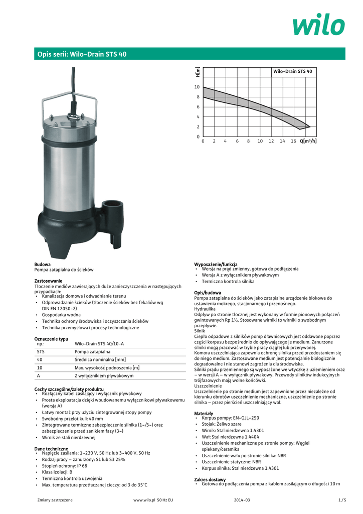 H[m] Opis serii: Wilo-Drain STS 40 Wilo-Drain STS 40 10 8 6 4 2 0 Budowa Pompa zatapialna do ścieków Zastosowanie Tłoczenie mediów zawierających duże zanieczyszczenia w następujących przypadkach: • Kanalizacja domowa i odwadnianie terenu • Odprowadzanie ścieków (tłoczenie ścieków bez fekaliów wg DIN EN 12050-2) • Gospodarka wodna • Technika ochrony środowiska i oczyszczania ścieków • Technika przemysłowa i procesy technologiczne Oznaczenie typu np.: Wilo-Drain STS 40/10-A STS Pompa zatapialna 40 Średnica nominalna [mm] 10 Max. wysokość podnoszenia [m] A Z wyłącznikiem pływakowym Cechy szczególne/zalety produktu • Rozłączny kabel zasilający i wyłącznik pływakowy • Prosta eksploatacja dzięki wbudowanemu wyłącznikowi pływakowemu (wersja A) • Łatwy montaż przy użyciu zintegrowanej stopy pompy • Swobodny przelot kuli: 40 mm • Zintegrowane termiczne zabezpieczenie silnika (1~/3~) oraz zabezpieczenie przed zanikiem fazy (3~) • Wirnik ze stali nierdzewnej Dane techniczne • Napięcie zasilania: 1~230 V, 50 Hz lub 3~400 V, 50 Hz • Rodzaj pracy – zanurzony: S1 lub S3 25% • Stopień ochrony: IP 68 • Klasa izolacji: B • Termiczna kontrola uzwojenia • Max. temperatura przetłaczanej cieczy: od 3 do 35°C Zmiany zastrzeżone www.wilo.pl 50 Hz EU 0 2 4 6 8 10 12 14 16 Q[m³/h] Wyposażenie/funkcja • Wersja na prąd zmienny, gotowa do podłączenia • Wersja A z wyłącznikiem pływakowym • Termiczna kontrola silnika Opis/budowa Pompa zatapialna do ścieków jako zatapialne urządzenie blokowe do ustawienia mokrego, stacjonarnego i przenośnego. Hydraulika Odpływ po stronie tłocznej jest wykonany w formie pionowych połączeń gwintowanych Rp 1½. Stosowane wirniki to wirniki o swobodnym przepływie. Silnik Ciepło odpadowe z silników pomp dławnicowych jest oddawane poprzez części korpusu bezpośrednio do opływającego je medium. Zanurzone silniki mogą pracować w trybie pracy ciągłej lub przerywanej. Komora uszczelniająca zapewnia ochronę silnika przed przedostaniem się do niego medium. Zastosowane medium jest potencjalnie biologicznie degradowalne i nie stanowi zagrożenia dla środowiska. Silniki prądu przemiennego są wyposażone we wtyczkę z uziemieniem oraz – w wersji A – w wyłącznik pływakowy. Przewody silników indukcyjnych trójfazowych mają wolne końcówki. Uszczelnienie Uszczelnienie po stronie medium jest zapewnione przez niezależne od kierunku obrotów uszczelnienie mechaniczne, uszczelnienie po stronie silnika – przez pierścień uszczelniający wał. Materiały • Korpus pompy: EN-GJL-250 • Stojak: Żeliwo szare • Wirnik: Stal nierdzewna 1.4301 • Wał: Stal nierdzewna 1.4404 • Uszczelnienie mechaniczne po stronie pompy: Węgiel spiekany/ceramika • Uszczelnienie wału po stronie silnika: NBR • Uszczelnienie statyczne: NBR • Korpus silnika: Stal nierdzewna 1.4301 Zakres dostawy • Gotowa do podłączenia pompa z kablem zasilającym o długości 10 m 2014-03 1/5 Opis serii: Wilo-Drain STS 40 • Długość przewodu: 10 m • Swobodny przelot kuli: 40 mm • Max. głębokość zanurzenia: 5 m • W przypadku 1~230 V z wtyczką z uziemieniem • W przypadku 3~400 V z wolną końcówką przewodu • Wersja A z zamontowanym wyłącznikiem pływakowym • Instrukcja montażu i obsługi Wyposażenie dodatkowe • Zabezpieczenie przed przepływem zwrotnym i zasuwa odcinająca • Różne odpływy ciśnieniowe i węże • Urządzenia sterujące i przekaźniki Zmiany zastrzeżone www.wilo.pl 50 Hz EU 2014-03 2/5 Charakterystyka zbiorcza: Wilo-Drain STS 40 Rodzina charakterystyk H [m] Wilo-Drain STS 40 12 10 STS 40/10 8 STS 40/8 6 4 2 0 0 2 Zmiany zastrzeżone 4 6 8 10 12 www.wilo.pl 50 Hz EU 14 16 18 Q [m³/h] 2014-03 3/5 Wyposażenie/funkcja: Wilo-Drain STS 40 Konstrukcja Urządzenie zatapialne Wirnik jednokanałowy Wirnik o przepływie swobodnym Wirnik wielokanałowy Otwarty wirnik wielokanałowy Urządzenie tnące Urządzenie zawirowujące Komora uszczelnienia Komora szczelności Uszczelnienie po stronie silnika, uszczelnienie mechaniczne Uszczelnienie po stronie silnika, pierścień uszczelniający wału Uszczelnienie po stronie medium, uszczelnienie mechaniczne Silnik prądu zmiennego Silnik indukcyjny trójfazowy Włączenie bezpośrednie Włączenie gwiazda-trójkąt Praca przetwornicy częstotliwości • − • − − − − • − − • • • • • − − Silnik suchy Silnik chłodzony olejem Silnik suchy z zamkniętym obiegiem chłodzenia • − − Zastosowanie Ustawienie mokre stacjonarne Ustawienie mokre przenośne Ustawienie suche stacjonarne Ustawienie na sucho, przenośne − • − − Wyposażenie/Funkcja Kontrola szczelności silnika Kontrola komory uszczelnienia Kontrola komory szczelności Kontrola temperatury silnika za pomocą czujnika bimetalowego Kontrola temperatury silnika za pomocą PTC Ochrona przeciwwybuchowa Wyłącznik pływakowy Skrzynka kondensatorowa przy 1~230 V Gotowe do podłączenia − − − • − − • Wersja A • zintegrowane • 1~ Materiały Korpus pompy Wirnik Korpus silnika Żeliwo szare Żeliwo szare Stal nierdzewna • = jest, - = brak, = opcjonalnie Zmiany zastrzeżone www.wilo.pl 50 Hz EU 2014-03 4/5 Lista produktów: Wilo-Drain STS 40 Typ pompy Napięcie zasilania Max. przepływ Max. wysokość podnoszenia Prąd znamionowy Znamionowa moc silnika Q / m3/h Max. głębokość zanurzenia Nr art. Hmax / m IN / A P2 / kW STS 40/8-A 1~230 V, 50 Hz 15 8 4 0,6 5 2065868 STS 40/8 1~230 V, 50 Hz 15 8 4 0,6 5 2065866 STS 40/8 3~400 V, 50 Hz 15 8 2 0,6 5 2065870 STS 40/10-A 1~230 V, 50 Hz 20 10 4 0,75 5 2065874 STS 40/10 1~230 V, 50 Hz 20 10 4 0,75 5 2065872 STS 40/10 3~400 V, 50 Hz 20 10 2 0,75 5 2065876 Zmiany zastrzeżone www.wilo.pl 50 Hz EU 2014-03 5/5