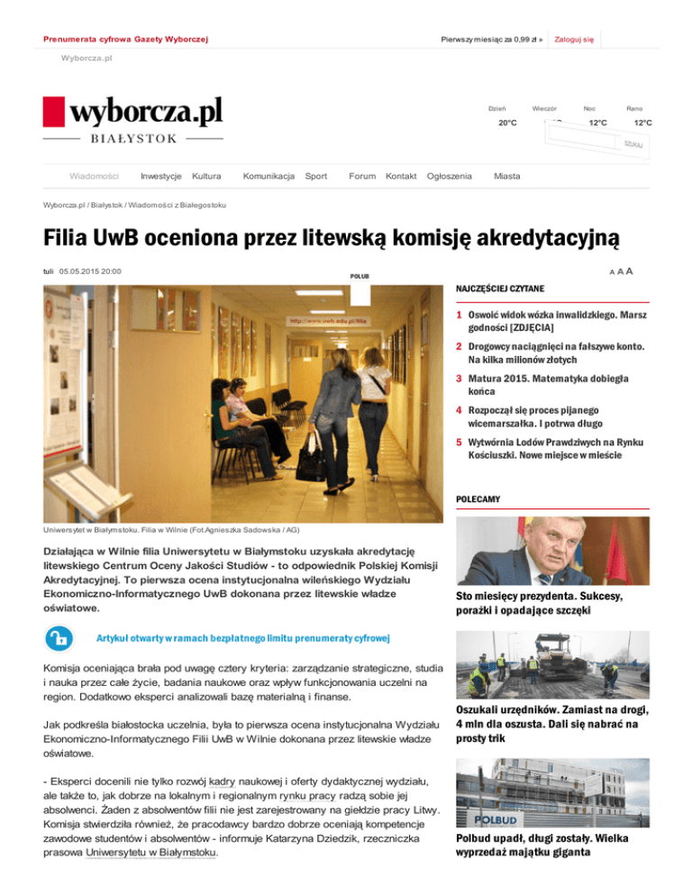 Prenumerata cyfrowa Gazety Wyborczej Pierwszy miesiąc za 0,99 zł » Zaloguj się Wyborcza.pl Dzień 20°C Wieczór 16°C Noc Rano 12°C 12°C SZUKAJ Wiadomości Inwestycje Kultura Komunikacja Sport Forum Kontakt Ogłoszenia Miasta Wyborcza.pl / Białystok / Wiadomości z Białegostoku Filia UwB oceniona przez litewską komisję akredytacyjną tuli 05.05.2015 20:00 A POLUB AA NAJCZĘŚCIEJ CZYTANE 1 Oswoić widok wózka inwalidzkiego. Marsz godności [ZDJĘCIA] 2 Drogowcy naciągnięci na fałszywe konto. Na kilka milionów złotych 3 Matura 2015. Matematyka dobiegła końca 4 Rozpoczął się proces pijanego wicemarszałka. I potrwa długo 5 Wytwórnia Lodów Prawdziwych na Rynku Kościuszki. Nowe miejsce w mieście POLECAMY Uniwersytet w Białymstoku. Filia w Wilnie (Fot.Agnieszka Sadowska / AG) Działająca w Wilnie filia Uniwersytetu w Białymstoku uzyskała akredytację litewskiego Centrum Oceny Jakości Studiów - to odpowiednik Polskiej Komisji Akredytacyjnej. To pierwsza ocena instytucjonalna wileńskiego Wydziału Ekonomiczno-Informatycznego UwB dokonana przez litewskie władze oświatowe. Sto miesięcy prezydenta. Sukcesy, porażki i opadające szczęki Artykuł otwarty w ramach bezpłatnego limitu prenumeraty cyfrowej Komisja oceniająca brała pod uwagę cztery kryteria: zarządzanie strategiczne, studia i nauka przez całe życie, badania naukowe oraz wpływ funkcjonowania uczelni na region. Dodatkowo eksperci analizowali bazę materialną i finanse. Jak podkreśla białostocka uczelnia, była to pierwsza ocena instytucjonalna Wydziału Ekonomiczno-Informatycznego Filii UwB w Wilnie dokonana przez litewskie władze oświatowe. - Eksperci docenili nie tylko rozwój kadry naukowej i oferty dydaktycznej wydziału, ale także to, jak dobrze na lokalnym i regionalnym rynku pracy radzą sobie jej absolwenci. Żaden z absolwentów filii nie jest zarejestrowany na giełdzie pracy Litwy. Komisja stwierdziła również, że pracodawcy bardzo dobrze oceniają kompetencje zawodowe studentów i absolwentów - informuje Katarzyna Dziedzik, rzeczniczka prasowa Uniwersytetu w Białymstoku. Oszukali urzędników. Zamiast na drogi, 4 mln dla oszusta. Dali się nabrać na prosty trik Polbud upadł, długi zostały. Wielka wyprzedaż majątku giganta Akredytację przeprowadzał powołany przez Centrum Oceny Jakości Studiów zespół ekspertów z Wielkiej Brytanii, Niemiec, Polski i Litwy. Jak dodaje przedstawicielka uczelni - uzyskanie pozytywnego wyniku nie było łatwe, o czym najlepiej świadczy fakt, że na 23 oceniane uniwersytety co trzeci (8) uzyskał ocenę negatywną. Zgodnie z litewskimi przepisami jeśli uczelnia po negatywnej ocenie nie nadrobi zaległości w określonym czasie - traci uprawnienia do kształcenia. Akredytacja dla wileńskiej filii uniwersytetu będzie ważna 6 lat. Dobra ocena, a siedziby wciąż brak W swym raporcie eksperci odnotowali także, że stan bazy materialnej osiągnął poziom niemal krytyczny. Filia, mimo że działa na Litwie od 2007 roku, nadal nie ma własnej siedziby. Pomieszczenia do zajęć są wynajmowane - to generuje koszty. Do tego w wynajmowanych lokalach z roku na rok robi się coraz ciaśniej. O problemie z siedzibą na łamach "Wyborczej" pisaliśmy wielokrotnie. Wydział ekonomiczno-informatyczny od kilku lat stara się o pozyskanie wsparcia z polskich ministerstw na zakup nieruchomości lub wybudowanie nowej siedziby od podstaw. Dwa lata temu wszystko wskazywało na to, że filia wreszcie będzie na swoim. W 2012 polskie Ministerstwo Nauki i Szkolnictwa Wyższego wespół z Ministerstwem Spraw Zagranicznych zapowiedziały bowiem wsparcie filii w szukaniu własnej siedziby. W grę wchodziło przekazanie ok. 2 mln zł. Białostocka uczelnia zaczęła zatem szukać odpowiedniej nieruchomości w Wilnie - i znalazła. Niestety, uczelni nie udało się wygrać przetargu - inny oferent zaproponował więcej pieniędzy, niż wynosiła cena wywoławcza. A ta oscylowała (po przeliczeniu na złotówki) wokół 1,7 mln zł - i tyle był w stanie wyłożyć wówczas resort spraw zagranicznych. Mimo nieudanej próby nabycia nieruchomości polskie ministerstwo w 2013 r. roku zapewniło, że będzie uczelnię wspierać dalej. Niestety nic w tej sprawie nie drgnęło. A warto wspomnieć, że wydział ekonomiczno-informatyczny w Wilnie był nie tylko pierwszą filią uczelni zagranicznej na Litwie, ale też pierwszym zagranicznym wydziałem polskiej uczelni. Obecnie studiuje tam ponad 450 studentów. Od tego roku uczelnia prowadzi nie tylko studia licencjackie (ekonomia, informatyka), ale także magisterskie (ekonomia). Od nowego roku akademickiego planuje uruchomić na studiach pierwszego stopnia nowy kierunek - europeistykę. Artykuł otwarty w ramach bezpłatnego limitu Teraz 4 tygodnie za 0,99 zł Kup na próbę pakiet podstawowy bez zobowiązań i zdecyduj, czy chcesz zostać na dłużej. Wypróbuj za jedyne 0,99 zł Zaloguj się / Informacje / Skomentuj Zobacz więcej na temat: Uniwersytet w Białymstoku ZOBACZ TAKŻE Kontakt Podziel się Matura 2015. Międzynarodowe egzaminy w II LO Nowe cacko studentów PB pojazd napędzany sprężonym powietrzem [ZDJĘCIA, WIDEO] Białostockie uczelnie gotowe do naboru. Pierwszy zaczyna "medyk" Uniwersytet się odwołał i jednak nie jest tak źle. Lepsza ocena Skomentuj: Skomentuj Zaloguj się WYBORCZA.PL POLECA Obrzezanie kobiet. To tak jakby mężczyźnie uciąć penisa Wszystko, co musisz wiedzieć o wyborach prezydenckich 2015 Rap, honor, ojczyzna. Rozmowa z raperem Eldo TEMATY Na skróty: Gazeta.pl Polecamy: Miasta Wiadomości Wpadki Copyright © Agora SA O nas Sport.pl Wybory 2014 Staże u nas Biznes Gazeta Wyborcza Program TV Pogoda Reklama Prywatność Praca Program TV Tematy Wideo Wyniki Lotto Wszystkie artykuły Licencje/Kontent Poleć stronę Poczta Zgłoś błąd Newsletter Facebook RSS