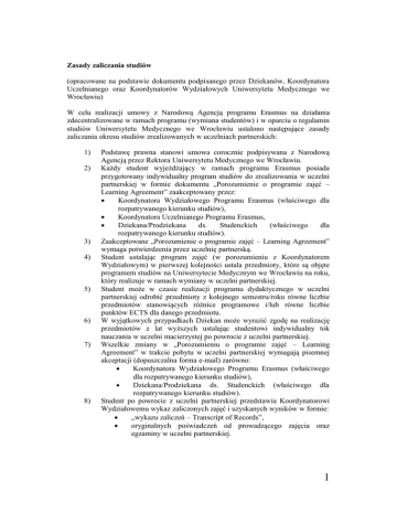 Zasady zaliczania studiów (opracowane na podstawie dokumentu podpisanego przez Dziekanów, Koordynatora Uczelnianego oraz Koordynatorów Wydziałowych Uniwersytetu Medycznego we Wrocławiu) W celu realizacji umowy z Narodową Agencją programu Erasmus na działania zdecentralizowane w ramach programu (wymiana studentów) i w oparciu o regulamin studiów Uniwersytetu Medycznego we Wrocławiu ustalono następujące zasady zaliczania okresu studiów zrealizowanych w uczelniach partnerskich: 1) 2) 3) 4) 5) 6) 7) 8) Podstawę prawna stanowi umowa corocznie podpisywana z Narodową Agencją przez Rektora Uniwersytetu Medycznego we Wrocławiu. Każdy student wyjeżdżający w ramach programu Erasmus posiada przygotowany indywidualny program studiów do zrealizowania w uczelni partnerskiej w formie dokumentu „Porozumienie o programie zajęć – Learning Agreement” zaakceptowany przez: Koordynatora Wydziałowego Programu Erasmus (właściwego dla rozpatrywanego kierunku studiów), Koordynatora Uczelnianego Programu Erasmus, Dziekana/Prodziekana ds. Studenckich (właściwego dla rozpatrywanego kierunku studiów). Zaakceptowane „Porozumienie o programie zajęć – Learning Agreement” wymaga potwierdzenia przez uczelnię partnerską. Student ustalając program zajęć (w porozumieniu z Koordynatorem Wydziałowym) w pierwszej kolejności ustala przedmioty, które są objęte programem studiów na Uniwersytecie Medycznym we Wrocławiu na roku, który realizuje w ramach wymiany w uczelni partnerskiej. Student może w czasie realizacji programu dydaktycznego w uczelni partnerskiej odrobić przedmioty z kolejnego semestru/roku równe liczbie przedmiotów stanowiących różnice programowe i/lub równe liczbie punktów ECTS dla danego przedmiotu. W wyjątkowych przypadkach Dziekan może wyrazić zgodę na realizację przedmiotów z lat wyższych ustalając studentowi indywidualny tok nauczania w uczelni macierzystej po powrocie z uczelni partnerskiej. Wszelkie zmiany w „Porozumieniu o programie zajęć – Learning Agreement” w trakcie pobytu w uczelni partnerskiej wymagają pisemnej akceptacji (dopuszczalna forma e-mail) zarówno: Koordynatora Wydziałowego Programu Erasmus (właściwego dla rozpatrywanego kierunku studiów), Dziekana/Prodziekana ds. Studenckich (właściwego dla rozpatrywanego kierunku studiów). Student po powrocie z uczelni partnerskiej przedstawia Koordynatorowi Wydziałowemu wykaz zaliczonych zajęć i uzyskanych wyników w formie: „wykazu zaliczeń – Transcript of Records”, oryginalnych poświadczeń od prowadzącego zajęcia oraz egzaminy w uczelni partnerskiej. 1 9) 10) 11) 12) 13) 14) 15) 16) 17) 18) Koordynator Wydziałowy na podstawie uzyskanych dokumentów przygotowuje wniosek o zaliczenie okresu studiów w uczelni partnerskiej do Dziekana/Prodziekana ds. Studenckich zawierający: wykaz przedmiotów zaliczonych w uczelni partnerskiej, wykaz zdanych egzaminów z podaniem ocen obowiązujących w uczelni macierzystej (przeliczenie ocen następuje według skali ocen ECTS), wykaz różnic programowych, które student musi uzupełnić w celu zaliczenia roku studiów w uczelni macierzystej. Dziekan na pisemny wniosek Koordynatora Wydziałowego oraz w oparciu o załączone oryginalne dokumenty (Transcript of Records oraz inne zaświadczenia o zaliczeniach) zalicza studentowi odbyte przedmioty z wykazem różnic programowych, stosownym wpisem do indeksu. Student musi przystąpić do egzaminu z przedmiotu (zgodnie z zasadami regulaminu studiów) w uczelni macierzystej w przypadku gdy: dany przedmiot w uczelni partnerskiej zakończył się zaliczeniem a w uczelni macierzystej wymagany jest egzamin, nie przystąpił do egzaminu końcowego w uczelni partnerskiej. Student musi zaliczyć wykazane różnice programowe zgodnie z regulaminem studiów obowiązującym w uczelni macierzystej. Student, który w uczelni partnerskiej zaliczył przedmioty poza zakresem uzgodnionym w „Porozumieniu o programie zajęć – Learning Agreement” lub nie uzyskał dodatkowej pisemnej akceptacji Koordynatora Wydziałowego i Dziekana na ich realizację, może ubiegać się o ich zaliczenie u kierownika Katedry lub Koordynatora nauczania danego przedmiotu w uczelni macierzystej. Ww. zasady dotyczą wyłącznie studentów posiadających status studenta programu Erasmus uczelni macierzystej. Student, który w ramach programu Erasmus przedłużył swój pobyt tylko za zgodą Dziekana (pobyt w ramach programu nie może być dłuższy niż 12 miesięcy) na następny semestr lub rok, zaliczenie przedmiotów uzyskanych w tym czasie uzgadnia wyłącznie z Dziekanem/Prodziekanem ds. Studenckich. Studentowi przysługuje prawo do stypendium naukowego za okres studiów w uczelni partnerskiej po warunkiem: osiągnięcia odpowiedniej średniej zgodnie z regulaminem studiów uczelni macierzystej, odrobienia wszystkich różnic programowych (uzyskania zaliczeń pełnego roku zgodnie z regulaminem studiów uczelni macierzystej) nie później niż w terminie wyznaczonym przez Dziekana. Niniejsze zasady i przepisy obowiązują od roku akademickiego 2004/2005. Z chwilą obowiązywania ww. zasad tracą ważność wcześniejsze wewnętrzne zarządzenia, przepisy i zasady: przygotowania „Porozumienia o programie zajęć – Learning Agreement”, zaliczania przedmiotów odbytych w uczelniach partnerskich w ramach realizowanego programu. 2