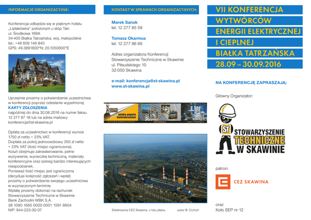 INFORMACJE ORGANIZACYJNE: KONTAKT W SPRAWACH ORGANIZACYJNYCH: Konferencja odbędzie się w pięknym hotelu „Liptakówka” położonym u stóp Tatr. ul. Środkowa 169A 34-405 Białka Tatrzańska, woj. małopolskie tel.: +48 609 146 840 GPS: 49.3891800°N; 20.1050600°E Marek Sanok tel. 12 277 85 59 Tomasz Okarmus tel. 12 277 86 66 Adres organizatora Konferencji Stowarzyszenie Techniczne w Skawinie ul. Piłsudskiego 10 32-050 Skawina e-mail: [email protected] www.st-skawina.pl NA KONFERENCJĘ ZAPRASZAJĄ: Główny Organizator: Uprzejmie prosimy o potwierdzenie uczestnictwa w konferencji poprzez odesłanie wypełnionej KARTY ZGŁOSZENIA najpóźniej do dnia 30.06.2016 na numer faksu 12 277 87 18 lub na adres mailowy: [email protected] Opłata za uczestnictwo w konferencji wynosi 1750 zł netto + 23% VAT. Dopłata za pokój jednoosobowy 350 zł netto + 23% VAT (ilość miejsc ograniczona). Koszt obejmuje zakwaterowanie, pełne wyżywienie, wycieczkę techniczną, materiały konferencyjne oraz szereg bardzo interesujących niespodzianek. Ponieważ ilość miejsc jest ograniczona (decyduje kolejność zgłoszeń i wpłat) prosimy o potwierdzenie swojego uczestnictwa w wyznaczonym terminie. Wpłatę prosimy dokonać na rachunek Stowarzyszenie Techniczne w Skawinie Bank Zachodni WBK S.A. 38 1090 1665 0000 0001 1591 8604 NIP: 944-223-30-07 VII KONFERENCJA WYTWÓRCÓW ENERGII ELEKTRYCZNEJ I CIEPLNEJ BIAŁKA TATRZAŃSKA 28.09 – 30.09.2016 patron: Elektrownia CEZ Skawina z lotu ptaka. autor B. Cichoń oraz Koło SEP nr 12 ZAPRASZAMY Państwa na kolejną Konferencję organizowaną przez nasze Stowarzyszenie Techniczne w Skawinie. Podobnie jak w poprzednich latach przygotowujemy dla Państwa program w którym poruszone zostaną najbardziej aktualne zagadnienia dotyczące energetyki. Nasi prelegenci przedstawią je zarówno do strony teoretycznej jak i praktycznej. Nie zabraknie również wycieczki technicznej. Dlatego już teraz gorąco Państwa zapraszamy do rezerwowania czasu i zgłaszania swojego udziału. W CZASIE KONFERENCJI ZOSTANĄ PAŃSTWU PRZYBLIŻONE NASTĘPUJĄCE ZAGADNIENIA: 1. Elektroenergetyczne technologie przyszłości. 2. Zastosowanie metod numerycznych do projektowania systemów fotowoltaicznych. 3. Funkcjonowanie sektora elektroenergetycznego po wprowadzeniu nowych uwarunkowań środowiskowych. 4. Przyszłość OZE w nowych realiach prawnych. 5. Realizacja postanowień ustawy o efektywności energetycznej. 6. Nowości w automatyce, AKPiA i automatyce zabezpieczeniowej. 7. Energetyka wodna. 8. Rozwój energetyki rozproszonej jako uzupełnienie krajowego systemu energetycznego. ODBIORCY KONFERENCJI: Odbiorcami naszej konferencji są przedstawiciele elektrowni, elektrociepłowni, firm współpracujących i produkujących dla energetyki. W szczególności zaproszenie kierujemy do: - dyrektorów, kierowników i specjalistów ds. produkcji i eksploatacji - dyrektorów, kierowników i specjalistów ds. technicznych - dyrektorów, kierowników i specjalistów ds. ochrony środowiska - - - głównych energetyków i automatyków osób zainteresowanych problematyką efektywności w energetyce firm produkujących urządzenia i aparaturę dla energetyki TAK BYŁO W ZESZŁYM ROKU SZCZEGÓŁOWY SPIS REFERATÓW WYŚLEMY PAŃSTWU NA 30 DNI PRZED KONFERENCJĄ. ŚRODA 28.09.2016 10:00–12:00 zakwaterowanie uczestników konferencji 13:00obiad 14:00 przywitanie uczestników, omówienie programu konferencji 14:15–18:30 wykłady, prezentacje firm, dyskusje 19:30 uroczysta kolacja CZWARTEK 29.09.2016 08:00–09:00śniadanie 09:15–13:00 wykłady, prezentacje firm, dyskusje 13:30–14:30obiad 14:15–18:30 wykłady, prezentacje firm, dyskusje 19:30 uroczysta kolacja PIĄTEK 30.09.2016 08:00–09:00śniadanie 09:15–13:00 wycieczka techniczna do MEW Kuźnice i MEW Olcza 13:30 obiad, zakończenie i podsumowanie konferencji CDN.