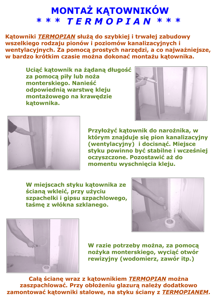 MONTAŻ KĄTOWNIKÓW *** TERMOPIAN *** Kątowniki TERMOPIAN służą do szybkiej i trwałej zabudowy wszelkiego rodzaju pionów i poziomów kanalizacyjnych i wentylacyjnych. Za pomocą prostych narzędzi, a co najważniejsze, w bardzo krótkim czasie można dokonać montażu kątownika. Uciąć kątownik na żądaną długość za pomocą piły lub noża monterskiego. Nanieść odpowiednią warstwę kleju montażowego na krawędzie kątownika. Przyłożyć kątownik do narożnika, w którym znajduje się pion kanalizacyjny (wentylacyjny) i docisnąć. Miejsce styku powinno być stabilne i wcześniej oczyszczone. Pozostawić aż do momentu wyschnięcia kleju. W miejscach styku kątownika ze ścianą wkleić, przy użyciu szpachelki i gipsu szpachlowego, taśmę z włókna szklanego. W razie potrzeby można, za pomocą nożyka monterskiego, wyciąć otwór rewizyjny (wodomierz, zawór itp.) Całą ścianę wraz z kątownikiem TERMOPIAN można zaszpachlować. Przy obłożeniu glazurą należy dodatkowo zamontować kątowniki stalowe, na styku ściany z TERMOPIANEM.