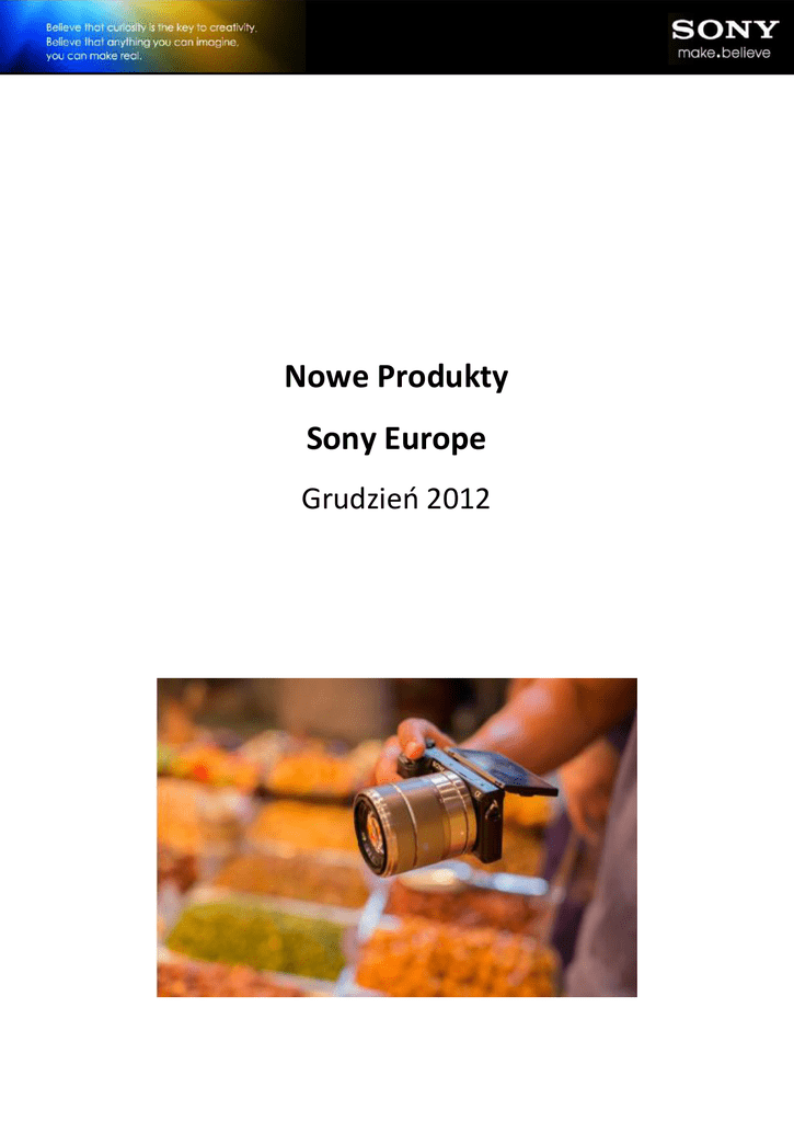 Nowe Produkty Sony Europe Grudzień 2012 Aparaty MODEL NEX5RLB.CE Czarny NEX5RLW.CE BiaŁy OPIS NEX-5R z obiektywem SEL-1650 MODEL NEX5RYB.CE Czarny z obiektywami SEL1650 + SEL55 210 Efektywna rozdzielczość 16,1 Megapikseli Sensor APS-C (23,5 x 15,6 mm) Exmor APS HD CMOS procesor obrazu BIONZ Zoom cyfrowy Clear Image Zoom: około 2x (fotografie) Inteligentny zoom: około 1,4x/2x (fotografie) Zoom cyfrowy: około 4x (fotografie/filmy) Metody pomiaru ostrości Fast Hybrid AF (wykrywanie fazy/wykrywanie kontrastu) 99 pól ostrości (wykrywanie fazy) 25 pól ostrości (wykrywanie kontrastu) Czułość 100 - 25600 (do zdjęć) Zdjęcia seryjne 10 kl/s Monitor LCD Dotykowy, panoramiczny 7,5 cm (3") TFT Xtra Fine LCD rozdzielczość 921 tys. punktów Regulacja kąta nachylenia: ok. 180 stopni w górę, ok. 50 stopni w dół Wydajność akumulatora (zdjęcia) 330 Funkcje indywidualne posteryzacja (kolor, cz.-b), kolor pop zdjęcie retro częściowy kolor (R,G,B,Y) obraz czarno-biały o dużym kontraście aparat-zabawka high-key miękka ostrość HDR obraz czarno-biały z bogatymi przejściami tonalnymi miniatura Wymiary 110,8 x 58,8 x 38,9 mm Waga 218 g sam korpus bez akumulatora Oprogramowanie PlayMemories Home OPIS NEX -5R z dwoma obiektywami SEL1650 + SEL55 210 Efektywna rozdzielczość 16,1 Megapikseli Sensor APS-C (23,5 x 15,6 mm) Exmor APS HD CMOS procesor obrazu BIONZ Zoom cyfrowy Clear Image Zoom: około 2x (fotografie) Inteligentny zoom: około 1,4x/2x (fotografie) Zoom cyfrowy: około 4x (fotografie/filmy) Metody pomiaru ostrości Fast Hybrid AF (wykrywanie fazy/wykrywanie kontrastu) 99 pól ostrości (wykrywanie fazy) 25 pól ostrości (wykrywanie kontrastu) Czułość 100 - 25600 (do zdjęć) Zdjęcia seryjne 10 kl/s Monitor LCD Dotykowy, panoramiczny 7,5 cm (3") TFT Xtra Fine LCD rozdzielczość 921 tys. punktów Regulacja kąta nachylenia: ok. 180 stopni w górę, ok. 50 stopni w dół Wydajność akumulatora (zdjęcia) 330 Funkcje indywidualne posteryzacja (kolor, cz.-b) kolor pop, zdjęcie retro , częściowy kolor (R,G,B,Y) obraz czarno-biały o dużym kontraście, aparat-zabawka, high-key miękka ostrość, HDR, obraz czarno-biały z bogatymi przejściami tonalnymi miniatura Wymiary 110,8 x 58,8 x 38,9 mm Waga 218 g sam korpus bez akumulatora Oprogramowanie PlayMemories Home MODEL Obiektyw SEL1018.AE OPIS Superszerokokątny obiektyw z mocowaniem E do aparatów NEX, zmiennoogniskowy 10 — 18 mm F4 wyposażony w soczewkę ze szkła Super ED i stabilizator obrazu Optical SteadyShot Typ obiektywu Szerokokątny zoom Ogniskowa 10 - 18 mm Światłosiła f/4 Pole widzenia 109 - 76 o Ostrość od 0.25 m Maksymalne powiększenie 1:10 Minimalna przysłona 22 Liczba listków na przysłonie 7 Mechanizm autofokusa AF Konstrukcja 10 elementów / 8 grup Rozmiar filtra 62 mm Tryb Makro Nie Stabilizacja Tak Wymiary 70 x 63.5 mm Waga 225 g 3 soczewki asferyczne
