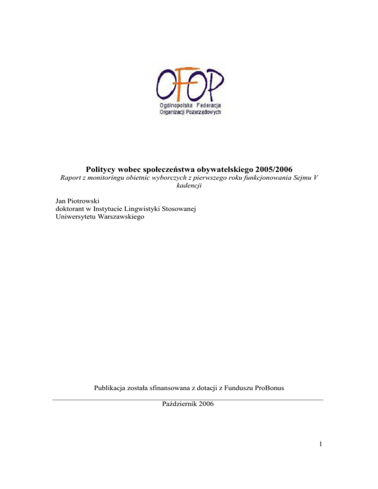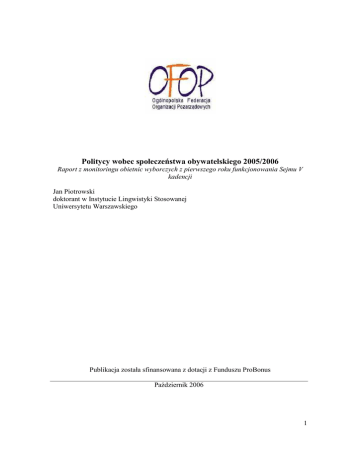 Politycy wobec społeczeństwa obywatelskiego 2005/2006 Raport z monitoringu obietnic wyborczych z pierwszego roku funkcjonowania Sejmu V kadencji Jan Piotrowski doktorant w Instytucie Lingwistyki Stosowanej Uniwersytetu Warszawskiego Publikacja została sfinansowana z dotacji z Funduszu ProBonus Październik 2006 1 Spis treści 1. Cel 3 2. Metodologia 3 3. Politycy wobec społeczeństwa obywatelskiego: Prasa 4 3.1 Analiza wypowiedzi 5 3.2 Wnioski 7 4. Politycy wobec społeczeństwa obywatelskiego: Sejm 9 4.1 Analiza wypowiedzi 9 4.2 Wnioski 12 5. Politycy wobec społeczeństwa obywatelskiego: Działania 14 5.1 Zachowania posłów w trakcie głosowań 14 5.2 Projekty ustaw oraz inne działania 15 5.3 Wnioski 16 2 1. Cel Niniejsza analiza ma na celu przedstawienie stanowisk zajmowanych przez polskich polityków wobec zagadnienia promocji i rozwoju społeczeństwa obywatelskiego w naszym kraju. 2. Metodologia W opracowaniu uwzględnione zostaną wypowiedzi przedstawicieli sześciu głównych sił politycznych (Prawo i Sprawiedliwość, Platforma Obywatelska, Sojusz Lewicy Demokratycznej, Samoobrona, Liga Polskich Rodzin, Polskie Stronnictwo Ludowe; a takŜe dwóch ugrupowań pozaparlamentarnych: Socjaldemokracji Polskiej oraz Partii Demokratycznej Demokraci.pl) 1 oraz przedstawicieli jednostek samorządu terytorialnego 2 zamieszczone w prasie opiniotwórczej (Gazeta Wyborcza oraz Rzeczpospolita, odtąd odpowiednio GW oraz Rz)3, jak równieŜ wygłoszone w trakcie posiedzeń sejmowych; rozmaite propozycje ustawodawcze mogące mieć wpływ na działalność trzeciego sektora w Polsce oraz zachowanie się posłów podczas głosowań nad kluczowymi z perspektywy rozwoju społeczeństwa obywatelskiego aktami prawnymi na dotychczasowych posiedzeniach Sejmu V kadencji (tj. od listopada 2005 do września 2006). Rozpatrywane akty prawne to: Ustawy, które sejm dotychczas przegłosował: - Ustawa o spółdzielni europejskiej Ustawy w komisjach (Komisja Finansów Publicznych, Komisja Sprawiedliwości i Praw Człowieka): - Rządowy projekt ustawy o zmianie ustawy o podatku od osób prawnych (druk nr 733) - Rządowy projekt ustawy o zmianie ustawy o podatku dochodowym od osób fizycznych i niektórych innych ustaw (druk nr 732) - Poselski projekt ustawy o zmianie ustawy o kosztach sądowych w sprawach cywilnych (druk 772) Ustawy w uzgodnieniach międzyresortowych (projektodawca – Kancelaria Prezesa Rady Ministrów): 1 Odtąd odpowiednio PiS, PO, SLD, SO, LPR, PSL, SDPL oraz PD. Dodatkowo uwzględniono wypowiedzi Kancelarii Prezydenta oraz przedstawicieli rządu (oznaczone odtąd odpowiednio KP i RM). Do przedstawicieli rządu zaliczono równieŜ wojewodów. W części sejmowej uwzględniono wypowiedzi posłów sześciu ugrupowań mających obecnie swych przedstawicieli w parlamencie. Wypowiedzi posłów pozostałych fakcji w Sejmie V kadencji oznacza się jako: Inne. Dodatkowo przeanalizowano wypowiedzi przedstawicieli rządu (RM). W opracowaniu nie brano pod uwagę wypowiedzi przedstawicieli innych organów państwa (np. Prezes NBP, Rzecznik Praw Obywatelskich, Rzecznik Praw Dziecka itp.) występujących na forum parlamentarnym. 2 Z racji na daleko idącą niezaleŜność szczebla samorządowego od podziałów widocznych na ogólnokrajowej scenie politycznej, samorządowców traktuje się jako jedną grupę, nieuwzględniając przynaleŜności partyjnej. Wypowiedzi przedstawicieli władz lokalnych oznacza się: S. 3 Z braku dostępu do archiwów nie uwzględniono wypowiedzi drukowanych w „Dzienniku”, który w przeciągu ostatniego półrocza ugruntował swoją pozycję jako ogólnopolska gazeta opiniotwórcza rywalizująca z GW i Rz. 3 - Projekt ustawy o zmianie ustawy o fundacjach (zawieszony po konsultacjach społecznych i międzyresortowych) - Projekt ustawy o fundacjach (trwają konsultacje społeczne) Zgromadzone dane pochodzą z internetowych archiwów GW i Rz (odpowiednio www.gazeta.pl/archiwum i www.rzeczpospolita.pl/archiwum) oraz z dostępnych na internetowych stronach Sejmu RP (www.sejm.gov.pl) sprawozdań stenograficznych oraz wyników głosowań. W celu odnalezienia adekwatnych artykułów archiwa prasowe zostały przeszukane z uwagi na występowanie następujących haseł (we wszelkich odmianach gramatycznych): • • • • • • • • społeczeństwo obywatelskie organizacje pozarządowe trzeci sektor NGO organizacje poŜytku publicznego wolontariat edukacja obywatelska wysłuchanie publiczne Z danych stenograficznych analizą objęto wszystkie punkty porządkowe posiedzeń sejmowych V kadencji dotyczące wymienionych wyŜej aktów prawnych. Dodatkowo przeszukano stenogramy z uwagi na występowanie wyŜej wymienionych wyrazów i fraz. 3. Politycy a społeczeństwo obywatelskie: Prasa Od zaprzysięŜenia parlamentarzystów Sejmu V kadencji sytuacja polityczna w Polsce pozostaje niestabilna. Do tego stanu rzeczy przyczyniły się: niepowodzenie rozmów koalicyjnych między dwoma największymi ugrupowaniami (PiS oraz PO), rozpad wpierw koalicji parlamentarnej, a potem rządowej PiS-SO-LPR, a ostatnio kryzys wywołany ujawnieniem przez stację telewizyjną TVN taśm z nagraniami rozmów posłanki SO Renaty Beger z prominentnymi politykami PiS w sprawie ewentualnego jej poparcia dla rządu – rozmów, w których opozycja upatruje „korupcji politycznej”. W oczach zarówno specjalistów, jak i szerszej opinii publicznej dyskurs polityczny (zarówno w mediach jak i na mównicy sejmowej, o czym poniŜej) uległ zdecydowanemu zaostrzeniu, a spory częstokroć mają charakter typowo światopoglądowy. Dziwi zatem, iŜ kwestia rozwoju społeczeństwa obywatelskiego explicite podnoszona była przez polityków raczej sporadycznie, mimo iŜ konsekwentnie coraz częściej pojawia się w pracach publicystów lub w wypowiedziach przedstawicieli rozwijającego się sektora pozarządowego. Medialna nośność tego zagadnienia okazuje się nikła w obliczu głównych wydarzeń, które wstr