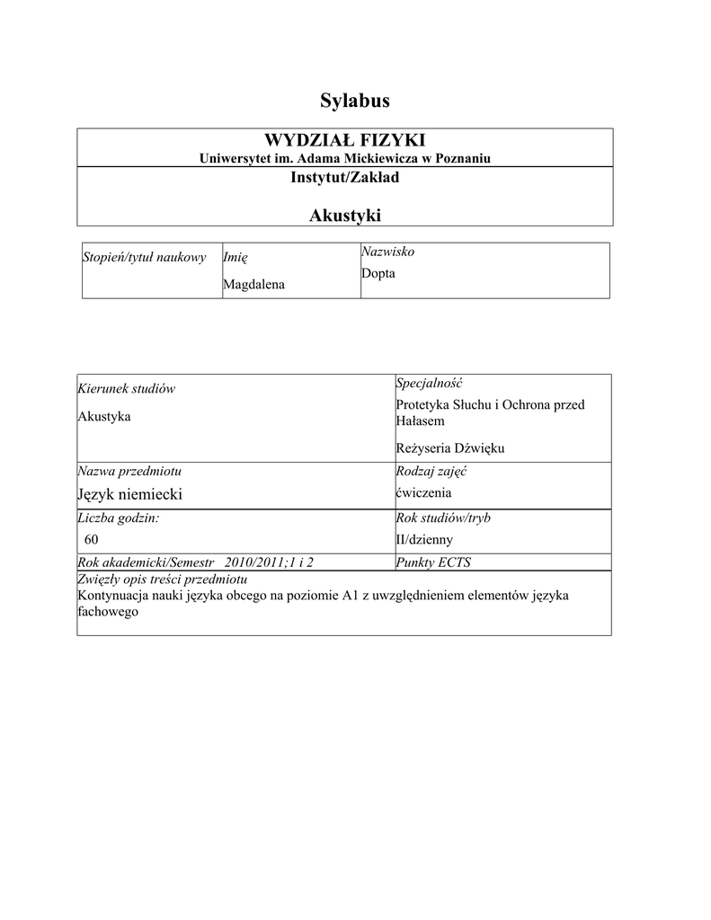 J. niemiecki - II rok Prot. Słuchu, Reż. Dźwięku, mgr Magdalena Dopta