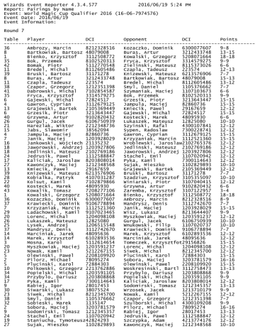 Wizards Event Reporter 4.3.4.577 2016/06/19 5:24 PM Report: Pairings by Name Event: World Magic Cup Qualifier 2016 (16-06-7974576) Event Date: 2016/06/19 Event Information: Round 7 Table Player DCI Opponent DCI Points -------------------------------------------------------------------------------------36 Ambrozy, Marcin 8212328516 Kozaczko, Dominik 6300077607 9-8 8 Bartkowiak, Bartosz 48079008 Buras, Artur 3212433748 13-15 1 Bienko, Krzysztof 3112508772 Kowalski, Grzegorz 5208071664 18-18 35 Bok, Przemek 8102520313 Fryca, Krzysztof 3314579275 9-9 42 Bomak, Piotr 5112770548 Zielinski, Mateusz 8115373026 6-6 11 Bredel, Michal 8112605486 Czapla, Tadeusz 223574 12-13 39 Bruski, Bartosz 31171278 Knizewski, Mateusz 6213576906 7-7 8 Buras, Artur 3212433748 Bartkowiak, Bartosz 48079008 15-13 11 Czapla, Tadeusz 223574 Bredel, Michal 8112605486 13-12 38 Czapor, Grzegorz 1212351398 Smyl, Daniel 1105376662 7-7 41 Dabrowski, Michal 7102854587 Szymaniak, Maciej 1107103673 6-6 35 Fryca, Krzysztof 3314579275 Bok, Przemek 8102520313 9-9 6 Gajewski, Michal 72824517 Grzesik, Piotr 3213643447 15-15 4 Gawron, Cyprian 3112679125 Jampula, Maciej 82860736 15-15 13 Grajewski, Bartek 2105369449 Kmiecik, Pawel 29167659 12-12 6 Grzesik, Piotr 3213643447 Gajewski, Michal 72824517 15-15 40 Grzywna, Artur 9102820432 Kostecki, Marek 48095930 6-6 26 Gurgul, Jacek 6106750939 Lukaszek, Mateusz 12825080 10-10 21 Harezlak, Wiktor 2212348736 Szyinski, Rafal 4300107841 12-12 15 Jabs, Slawomir 38562094 Sypen, Radoslaw 7300228741 12-12 4 Jampula, Maciej 82860736 Gawron, Cyprian 3112679125 15-15 7 Janik, Maciej 1203928029 Krzyzaniak, Marcin 1112521360 15-15 16 Jankowski, Wojciech 21135232 Wroblewski, Jaroslaw2102765376 12-12 18 Jaworowski, Andrzej 1203927806 Jedlinski, Mateusz 2102769186 12-12 18 Jedlinski, Mateusz 2102769186 Jaworowski, Andrzej 1203927806 12-12 24 Jedrusik, Pawel 1112588847 Stachel, Emil 1107020942 12-12 17 Kaliciak, Jaroslaw 8203808014 Pyka, Kamil 7300114643 12-12 27 Kawonczyk, Maciej 1212348568 Sujak, Mieszko 1102829893 10-10 13 Kmiecik, Pawel 29167659 Grajewski, Bartek 2105369449 12-12 39 Knizewski, Mateusz 6213576906 Bruski, Bartosz 31171278 7-7 28 Kobialka, Patryk 4107031287 Szadziun, Krzysztof 3105355097 10-10 22 Kolsut, Kamil 7102879866 Winiarski, Piotr 3107040415 12-12 40 Kostecki, Marek 48095930 Grzywna, Artur 9102820432 6-6 43 Kowalik, Tomasz 7208277106 Zaremba, Krzysztof 3107122957 3-4 1 Kowalski, Grzegorz 5208071664 Bienko, Krzysztof 3112508772 18-18 36 Kozaczko, Dominik 6300077607 Ambrozy, Marcin 8212328516 8-9 37 Krawiecki, Dominik 9106778894 Mandrysz, Denis 3112742670 7-7 7 Krzyzaniak, Marcin 1112521360 Janik, Maciej 1203928029 15-15 29 Ladachowski, Kamil 9107023465 Wisz, Lukasz 8213644407 9-9 20 Lorenc, Michal 1204098108 Myszkowiak, Maciej 1203591237 12-12 26 Lukaszek, Mateusz 12825080 Gurgul, Jacek 6106750939 10-10 25 Lysek, Andrzej 1206515548 Wnukowski, Filip 1107020737 10-10 37 Mandrysz, Denis 3112742670 Krawiecki, Dominik 9106778894 7-7 14 Marciniak, Jarek 48095636 Marek, Krzysztof 6102893536 12-12 14 Marek, Krzysztof 6102893536 Marciniak, Jarek 48095636 12-12 3 Mosna, Karol 5112614654 Tomeczek, Krzysztfot29156826 15-15 20 Myszkowiak, Maciej 1203591237 Lorenc, Michal 1204098108 12-12 23 Nowak, Kamil 5212267155 Siwek, Michal 8212345700 12-12 5 Olewinski, Pawel 2208109920 Plucinski, Karol 72884303 15-15 2 Pilorz, Michael 78095274 Sobora, Maciej 3203781579 16-16 5 Plucinski, Karol 72884303 Olewinski, Pawel 2208109920 15-15 10 Polkowski, Grzegorz 2213762886 Woskresinski, Bartl 3112758473 13-13 34 Popielski, Michal 1203591105 Przybylo, Dariusz 1203808868 9-9 34 Przybylo, Dariusz 1203808868 Popielski, Michal 1203591105 9-9 17 Pyka, Kamil 7300114643 Kaliciak, Jaroslaw 8203808014 12-12 9 Rabiej, Igor 28017453 Sodomirski, Tomasz 1212345357 13-13 30 Siwarski, Lukasz 38075524 Wrzosek, Jacek 1213710179 9-9 23 Siwek, Michal 8212345700 Nowak, Kamil 5212267155 12-12 38 Smyl, Daniel 1105376662 Czapor, Grzegorz 1212351398 7-7 32 Sobieski, Marek 1135147 Szulborski, Michal 4300109208 9-9 2 Sobora, Maciej 3203781579 Pilorz, Michael 78095274 16-16 9 Sodomirski, Tomasz 1212345357 Rabiej, Igor 28017453 13-13 24 Stachel, Emil 1107020942 Jedrusik, Pawel 1112588847 12-12 19 Staniucha, Tymoteusz42824293 Szczypka, Adam 4213774176 12-12 27 Sujak, Mieszko 1102829893 Kawonczyk, Maciej 1212348568 10-10 15 28 19 31 32 31 33 21 41 3 12 22 12 29 33 25 10 16 30 43 42 Sypen, Radoslaw 7300228741 Szadziun, Krzysztof 3105355097 Szczypka, Adam 4213774176 Szmyd, Jedrek 2208111294 Szulborski, Michal 4300109208 Szwebs, Michal 19158831 Szyinski, Piotr 2102770401 Szyinski, Rafal 4300107841 Szymaniak, Maciej 1107103673 Tomeczek, Krzysztfot29156826 Wiktorzak, Piotr 8102518243 Winiarski, Piotr 3107040415 Wisniewski, Patryk 5213732125 Wisz, Lukasz 8213644407 Wlodarczyk, Andrzej 1203805053 Wnukowski, Filip 1107020737 Woskresinski, Bartl 3112758473 Wroblewski, Jaroslaw2102765376 Wrzosek, Jacek 1213710179 Zaremba, Krzysztof 3107122957 Zielinski, Mateusz 8115373026 Jabs, Slawomir 38562094 Kobialka, Patryk 4107031287 Staniucha, Tymoteusz42824293 Szwebs, Michal 19158831 Sobieski, Marek 1135147 Szmyd, Jedrek 2208111294 Wlodarczyk, Andrzej 1203805053 Harezlak, Wiktor 2212348736 Dabrowski, Michal 7102854587 Mosna, Karol 5112614654 Wisniewski, Patryk 5213732125 Kolsut, Kamil 7102879866 Wiktorzak, Piotr 8102518243 Ladachowski, Kamil 9107023465 Szyinski, Piotr 2102770401 Lysek, Andrzej 1206515548 Polkowski, Grzegorz 2213762886 Jankowski, Wojciech 21135232 Siwarski, Lukasz 38075524 Kowalik, Tomasz 7208277106 Bomak, Piotr 5112770548 Wizards Event Reporter v4.0 - Copyright © 2016 - Wizards of the Coast LLC 12-12 10-10 12-12 9-9 9-9 9-9 9-9 12-12 6-6 15-15 12-12 12-12 12-12 9-9 9-9 10-10 13-13 12-12 9-9 4-3 6-6
