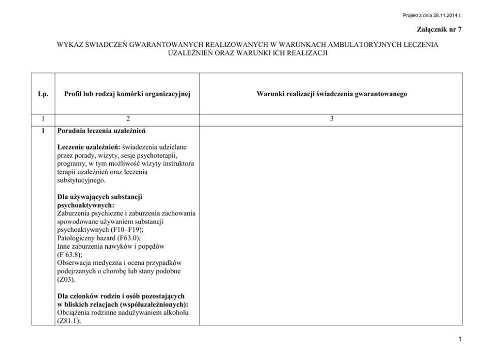 Projekt z dnia 28.11.2014 r. Załącznik nr 7 WYKAZ ŚWIADCZEŃ GWARANTOWANYCH REALIZOWANYCH W WARUNKACH AMBULATORYJNYCH LECZENIA UZALEŻNIEŃ ORAZ WARUNKI ICH REALIZACJI Lp. Profil lub rodzaj komórki organizacyjnej Warunki realizacji świadczenia gwarantowanego 1 2 3 1 Poradnia leczenia uzależnień Leczenie uzależnień: świadczenia udzielane przez porady, wizyty, sesje psychoterapii, programy, w tym możliwość wizyty instruktora terapii uzależnień oraz leczenia substytucyjnego. Dla używających substancji psychoaktywnych: Zaburzenia psychiczne i zaburzenia zachowania spowodowane używaniem substancji psychoaktywnych (F10–F19); Patologiczny hazard (F63.0); Inne zaburzenia nawyków i popędów (F 63.8); Obserwacja medyczna i ocena przypadków podejrzanych o chorobę lub stany podobne (Z03). Dla członków rodzin i osób pozostających w bliskich relacjach (współuzależnionych): Obciążenia rodzinne nadużywaniem alkoholu (Z81.1); 1 Projekt z dnia 28.11.2014 r. Obciążenia rodzinne nadużywaniem innych substancji psychoaktywnych (Z81.3); Inne zaburzenia lękowe (F41); Reakcja na ciężki stres i zaburzenia adaptacyjne (F43); Zaburzenia występujące pod postacią somatyczną (F45); Inne zaburzenia nerwicowe (F48); Specyficzne zaburzenia osobowości (F60); Obserwacja medyczna i ocena przypadków podejrzanych o chorobę lub stany podobne (Z03). Leczenie uzależnień: 1) porada lub wizyta diagnostyczna – porada Personel lub wizyta rozpoczynająca lub weryfikująca proces diagnostyczno-terapeutyczny, który może wymagać od 1 do 3 porad diagnostycznych u jednego świadczeniobiorcy, dotycząca także osób współuzależnionych, obejmująca: a) zebranie wywiadu od świadczeniobiorcy i rodziny, b) ocenę stanu psychicznego Pozostałe i somatycznego, wymagania c) niezbędne badanie psychologiczne, d) niezbędne badania diagnostyczne, w tym laboratoryjne, e) ustalenie rozpoznania i planu terapeutycznego; 1) lekarz specjalista w dziedzinie psychiatrii lub lekarz, który posiada specjalizację I stopnia w dziedzinie psychiatrii, lub lekarz w trakcie specjalizacji w dziedzinie psychiatrii lub 2) psycholog kliniczny, lub psycholog w trakcie specjalizacji w dziedzinie psychologia kliniczna, lub psycholog posiadający co najmniej dwuletnie doświadczenie w pracy klinicznej, lub specjalista psychoterapii uzależnień, lub osoba ubiegająca się o otrzymanie certyfikatu specjalisty psychoterapii uzależnień. 2) porada lub wizyta terapeutyczna – kolejna Personel porada lub wizyta, dotycząca także osób współuzależnionych i obejmująca: a) ocenę stanu psychicznego, 1) psycholog kliniczny lub 2) psycholog w trakcie specjalizacji w dziedzinie psychologia kliniczna, lub 3) psycholog, lub Czas trwania porady albo wizyty wynosi co najmniej 45 minut. 2 Projekt z dnia 28.11.2014 r. b) c) d) e) ocenę przebiegu i postępów leczenia, wsparcie psychologiczne, działania edukacyjne, oddziaływania interwencyjne; 4) specjalista psychoterapii uzależnień, lub 5) osoba ubiegająca się o otrzymanie certyfikatu specjalisty psychoterapii uzależnień. Pozostałe wymagania Czas trwania porady albo wizyty wynosi co najmniej 30 minut. 3) porada lekarska – porada lekarza kontynuująca leczenie według ustalonego planu terapeutycznego, dotycząca także osób współuzależnionych i obejmująca: a) ocenę stanu psychicznego i somatycznego, b) ocenę przebiegu i postępów leczenia, c) niezbędne kontrolne badania diagnostyczne, w tym laboratoryjne, d) czynności pielęgniarskie; Personel 1) lekarz specjalista w dziedzinie psychiatrii lub 2) lekarz, który posiada specjalizację I stopnia w dziedzinie psychiatrii, lub 3) lekarz w trakcie specjalizacji w dziedzinie psychiatrii. 4) wizyta instruktora terapii uzależnień – wizyta kontynuująca leczenie według ustalonego planu terapeutycznego, dotycząca także osób współuzależnionych i obejmująca: a) ocenę postępów leczenia, b) realizację zadań zaplanowanych Personel 1) specjalista psychoterapii uzależnień lub 2) osoba ubiegająca się o otrzymanie certyfikatu specjalisty psychoterapii uzależnień, lub 3) instruktor terapii uzależnień, lub 4) osoba ubiegająca się o otrzymanie certyfikatu instruktora terapii uzależnień. 3 Projekt z dnia 28.11.2014 r. w indywidualnym planie leczenia, Pozostałe c) ocena zasadności skierowania wymagania na konsultacje do specjalisty psychoterapii uzależnień, psychologa lub lekarza, w razie potrzeby, d) działania informacyjno-motywacyjne na wstępnym etapie kontaktu świadczeniobiorcy ze świadczeniodawcą, przed ustaleniem diagnozy i indywidualnego planu leczenia; 5) sesja psychoterapii indywidualnej – sesja z jednym świadczeniobiorcą, stanowiąca element ustalonego planu leczenia, nastawiona na przepracowanie podstawowych problemów i trudności świadczeniobiorcy, prowadzona według określonej metody; możliwe jest udzielanie świadczenia w programach pogłębionych, obejmujących leczenie zaburzeń emocjonalnych, u osób uzależnionych lub współuzależnionych; Czas trwania porady albo wizyty wynosi co najmniej 30 minut. Personel 1) specjalista psychoterapii uzależnień lub 2) osoba ubiegająca się o otrzymanie certyfikatu specjalisty psychoterapii uzależnień, lub 3) osoba prowadząca psychoterapię, lub 4) osoba ubiegająca się o otrzymanie certyfikatu psychoterapeuty. Pozostałe wymagania Czas trwania sesji wynosi co najmniej 60 minut oraz do 50 godzin w okresie roku. 6) sesja psychoterapii rodzinnej – sesja Personel z rodziną (dotyczy osób współuzależnionych, niezależnie od liczby osób), stanowiąca element ustalonego planu leczenia, prowadzona według określonej metody; możliwe jest udzielanie świadczenia w programach pogłębionych, Pozostałe obejmujących leczenie zaburzeń wymagania emocjonalnych, u osób uzależnionych lub współuzależnionych; 1) specjalista psychoterapii uzależnień lub 2) osoba ubiegająca się o otrzymanie certyfikatu specjalisty psychot