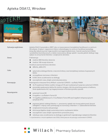 Apteka DGA12, Wrocław Sytuacja wyjściowa: Apteka DGA12 powstała w 2007 roku w nowoczesnym kompleksie handlowym w centrum Wrocławia. Krajowi i zagraniczni klienci odwiedzający to centrum handlowe posiadają dużą siłę nabywczą oraz mają wysokie wymagania jakościowe. Szeroki asortyment leków i produktów kosmetycznych, a także nowoczesny design apteki i wysoka jakość obsługi mają wpływ na utrzymanie klientów i zwiększenie obrotów. Dane: Frekwencja: średnio 400 klientów dziennie średnio 100 recept dziennie Struktura asortymentowa obrotów: 40% Rx, 60% OTC Cele: Koncepcja: obsługa klienta: znacznie krótszy czas kompletacji zestawu kupowanych optymalna leków szczegółowa rozmowa z klientem krótki okres oczekiwania na obsługę oszczędność czasu dzięki automatyzacji pracy Rozwiązanie mieszane firmy Willach: automat CONSIS + szuflady FAMA 60 % opakowań leków szybko rotujących Rx jest wydawanych poprzez automat CONSIS opakowania leków Rx (wolno rotujące, leki do przechowywania w lodówce, pozostałe duże opakowania itd.) są magazynowane w konwencjonalny sposób Rozwiązanie: automat Consis B3 9 regałów z szufladami Fama GX 15 regałów podblatowych z 4 szufladami Fama MX pod regałami ekspozycyjnymi (artykuły OTC) Wynik*: poprawa jakości obsługi klienta >> pracownicy apteki nie muszą pokonywać dużych odległości i więcej czasu poświęcają na rozmowę z klientem >> zadowolenie klientów zwiększenie koszyka zakupowego eliminacja błędów dzięki automatycznemu wydawaniu leków oszczędność czasu dzięki usprawnieniu procesów pracy redukcja czasu oczekiwania na obsługę w godzinach największego natężenia klientów * w porównaniu z innymi aptekami sieci DGA, które jeszcze nie pracują z automatem CONSIS 3 miejsca wydawania leków w sali ekspedycyjnej zapewniają szybkie i bezpośrednie dostarczenie lekarstw bez szukania. Pracownik może zostać z klientem i udzielać porad. Po lewej: Automat napełniany jest z tyłu. Zapas towaru można z maksymalnym wykorzystaniem miejsca i doskonałą organizacją magazynować w szufladach aptecznych FAMA pod automatem. Po prawej: 2 taśmociągi i 1 przenośnik ślizgowy zapewniają szybki transport leków. Automatyczny magazyn Powierzchnia apteki: Łącznie: 226 m² Ekspedycja: 115 m² Wejście Miejsca wydania lekarstw Consis przy punktach obsł ugi klienta Miejsce ustawienia automatu Consis: za regałem ekspozycyjnym na zapleczu magazynowym Powierzchnia ustawienia automatu: 4,1 m² Ekspedycja Szuflady Fama GX Miejsca wydania: 4 3 miejsca wydania na ekspedycji przy stanowiskach kasowych 1 miejsce wydania z przenośnikiem ślizgowym na zaplecze Technika transportu: 2 taśmociągi ze zwrotnicą + 1 przenośnik ślizgowy Wdrożenie: Maj 2007 r. Zaplecze Taśmociągi Automat Consis B3 Miejsce wydania z przenośnikiem ślizgowym na zapleczu Centralna ewidencja towaru i napełnianie automatu Consis Szuflady Fama GX (wbudowane pod automatem) «Zdecydowaliśmy o zakupie automatu CONSIS do nowo otwieranej apteki wiedząc, że w tak rozległej aptece będziemy zbyt dużo czasu spędzać na zapleczu magazynowym. Automatyczne wydawanie leków odbywa się szybciej i dlatego mamy więcej czasu na szczegółową rozmowę z klientem. Ponadto nasi klienci entuzjastycznie reagują na nowoczesną technikę wydawania preparatów. Stwierdziliśmy, że praca z automatem przyczyniła się zarówno do usprawnienia procesów pracy w aptece, jak i uzyskania większego koszyka zakupowego.» mgr farm. Jolanta Śliż, kierownik apteki Apteka DGA12 • ul. Powstańców Śląskich 2-4 • 53-333 Wrocław • Tel. (71) 338 65 20 • [email protected] • www.aptekadga.pl