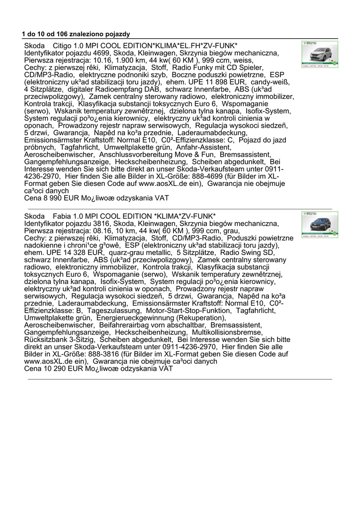 1 do 10 od 106 znaleziono pojazdy Skoda Citigo 1.0 MPI COOL EDITION*KLIMA*EL.FH*ZV-FUNK* Identyfikator pojazdu 4699, Skoda, Kleinwagen, Skrzynia biegów mechaniczna, Pierwsza rejestracja: 10.16, 1.900 km, 44 kw( 60 KM ), 999 ccm, weiss, Cechy: z pierwszej rêki, Klimatyzacja, Stoff, Radio Funky mit CD Spieler, CD/MP3-Radio, elektryczne podnoniki szyb, Boczne poduszki powietrzne, ESP (elektroniczny uk³ad stabilizacji toru jazdy), ehem. UPE 11 898 EUR, candy-weiß, 4 Sitzplätze, digitaler Radioempfang DAB, schwarz Innenfarbe, ABS (uk³ad przeciwpolizgowy), Zamek centralny sterowany radiowo, elektroniczny immobilizer, Kontrola trakcji, Klasyfikacja substancji toksycznych Euro 6, Wspomaganie (serwo), Wskanik temperatury zewnêtrznej, dzielona tylna kanapa, Isofix-System, System regulacji po³o¿enia kierownicy, elektryczny uk³ad kontroli cinienia w oponach, Prowadzony rejestr napraw serwisowych, Regulacja wysokoci siedzeñ, 5 drzwi, Gwarancja, Napêd na ko³a przednie, Laderaumabdeckung, Emissionsärmster Kraftstoff: Normal E10, C0²-Effizienzklasse: C, Pojazd do jazd próbnych, Tagfahrlicht, Umweltplakette grün, Anfahr-Assistent, Aeroscheibenwischer, Anschlussvorbereitung Move & Fun, Bremsassistent, Gangempfehlungsanzeige, Heckscheibenheizung, Scheiben abgedunkelt, Bei Interesse wenden Sie sich bitte direkt an unser Skoda-Verkaufsteam unter 09114236-2970, Hier finden Sie alle Bilder in XL-Größe: 888-4699 (für Bilder im XLFormat geben Sie diesen Code auf www.aosXL.de ein), Gwarancja nie obejmuje ca³oci danych Cena 8 990 EUR Mo¿liwoæ odzyskania VAT Skoda Fabia 1.0 MPI COOL EDITION *KLIMA*ZV-FUNK* Identyfikator pojazdu 3816, Skoda, Kleinwagen, Skrzynia biegów mechaniczna, Pierwsza rejestracja: 08.16, 10 km, 44 kw( 60 KM ), 999 ccm, grau, Cechy: z pierwszej rêki, Klimatyzacja, Stoff, CD/MP3-Radio, Poduszki powietrzne nadokienne i chroni¹ce g³owê, ESP (elektroniczny uk³ad stabilizacji toru jazdy), ehem. UPE 14 328 EUR, quarz-grau metallic, 5 Sitzplätze, Radio Swing SD, schwarz Innenfarbe, ABS (uk³ad przeciwpolizgowy), Zamek centralny sterowany radiowo, elektroniczny immobilizer, Kontrola trakcji, Klasyfikacja substancji toksycznych Euro 6, Wspomaganie (serwo), Wskanik temperatury zewnêtrznej, dzielona tylna kanapa, Isofix-System, System regulacji po³o¿enia kierownicy, elektryczny uk³ad kontroli cinienia w oponach, Prowadzony rejestr napraw serwisowych, Regulacja wysokoci siedzeñ, 5 drzwi, Gwarancja, Napêd na ko³a przednie, Laderaumabdeckung, Emissionsärmster Kraftstoff: Normal E10, C0²Effizienzklasse: B, Tageszulassung, Motor-Start-Stop-Funktion, Tagfahrlicht, Umweltplakette grün, Energierueckgewinnung (Rekuperation), Aeroscheibenwischer, Beifahrerairbag vorn abschaltbar, Bremsassistent, Gangempfehlungsanzeige, Heckscheibenheizung, Multikollisionsbremse, Rücksitzbank 3-Sitzig, Scheiben abgedunkelt, Bei Interesse wenden Sie sich bitte direkt an unser Skoda-Verkaufsteam unter 0911-4236-2970, Hier finden Sie alle Bilder in XL-Größe: 888-3816 (für Bilder im XL-Format geben Sie diesen Code auf www.aosXL.de ein), Gwarancja nie obejmuje ca³oci danych Cena 10 290 EUR Mo¿liwoæ odzyskania VAT Skoda Fabia 1.0 MPI COOL EDITION *KLIMA*DAB+*ZV-FUNK* Identyfikator pojazdu 3916, Skoda, Kleinwagen, Skrzynia biegów mechaniczna, Pierwsza rejestracja: 09.16, 10 km, 44 kw( 60 KM ), 999 ccm, weiss, Cechy: z pierwszej rêki, Klimatyzacja, Stoff, CD/MP3-Radio, Poduszki powietrzne nadokienne i chroni¹ce g³owê, ESP (elektroniczny uk³ad stabilizacji toru jazdy), ehem. UPE 14 008 EUR, laser-weiß, 5 Sitzplätze, Radio Swing SD, schwarz Innenfarbe, ABS (uk³ad przeciwpolizgowy), Zamek centralny sterowany radiowo, elektroniczny immobilizer, Kontrola trakcji, Klasyfikacja substancji toksycznych Euro 6, Wspomaganie (serwo), Wskanik temperatury zewnêtrznej, dzielona tylna kanapa, Isofix-System, System regulacji po³o¿enia kierownicy, elektryczny uk³ad kontroli cinienia w oponach, Prowadzony rejestr napraw serwisowych, Regulacja wysokoci siedzeñ, 5 drzwi, Gwarancja, Napêd na ko³a przednie, Laderaumabdeckung, Emissionsärmster Kraftstoff: Normal E10, C0²Effizienzklasse: B, Tageszulassung, Tagfahrlicht, Motor-Start-Stop-Funktion, Umweltplakette grün, Energierueckgewinnung (Rekuperation), Aeroscheibenwischer, Beifahrerairbag vorn abschaltbar, Bremsassistent, Gangempfehlungsanzeige, Heckscheibenheizung, Multikollisionsbremse, Rücksitzbank 3-Sitzig, Scheiben abgedunkelt, Bei Interesse wenden Sie sich bitte direkt an unser Skoda-Verkaufsteam unter 0911-4236-2970, Hier finden Sie alle Bilder in XL-Größe: 888-3916 (für Bilder im XL-Format geben Sie diesen Code auf www.aosXL.de ein), Gwarancja nie obejmuje ca³oci danych Cena 10 290 EUR Mo¿liwoæ odzyskania VAT Skoda Fabia 1.0 MPI COOL EDITION *KLIMA*DAB+*ZV-FUNK* Identyfikator pojazdu 3918, Skoda, Kleinwagen, Skrzynia biegów mechaniczna, Pierwsza rejestracja: 09.16, 1.900 km, 44 kw( 60 KM ), 999 ccm, weiss, Cechy: z pierwszej rêki, Klimatyzacja, Stoff, CD/MP3-Radio, Poduszki powietrzne nadokienne i chroni¹ce g³owê, ESP (elektroniczny uk³ad stabilizacji toru jazdy), ehem. UPE 14 008 EUR, laser-weiß, 5 Sitzplätze, Radio Swing SD, schwarz Innenfarbe, ABS (uk³ad przeciwpolizgowy), Zamek centralny sterowany radiowo, elektroniczny immobilizer, Kontrola trakcji, Klasyfikacja substancji toksycznych Euro 6, Wspomaganie (serwo), Wskanik temperatury zewnêtrznej, dzielona tylna kanapa, Isofix-System, System regulacji po³o¿enia kierownicy, elektryczny uk³ad kontroli cinienia w oponach, Prowadzony rejestr napraw serwisowych, Regulacja wysokoci siedzeñ, 5 drzwi, Gwarancja, Napêd na ko³a przednie, Laderaumabdeckung, Emissionsärmster Kraftstoff: Normal E10, C0²Effizienzklasse: B, Tagfahrlicht, Motor-Start-Stop-Funktion, Umweltplakette grün, Energierueckgewinnung (Rekuperation), Aeroscheibenwischer, Beifahrerairbag vorn abschaltbar, Bremsassistent, Gangempfehlungsanzeige, Heckscheibenheizung, Multikollisionsbremse, Rücksitzbank 3-Si