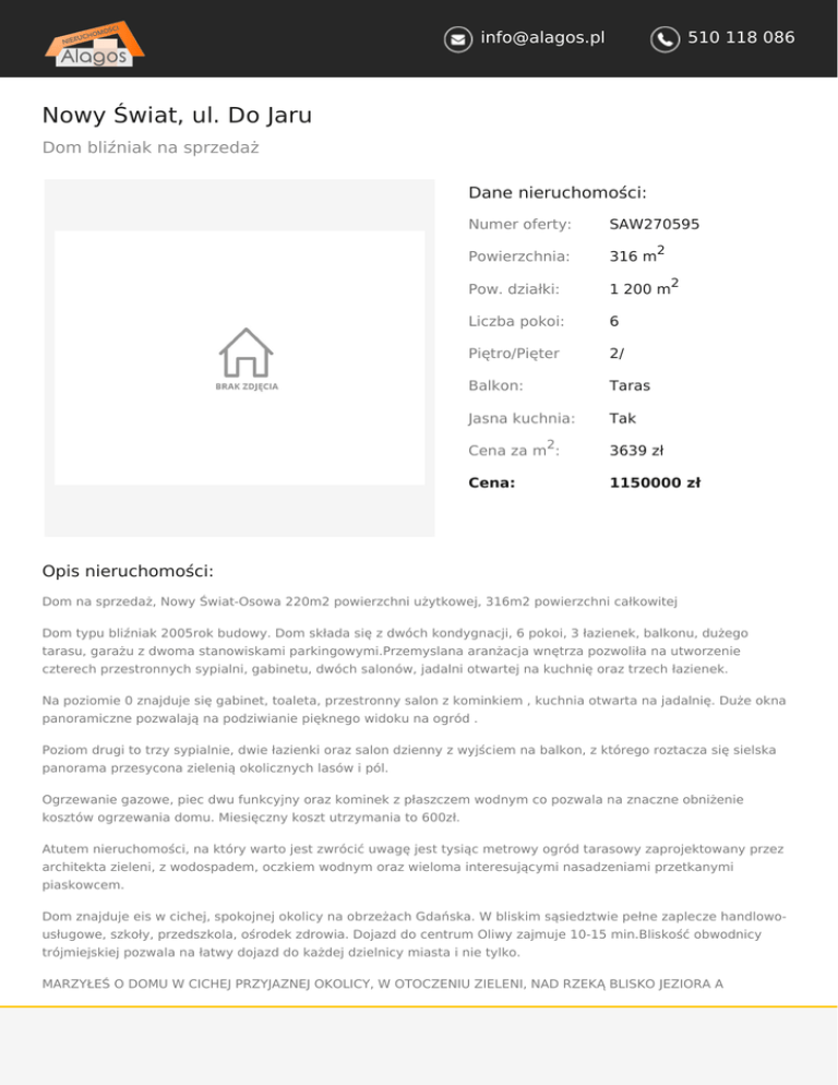 [email protected] 510 118 086 Nowy Świat, ul. Do Jaru Dom bliźniak na sprzedaż Dane nieruchomości: Numer oferty: SAW270595 Powierzchnia: 316 m Pow. działki: 1 200 m Liczba pokoi: 6 Piętro/Pięter 2/ Balkon: Taras Jasna kuchnia: Tak 2 2 2 Cena za m : 3639 zł Cena: 1150000 zł Opis nieruchomości: Dom na sprzedaż, Nowy Świat-Osowa 220m2 powierzchni użytkowej, 316m2 powierzchni całkowitej Dom typu bliźniak 2005rok budowy. Dom składa się z dwóch kondygnacji, 6 pokoi, 3 łazienek, balkonu, dużego tarasu, garażu z dwoma stanowiskami parkingowymi.Przemyslana aranżacja wnętrza pozwoliła na utworzenie czterech przestronnych sypialni, gabinetu, dwóch salonów, jadalni otwartej na kuchnię oraz trzech łazienek. Na poziomie 0 znajduje się gabinet, toaleta, przestronny salon z kominkiem , kuchnia otwarta na jadalnię. Duże okna panoramiczne pozwalają na podziwianie pięknego widoku na ogród . Poziom drugi to trzy sypialnie, dwie łazienki oraz salon dzienny z wyjściem na balkon, z którego roztacza się sielska panorama przesycona zielenią okolicznych lasów i pól. Ogrzewanie gazowe, piec dwu funkcyjny oraz kominek z płaszczem wodnym co pozwala na znaczne obniżenie kosztów ogrzewania domu. Miesięczny koszt utrzymania to 600zł. Atutem nieruchomości, na który warto jest zwrócić uwagę jest tysiąc metrowy ogród tarasowy zaprojektowany przez architekta zieleni, z wodospadem, oczkiem wodnym oraz wieloma interesującymi nasadzeniami przetkanymi piaskowcem. Dom znajduje eis w cichej, spokojnej okolicy na obrzeżach Gdańska. W bliskim sąsiedztwie pełne zaplecze handlowousługowe, szkoły, przedszkola, ośrodek zdrowia. Dojazd do centrum Oliwy zajmuje 10-15 min.Bliskość obwodnicy trójmiejskiej pozwala na łatwy dojazd do każdej dzielnicy miasta i nie tylko. MARZYŁEŚ O DOMU W CICHEJ PRZYJAZNEJ OKOLICY, W OTOCZENIU ZIELENI, NAD RZEKĄ BLISKO JEZIORA A [email protected] JEDNOCZEŚNIE BLISKO CENTRUM - ZADZWOŃ ! 510 118 086