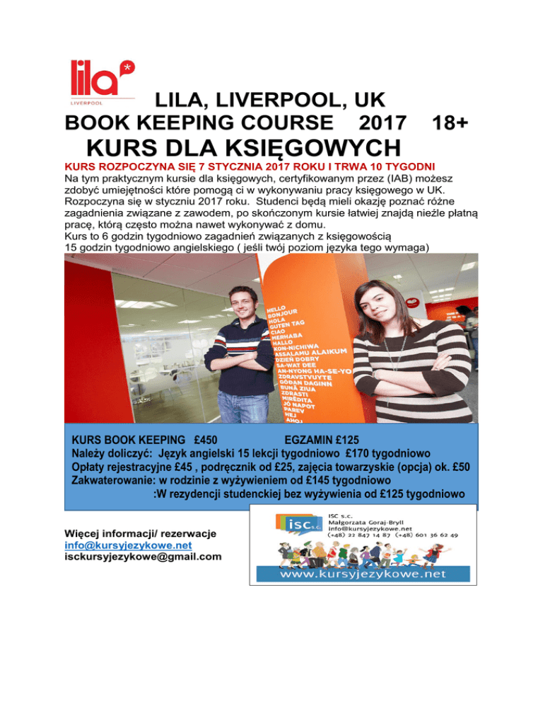 LILA, LIVERPOOL, UK BOOK KEEPING COURSE 2017 18+ KURS DLA KSIĘGOWYCH KURS ROZPOCZYNA SIĘ 7 STYCZNIA 2017 ROKU I TRWA 10 TYGODNI Na tym praktycznym kursie dla księgowych, certyfikowanym przez (IAB) możesz zdobyć umiejętności które pomogą ci w wykonywaniu pracy księgowego w UK. Rozpoczyna się w styczniu 2017 roku. Studenci będą mieli okazję poznać różne zagadnienia związane z zawodem, po skończonym kursie łatwiej znajdą nieźle płatną pracę, którą często można nawet wykonywać z domu. Kurs to 6 godzin tygodniowo zagadnień związanych z księgowością 15 godzin tygodniowo angielskiego ( jeśli twój poziom języka tego wymaga) KURS BOOK KEEPING £450 EGZAMIN £125 Należy doliczyć: Język angielski 15 lekcji tygodniowo £170 tygodniowo Opłaty rejestracyjne £45 , podręcznik od £25, zajęcia towarzyskie (opcja) ok. £50 Zakwaterowanie: w rodzinie z wyżywieniem od £145 tygodniowo :W rezydencji studenckiej bez wyżywienia od £125 tygodniowo Więcej informacji/ rezerwacje [email protected] [email protected]