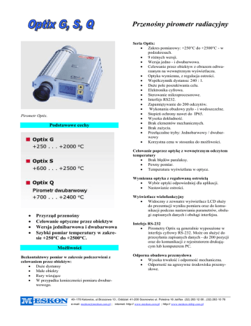 Przenośny pirometr radiacyjny Pirometr Optix. Podstawowe cechy Seria Optix: Zakres pomiarowy: +250°C do +2500°C - w podzakresach. 9 różnych wersji. Wersja jedno - i dwubarwowa. Celowanie przez obiektyw z obrazem odtwarzanym na wewnętrznym wyświetlaczu. Optyka wymienna, z regulacja ostrości. Współczynnik dystansu: 240 : 1. Duże pole poszukiwania celu. Elektronika cyfrowa. Sterowanie mikroprocesorowe. Interfejs RS232. Zapamiętywanie do 200 odczytów. Wykonania obudowy pyło - i wodoszczelne. Stopień ochrony nawet do IP65. Wysoka dokładność. Brak elementów mechanicznych. Brak zużycia. Przełączalne tryby: Jednobarwowy / dwubarwowy Korzystna cena w stosunku do możliwości. Celowanie poprzez optykę z wewnętrznym odczytem temperatury Brak błędów paralaksy. Pewny pomiar. Temperatura wyświetlana w optyce. Wymienna optyka z regulowaną ostrością Wybór optyki odpowiedniej dla aplikacji. Nastawianie ostrości. Przyrząd przenośny Celowanie optyczne przez obiektyw Wersja jednibarwowa i dwubarwowa Szybki pomiar temperatury w zakresie +250°C do +2500°C. Możliwości Bezkontaktowy pomiar w zakresie podczerwieni z celowaniem przez obiektyw: Duże dystansy Małe obiekty Rury wizujące W przypadku konieczności pomiaru dwubarwowego. Wyświetlacz wielofunkcyjny Widoczny z zewnatrz wyświetlacz LCD służy do prezentacji wyniku pomiaru oraz do komunikacji podczas nastawiania parametrów, obsługi zapisanych danych i obsługi interfejsu. Intefejs RS-232 Pirometry Optix są generalnie wyposażone w interfejs cyfrowy RS-232. Może on służyć do przesyłania zapisanych danych - do 200 pozycji oraz do komunikacji z rejestratorem drukującym lub komputerem PC. Odporna obudowa przemysłowa Wysoka trwałość i odporność mechaniczna. Odporność na agresywne środowiska przemysłowe. 40–170 Katowice, ul.Brzozowa 13 ; Oddział: 41-200 Sosnowiec ul. Poleśna 16 ;tel/fax (32) 263 12 00 ; (32) 263 10 76 e-mail: [email protected] ; internet: http:// www.meskon.com.pl ; http:// www.meskon-sklep.com.pl Przenośny pirometr radiacyjny Odporność na zakłócenia: Aplikacje Elektronika cyfrowa Optix spełnia ostre wymagania zgodnie z EN 500 81-2, EN 500 82-2. Nawet przy silnych zakłoceniach pomiar jest prawidłowy. Paleniska Składowanie wartości granicznych max. i min. Funkcja ta pozwala na zapis danych pomiarowych w procesach nieciągłych i niejednorodnych. Obie wartości są zapamiętywane i wyświetlane po zakończeniu pomiaru. Składowanie danych pomiarowych Pirometry Optix są wyposażone w pamięć wewnętrzną. Ostatnia wartość bieżąca, max. lub min. jest składowana wraz z nastawioną emisyjnością w ilości do 200 pomiarów. Składowane dane mogą być przesłane do PC dla dalszej obróbki. Funkcja loggera danych pozwala na zapis wartości dynamicznych w nastawionym przedziale czasowym. Walcownie Nastawianie emisyjności Współczynnik emisyjności materiału może być nastawiany w przyrządzie. Inne funkcje Spawalnictwo Zatrzymanie, Automatyczne wyłączenie, Kontrola stanu baterii, Samosprawdzenie, Monitorowanie temperatury wewnętrznej. 40–170 Katowice, ul.Brzozowa 13 ; Oddział: 41-200 Sosnowiec ul. Poleśna 16 ;tel/fax (32) 263 12 00 ; (32) 263 10 76 e-mail: [email protected] ; internet: http:// www.meskon.com.pl ; http:// www.meskon-sklep.com.pl Przenośny pirometr radiacyjny Aplikacje c.d. Trzy podstawowe wersje: Wygląd zewnętrzny wszystkich wersji Optix jest taki sam. Różnią się one zakresem pomiarowym, wielkością celu i zasadą pomiaru. Optix G - typ PT 50. Dla przemysłu stalowego, szklarskiego, ceramicznego i chemicznego. Zakres temperatur: +250°C do +2000°C. Optix S - typ PT 60. Cementownie Dla przemysłu metalurgicznego i ceramicznego. Zakres temperatur: +600°C do +2500°C. Optix Q - typ PT 70. Pirometr dwubarwowy Zakres temperatur: +700°C do +2400°C. Dla zastosowań gdzie wpływ pyłu, dymu i zmiany emisyjności musi być eliminowany. Dane techniczne Koksownie Typ Oznaczenie PT 50 Optix G Zakres +250°C do +2000°C Typ optyki ( zakr. ostrości ) Optyka standardowa Zależnie od wybranej optyki. AF1: 150:1 ( 0,4 - ... ) m Tele-optyka AF2: 200:1 ( 1,2 - ... ) m Czujnik Fotodioda InGaAs. Zakres spektralny 1,1 d 1,7 m Niepewność 4K lub 0,5% dla <+1500°C, 0,75% dla >1500°C 0,25 K/K dla T<500°C, 0,05%/K dla T500°C. ( przy e=1 i Tu=+23°C ). Wsp. temperaturowy (odchyłka w stos. do +23°C) Przemysł szklarski. 40–170 Katowice, ul.Brzozowa 13 ; Oddział: 41-200 Sosnowiec ul. Poleśna 16 ;tel/fax (32) 263 12 00 ; (32) 263 10 76 e-mail: [email protected] ; internet: http:// www.meskon.com.pl ; http:// www.meskon-sklep.com.pl Przenośny pirometr radiacyjny Dane techniczne c.d. Typ Oznaczenie PT 60 Optix S Zakres +2600°C do +2500°C Typ optyki ( zakr. ostrości ) Optyka standardowa Zależnie od wybranej optyki. AF1: 175:1 ( 0,4 - ... ) m Tele-optyka AF2: 240:1 ( 1,2 - ... ) m Czujnik Fotodioda Si Zakres spektralny 0,8 d 1,1 m Niepewność 4K lub 0,5% dla <+1500°C, 0,75% dla >1500°C 0,25 K/K dla T<500°C, 0,05%/K dla T500°C. ( przy e=1 i Tu=+23°C ). Wsp. temperaturowy (odchyłka w stos. do +23°C) Typ Oznaczenie Zakres Typ optyki ( zakr. ostrości ) Optyka standardowa Dane techniczne wspólne OptixQ PT 70 wersja dwubarwna +700 do +900 do +1600°C +2400°C Zależnie od wybranej optyki. AF1: 80:1 AF3: 150:1 ( 0,4 - ... ) m Tele-optyka AF2: 120:1 AF4: 240:1 ( 1,2 - ... ) m Czujnik Podwójna fotodioda Si Zakres spektralny 0,95 / 1,05 m Niepewność 1% wart. zmierzonej ( przy e=1 i Tu=+23°C ). Wsp. temperaturowy (odchyłka w stos. do +23°C) 0,07%/ K wart. zmierzonej / K. 1K ± 1cyfra. 1s. 4 - cyfrowy LCD 1K -10 do +50°C -20 do +60°C IP65 wg. DIN 40050 SxWxG: 155x70x174 mm Aluminium 1,5 kg Okular bezparalaksowy z celownikiem Optyka: Wymienna z reg. ostrością. Zasilanie: Akumulator wewn. lub zasilacz zewn. 230V. Pamięć: Wewnętrzna na 200 zapisów Komunikacja z PC: RS 232 C 4800 Bd, 1 bit stop, bez parzystości. Linearyzacja: cyfrowa - mikr