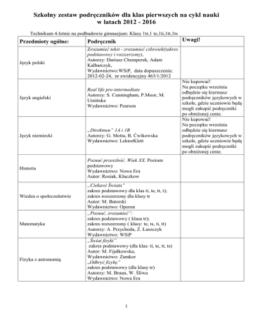 Szkolny zestaw podręczników dla klas pierwszych na cykl nauki w latach 2012 - 2016 Technikum 4-letnie na podbudowie gimnazjum: Klasy 1tr,1 te,1ti,1tt,1ts Uwagi! Przedmioty ogólne: Podręcznik Język polski Zrozumieć tekst - zrozumieć człowiek(zakres podstawowy i rozszerzony), Autorzy: Dariusz Chemperek, Adam Kalbarczyk, Wydawnictwo:WSiP, data dopuszczenia: 2012-02-24, nr ewidencyjny 463/1/2012 Język angielski Real life pre-intermediate Autorzy: S. Cunningham, P.Moor, M. Umińska Wydawnictwo: Pearson Język niemiecki „Direktneu” 1A i 1B Autorzy: G. Motta, B. Ćwikowska Wydawnictwo: LektorKlett Historia Poznać przeszłość. Wiek XX. Poziom podstawowy Wydawnictwo: Nowa Era Autor: Rosiak, Kłaczkow Wiedza o społeczeństwie Matematyka Fizyka z astronomią „Ciekawi Świata” zakres podstawowy dla klas ti, te, tt, t); zakres rozszerzony dla klasy tr Autor: M. Batorski Wydawnictwo: Operon „Poznać, zrozumieć”: zakres podstawowy ( klasa tr); zakres rozszerzony ( klasy: te, ts, ti, tt) Autorzy: A. Przychoda, Z. Łaszczyk Wydawnictwo: WSiP „Świat fizyki” zakres podstawowy (dla klas: ti, te, tt, ts) Autor: M. Fijałkowska, Wydawnictwo: Zamkor „Odkryć fizykę” zakres podstawowy (dla klasy tr) Autorzy: M. Braun, W. Śliwa Wydawnictwo: Nowa Era 1 Nie kupować! Na początku września odbędzie się kiermasz podręczników językowych w szkole, gdzie uczniowie będą mogli zakupić podręczniki po obniżonej cenie. Nie kupować! Na początku września odbędzie się kiermasz podręczników językowych w szkole, gdzie uczniowie będą mogli zakupić podręczniki po obniżonej cenie. Chemia To jest chemia. Podręcznik dla szkół ponadgimnazjalnych, zakres podstawowy. Autorzy: R. Hassa, A. Mrzigod, J. Mrzigod Wydawnictwo: Nowa Era Biologia Biologia na czasie. Podręcznik dla szkół ponadgimnazjalnych. Autorzy: E. Bonar, W. Krzeszowiec-Jeleń, S. Czachorowski Wydawnictwo: Nowa Era Geografia „Geografia. Po prostu”. Podręcznik dla szkół ponadgimnazjalnych Autorzy: I. Łęcka, M. Mularczyk Wydawnictwo: WSiP Podstawy przedsiębiorczości Krok w przedsiębiorczość. Podstawy przedsiębiorczości dla szkół ponadgimnazjalnych. Autor: Zbigniew Makieła, Tomasz Rachwał Wydawnictwo: Nowa Era Informatyka Informatyka Europejczyka. Zakres podstawowy. Autor: Jarosław Skłodowski Wydawnictwo:Helion Edukacja dla bezpieczeństwa Podręcznik i zeszyt ćwiczeń o tym samym tytule: Żyję i działam bezpiecznie. Edukacja dla bezpieczeństwa. Zakres podstawowy. Szkoła ponadgimnazjalna. Autor: Jarosław Słoma Wydawnictwo: Nowa Era Religia W Kościele. Podręcznik i notes dla ucznia. Autor: Zbigniew Marek Dostępne w bibliotece szkolnej. Dostępne po 15 sierpnia 2012r. Podręczniki do języka angielskiego, fizyki oraz informatyki można kupić z rabatem w szkole we wrześniu od przedstawicieli wydawnictwa. 2 Zasadnicza Szkoła samochodowych, Przedmioty ogólne: Język polski Zawodowa na podbudowie gimnazjum: mechanik pojazdów Podręcznik Język polski 1. Podręcznik dla zasadniczej szkoły zawodowej, seria Odkrywamy na nowo Autor: Jolanta Kusiak, Wydawnictwo Operon, data dopuszczenia: 2012-04-17 , nr ewidencyjny 526/1/2012. Język angielski “New Horizons 2”, Autorzy: P. Radley, D. Simons, M. Wieruszewska Wydawnictwo: Oxford Historia Poznać przeszłość. Wiek XX. Poziom podstawowy Wydawnictwo: Nowa Era Autor: Rosiak, Kłaczkow Matematyka Matematyka dla zasadniczych szkół zawodowych Autorzy: L. Wojciechowski, M. Bryński, K. Szymański Wydawnictwo: WSiP Fizyka z astronomią „Odkryć fizykę”. Podręcznik dla szkół ponadgimnazjalnych zakres podstawowy. Autorzy: M. Braun, W. Śliwa Wydawnictwo: Nowa Era Geografia „Geografia. Po prostu”. Podręcznik dla szkół ponadgimnazjalnych Autorzy: I. Łęcka, M. Mularczyk Wydawnictwo: WSiP Na początku września odbędzie się kiermasz podręczników językowych w szkole, gdzie uczniowie będą mogli zakupić podręczniki po obniżonej cenie. Nie kupować! Krok w przedsiębiorczość. Podstawy przedsiębiorczości dla szkół Podstawy ponadgimnazjalnych. przedsiębiorczości Autor: Zbigniew Makieła, Tomasz Rachwał Wydawnictwo: Nowa Era Informatyka Informatyka Europejczyka. Zakres podstawowy. Autor: Jarosław Skłodowski Wydawnictwo:Helion 3 Dostępne w bibliotece szkolnej. Edukacja dla bezpieczeństwa Podręcznik i zeszyt ćwiczeń o tym samym tytule: Żyję i działam bezpiecznie. Edukacja dla bezpieczeństwa. Zakres podstawowy. Szkoła ponadgimnazjalna. Autor: Jarosław Słoma Wydawnictwo: Nowa Era Religia W Kościele. Podręcznik i notes dla ucznia. Autor: Zbigniew Marek WOS „Ciekawi Świata” Podręcznik dla szkoły ponadgimnazjalnej, zakres podstawowy. Autor: M. Batorski Wydawnictwo: Operon Chemia „To jest chemia”. Podręcznik dla szkół ponadgimnazjalnych, zakres podstawowy. Autorzy: R. Hassa, A. Mrzigod, J. Mrzigod Wydawnictwo: Nowa Era Biologia Biologia na czasie. Podręcznik dla szkół ponadgimnazjalnych. Autorzy: E. Bonar, W. Krzeszowiec-Jeleń, S. Czachorowski Wydawnictwo: Nowa Era 4 Dostępne po 15 sierpnia 2012r.
