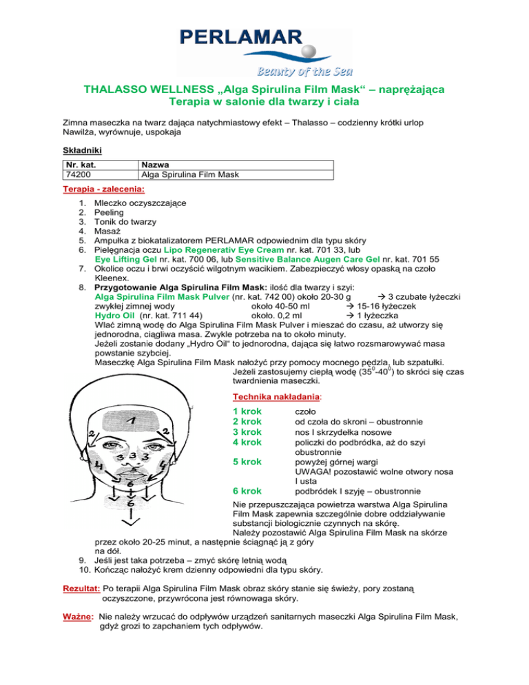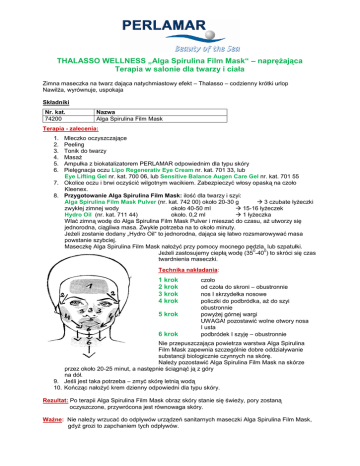 THALASSO WELLNESS „Alga Spirulina Film Mask“ – naprężająca Terapia w salonie dla twarzy i ciała Zimna maseczka na twarz dająca natychmiastowy efekt – Thalasso – codzienny krótki urlop Nawilża, wyrównuje, uspokaja Składniki Nr. kat. 74200 Nazwa Alga Spirulina Film Mask Terapia - zalecenia: Mleczko oczyszczające Peeling Tonik do twarzy Masaż Ampułka z biokatalizatorem PERLAMAR odpowiednim dla typu skóry Pielęgnacja oczu Lipo Regenerativ Eye Cream nr. kat. 701 33, lub Eye Lifting Gel nr. kat. 700 06, lub Sensitive Balance Augen Care Gel nr. kat. 701 55 7. Okolice oczu i brwi oczyścić wilgotnym wacikiem. Zabezpieczyć włosy opaską na czoło Kleenex. 8. Przygotowanie Alga Spirulina Film Mask: ilość dla twarzy i szyi: Alga Spirulina Film Mask Pulver (nr. kat. 742 00) około 20-30 g 3 czubate łyżeczki zwykłej zimnej wody około 40-50 ml 15-16 łyżeczek Hydro Oil (nr. kat. 711 44) około. 0,2 ml 1 łyżeczka Wlać zimną wodę do Alga Spirulina Film Mask Pulver i mieszać do czasu, aż utworzy się jednorodna, ciągliwa masa. Zwykle potrzeba na to około minuty. Jeżeli zostanie dodany „Hydro Oil“ to jednorodna, dająca się łatwo rozsmarowywać masa powstanie szybciej. Maseczkę Alga Spirulina Film Mask nałożyć przy pomocy mocnego pędzla, lub szpatułki. 0 0 Jeżeli zastosujemy ciepłą wodę (35 -40 ) to skróci się czas twardnienia maseczki. 1. 2. 3. 4. 5. 6. Technika nakładania: 1 krok 2 krok 3 krok 4 krok 5 krok 6 krok czoło od czoła do skroni – obustronnie nos I skrzydełka nosowe policzki do podbródka, aż do szyi obustronnie powyżej górnej wargi UWAGA! pozostawić wolne otwory nosa I usta podbródek I szyję – obustronnie Nie przepuszczająca powietrza warstwa Alga Spirulina Film Mask zapewnia szczególnie dobre oddziaływanie substancji biologicznie czynnych na skórę. Należy pozostawić Alga Spirulina Film Mask na skórze przez około 20-25 minut, a następnie ściągnąć ją z góry na dół. 9. Jeśli jest taka potrzeba – zmyć skórę letnią wodą 10. Kończąc nałożyć krem dzienny odpowiedni dla typu skóry. Rezultat: Po terapii Alga Spirulina Film Mask obraz skóry stanie się świeży, pory zostaną oczyszczone, przywrócona jest równowaga skóry. Ważne: Nie należy wrzucać do odpływów urządzeń sanitarnych maseczki Alga Spirulina Film Mask, gdyż grozi to zapchaniem tych odpływów.