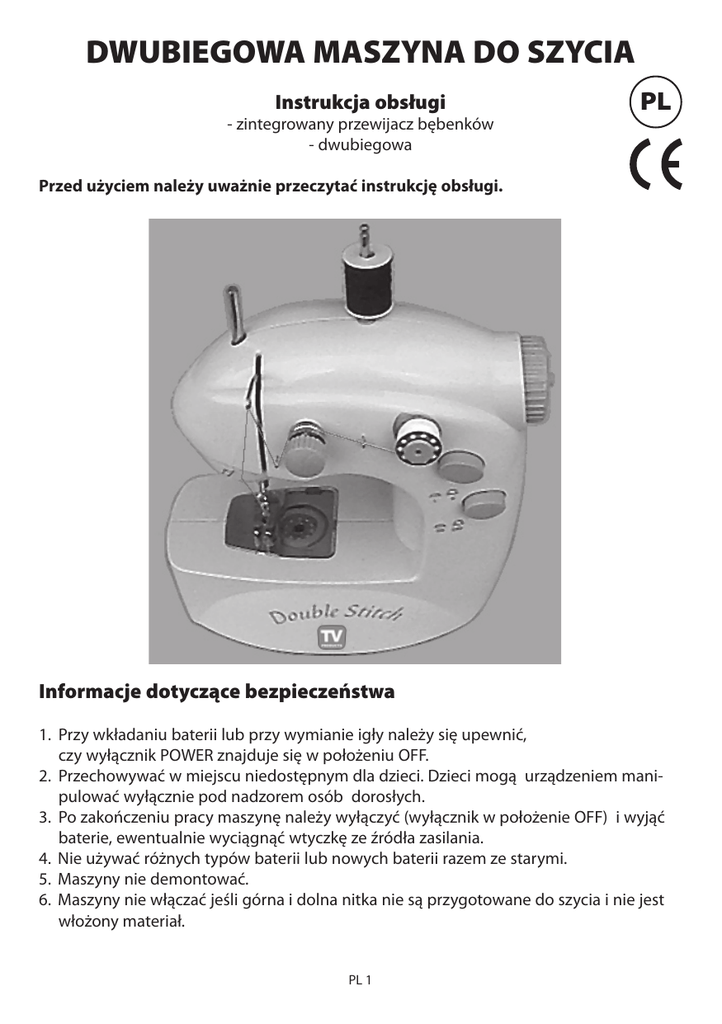 DWUBIEGOWA MASZYNA DO SZYCIA Instrukcja obsługi - zintegrowany przewijacz bębenków - dwubiegowa PL Przed użyciem należy uważnie przeczytać instrukcję obsługi. Informacje dotyczące bezpieczeństwa 1. Przy wkładaniu baterii lub przy wymianie igły należy się upewnić, czy wyłącznik POWER znajduje się w położeniu OFF. 2. Przechowywać w miejscu niedostępnym dla dzieci. Dzieci mogą urządzeniem manipulować wyłącznie pod nadzorem osób dorosłych. 3. Po zakończeniu pracy maszynę należy wyłączyć (wyłącznik w położenie OFF) i wyjąć baterie, ewentualnie wyciągnąć wtyczkę ze źródła zasilania. 4. Nie używać różnych typów baterii lub nowych baterii razem ze starymi. 5. Maszyny nie demontować. 6. Maszyny nie włączać jeśli górna i dolna nitka nie są przygotowane do szycia i nie jest włożony materiał. PL 1 1. Opis części maszyny. 1. Ręczny włącznik. 2. Przełącznik prędkości. 3. Nasadka do przewijania nici. 4. Przewijacz nici. 5. Krótka nasadka na cewkę. 6. Górny bębenek. 23 7. Górny bębenek. 24 8. Nasadka. 9. Kółeczko do regulacji naprężenia nici. 10. Sprężynka dociskowa. 11. Zaciski. 12. Prowadnik nici. 13. Prowadnik igły. 14. Dźwignia podnoszenia stopki. 15. Drążek igły. 16. Uchwyt stopki ze sprężynką. 17. Oczko. 13 12 11 10 9 8 7 6 5 4 3 14 26 25 2 1 15 16 17 18 19 18. Uchwyt stopki. 19. Prowadnica materiału. 20. Głowica zaciskowa igły. 21. Igła. 22. Osłona kadłuba czółenka. 23. Gniazdko do podłączenia nożnego pedała. 21 20 22 24. Gniazdko do podłączenia zasilacza. 25. Przycisk do zwolnienia osłony. 26. Dolny bębenek. Wyposażenie - pedał nożny bębenki: 2 w maszynie, 2 puste, 10 różnych nici 1+12 igieł zapasowych nawlekacz igieł 2. Montowanie baterii Otworzyć pokrywę umieszczoną w dolnej części maszyny, włożyć 4 baterie typu AA 1,5 V. Należy zwrócić uwagę na poprawne ustawienie biegunów. Jeśli stosowany jest zasilacz, używaj tylko zasilacza DC 6V 800 mA. 3. Rodzaje nici 1. Górna nić Sposób nawlekania górnej nici został przedstawiony na opakowaniu. Maszyna do szycia jest dostarczana z już nawiniętym bębenkiem. Jeśli istnieje potrzeba użycia innego bębenka, to wrzecionko należy zdjąć z podstawki, bębenek nałożyć na nasadkę, a nić nawinąć w kierunku ruchu wskazówek zegara, zgodnie z poniższymi punktami. 2.Dolna nić Nacisnąć przycisk nr 25 na tylnej części urządzenia. Pokrywa otworzy się automatycznie. Włożyć bębenek i nawinąć nić w kierunku zgodnym z ruchem wskazówek zegara (nić wyciągnąć na ok. 5 cm). Pokrywę umieścić na swoim miejscu. 4. Uchwycenie materiału i szycie PL 2 1. Ręczny przewijacz nici obrócić w kierunku strzałki w taki sposób, aby igła znalazła się w najwyższym położeniu. 2. Przy pomocy dźwigni nr 14 podnieść stopkę i włożyć materiał. 3. Opuścić dźwignię podnoszenia stopki. 4. 2 – 3 razy obrócić ręczny przewijacz, by się upewnić, że materiał się przesuwa i że stopka się porusza. 5. Włączyć maszynę i rozpocząć szycie. 6. Prędkość szycia można ustawić przełącznikiem prędkości. 7. Po zakończeniu szycia obrócić ręczny przewijacz w taki sposób, aby igła znalazła się w górnym położeniu. Podnieść dźwignię, wyjąć materiał i odciąć nić. (Uwaga: Jeśli materiału nie da się wyjąć, kręcić ręcznym przewijaczem do przodu i do tyłu, dopóki materiału nie będzie się dało łatwo wyjąć). 5. Ustawienie ściegu Przy poprawnym ustawieniu naprężenia nici ścieg jest równomierny. Patrz rysunek Jeśli górny ścieg jest zbyt luźny, to dolny ścieg wygląda jak prosta linia. Kręcić kółkiem regulacji naprężenia nici w kierunku zgodnym ze wskazówkami zegara aż do uzyskania wystarczającego naprężenia ściegu. górna nić dolna nić materiał Jeśli górny ścieg wygląda jak prosta linia, oznacza to, iż górna nić jest za bardzo naprężona. Kręcić kółkiem regulacji naprężenia nici w kierunku przeciwnym do wskazówek zegara aż do uzyskania poprawnego naprężenia ściegu. (Uwaga: Podczas wyżej wymienionych czynności kontrolować, czy górna nitka nie uległa wywleczeniu. Jeśli tak, to należy ją ponownie nawlec). 6. Bębenki - przewijanie Kołek do przewijania bębenków jest wewnątrz ręcznego przewijacza bębenków. Trzeba postępować następująco : 1. Należy nacisnąć na kołek przewijacza i przekręcić nim w kierunku przeciwnym do wskazówek zegara. Kołek zostanie automatycznie wysunięty 2. Na kołek najpierw nasunąć pusty bębenek i nawinąć nić 4-5 razy w kierunku wskazówek 3. Następnie załączyć urządzenie i zacząć nawijać. Trzeba pilnować, żeby nić nie została nawinięta obok bębenka. 4. Nawijanie zakończyć wyłączeniem urządzenia. 5. Po odcięciu nici wyjąć bębenek. 6. Kołek zacisnąć do ręcznego przewijacza i obrócić nim w kierunku ruchu wskazówek zegara. 7. Wymiana igły. PL 3 W razie złamania igły należy ją wymienić : 1. Wyjąć baterie lub wyłączyć maszynę z sieci elektrycznej. 2. Uwolnić uchwyt igły /nr 20/ i wybrać igłę. 3. Włożyć nową igłę do otworu. 4. Przykręcić uchwyt igły. 8. Jak pracować z pedałem nożnym. Wsunąć końcówkę kabla do gniazdka pedału nożnego /nr 23/. W wypadku użycia pedału nożnego, będzie można używać bez problemu obu rąk przy szyciu. 9. Podłączenie zasilacza sieciowego. Podłącz kabel do gniazda (24) i podłączyć adapter do gniazdka elektrycznego. Napięcie: DC 6V Dystrybutor: TV PRODUCTS Sp. z o. o. Prąd: 800mA Importer do UE: TV PRODUCTS CZ s. r. o. Napięcie: AC 230 V Kraj pochodzenia: Chiny Uwaga: Przed podłączeniem zasilacza upewnij się, czy urządzenie jest wyłączone !!! Rozwiązania różnych możliwych problemów. Problem - maszyna nie reaguje, chociaż jest włączona - maszyna jest włączona ale nie szyje Możliwa przyczyna - źle włożone baterie - rozładowane baterie - w urządzeniu są stare bater