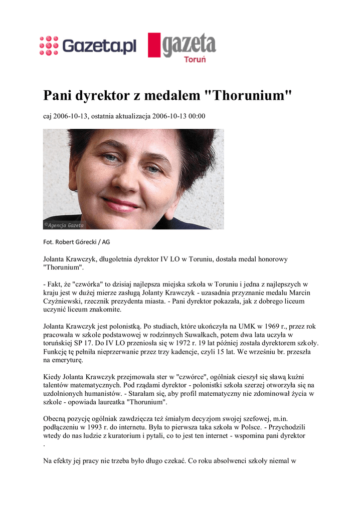 Pani dyrektor z medalem "Thorunium" caj 2006-10-13, ostatnia aktualizacja 2006-10-13 00:00 Fot. Robert Górecki / AG Jolanta Krawczyk, długoletnia dyrektor IV LO w Toruniu, dostała medal honorowy "Thorunium". - Fakt, że "czwórka" to dzisiaj najlepsza miejska szkoła w Toruniu i jedna z najlepszych w kraju jest w dużej mierze zasługą Jolanty Krawczyk - uzasadnia przyznanie medalu Marcin Czyżniewski, rzecznik prezydenta miasta. - Pani dyrektor pokazała, jak z dobrego liceum uczynić liceum znakomite. Jolanta Krawczyk jest polonistką. Po studiach, które ukończyła na UMK w 1969 r., przez rok pracowała w szkole podstawowej w rodzinnych Suwałkach, potem dwa lata uczyła w toruńskiej SP 17. Do IV LO przeniosła się w 1972 r. 19 lat później została dyrektorem szkoły. Funkcję tę pełniła nieprzerwanie przez trzy kadencje, czyli 15 lat. We wrześniu br. przeszła na emeryturę. Kiedy Jolanta Krawczyk przejmowała ster w "czwórce", ogólniak cieszył się sławą kuźni talentów matematycznych. Pod rządami dyrektor - polonistki szkoła szerzej otworzyła się na uzdolnionych humanistów. - Starałam się, aby profil matematyczny nie zdominował życia w szkole - opowiada laureatka "Thorunium". Obecną pozycję ogólniak zawdzięcza też śmiałym decyzjom swojej szefowej, m.in. podłączeniu w 1993 r. do internetu. Była to pierwsza taka szkoła w Polsce. - Przychodzili wtedy do nas ludzie z kuratorium i pytali, co to jest ten internet - wspomina pani dyrektor . Na efekty jej pracy nie trzeba było długo czekać. Co roku absolwenci szkoły niemal w komplecie dostają się na studia wyższe, a kilkunastu otrzymuje indeksy za zwycięstwa w olimpiadach naukowych i przedmiotowych. Pod rządami Krawczyk IV LO regularnie plasowało się czołówce zestawień najlepszych szkół w kraju. Najwyżej - na drugiej pozycji - ogólniak był w 1998 r.