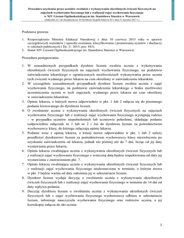 Procedura uzyskania przez uczniów zwolnień z wykonywania określonych ćwiczeń fizycznych na zajęciach wychowania fizycznego lub z realizacji zajęć wychowania fizycznego w XIV Liceum Ogólnokształcącym im. Stanisława Staszica w Warszawie (Załącznik nr 1 do Zarządzenia nr 29 Dyrektora Zespołu Szkół nr 82 z dnia 31 stycznia 2017 r.) Podstawa prawna: 1. Rozporządzenie Ministra Edukacji Narodowej z dnia 10 czerwca 2015 roku w sprawie szczegółowych warunków i sposobu oceniania, klasyfikowania i promowania uczniów i słuchaczy w szkołach publicznych ( Dz. U. 2015, poz. 843). 2. Statut XIV Liceum Ogólnokształcącego im. Stanisława Staszica w Warszawie. Procedura postępowania: 1. W uzasadnionych przypadkach dyrektor liceum zwalnia ucznia z wykonywania określonych ćwiczeń fizycznych na zajęciach wychowania fizycznego, na podstawie zaświadczenia lekarskiego o ograniczonych możliwościach wykonywania przez ucznia tych ćwiczeń wydanego przez lekarza na czas określony w zaświadczeniu lekarskim. 2. W szczególnie uzasadnionych przypadkach dyrektor liceum zwalnia ucznia z zajęć wychowania fizycznego, na podstawie zaświadczenia lekarskiego o braku możliwości uczestniczenia ucznia w tych zajęciach, wydanego przez lekarza na czas określony w zaświadczeniu lekarskim. 3. Opinie lekarza, o których mowa odpowiednio w pkt. 1 lub 2 załącza się do pisemnego podania kierowanego do dyrektora liceum. 4. O zwolnienie ucznia z wykonywania określonych ćwiczeń fizycznych na zajęciach wychowania fizycznego lub z realizacji zajęć wychowania fizycznego występują rodzice – w przypadku uczniów niepełnoletnich lub uczniowie pełnoletni, składając podanie (odpowiednio załącznik nr 1 lub nr 2 i 2a) do dyrektora liceum za pośrednictwem wychowawcy klasy, do którego załączają opinię lekarza. 5. Podanie wraz z opinią lekarza, o której mowa odpowiednio w pkt. 1 lub 2 należy przedłożyć dyrektorowi liceum za pośrednictwem wychowawcy klasy niezwłocznie po uzyskaniu zaświadczenia od lekarza, jednak nie później niż do 7 dni, licząc od jej daty wystawienia przez lekarza. 6. Opinia lekarza zwalniająca ucznia z wykonywania określonych ćwiczeń fizycznych lub z realizacji zajęć wychowania fizycznego z wsteczną datą będzie respektowana od daty jej wystawienia z zastrzeżeniem pkt. 7. 7. Opinia lekarza zwalniająca ucznia z wykonywania określonych ćwiczeń fizycznych lub z realizacji zajęć wychowania fizycznego niedostarczona w terminie, o którym mowa w pkt. 5 będzie ważna od daty założenia jej w sekretariacie liceum. 8. Dyrektor liceum wydaje decyzję o zwolnieniu ucznia z wykonywania określonych ćwiczeń fizycznych lub z realizacji zajęć wychowania fizycznego w terminie do 14 dni od daty wpływu podania. 9. Decyzję dyrektora liceum o zwolnieniu ucznia z wykonywania określonych ćwiczeń fizycznych lub z zajęć wychowania fizycznego wychowawca odbiera w sekretariacie liceum, informuje nauczyciela wychowania fizycznego oraz rodziców ucznia, a jej kserokopię załącza do akt ucznia. 1 Procedura uzyskania przez uczniów zwolnień z wykonywania określonych ćwiczeń fizycznych na zajęciach wychowania fizycznego lub z realizacji zajęć wychowania fizycznego w XIV Liceum Ogólnokształcącym im. Stanisława Staszica w Warszawie (Załącznik nr 1 do Zarządzenia nr 29 Dyrektora Zespołu Szkół nr 82 z dnia 31 stycznia 2017 r.) 10. W przypadku decyzji odmownej rodzice (prawni opiekunowie) mogą odwołać się za pośrednictwem dyrektora liceum do Mazowieckiego Kuratora Oświaty. 11. Jeżeli okres zwolnienia ucznia z realizacji zajęć wychowania fizycznego, uniemożliwia ustalenie śródrocznej lub rocznej oceny klasyfikacyjnej, w dokumentacji przebiegu nauczania zamiast oceny klasyfikacyjnej wpisuje się „ zwolniony” albo „ zwolniona”. 12. Uczeń niećwiczący ma obowiązek być obecnym na tych zajęciach i pozostaje pod opieką nauczyciela prowadzącego te zajęcia. Uczeń korzystający ze zwolnienia z określonych ćwiczeń lub z zajęć wychowania fizycznego na podstawie decyzji dyrektora liceum ma obowiązek uczestniczyć w zajęciach teoretycznych ze swoją klasą a w pozostałych dniach powinien zgłosić się do biblioteki szkolnej, gdzie zostanie odnotowana jego obecność w szkole. Uczeń może być zwolniony z tego obowiązku i uzyskać zgodę, np. na wychodzenie w tym czasie do domu na podstawie pisemnego oświadczenia składanego do dyrektora liceum (za poinformowaniem wychowawcy) rodziców lub własnego oświadczenia pełnoletniego ucznia i po uzyskaniu zgody dyrektora liceum (załącznik nr 3). 13. Składający oświadczenie, o którym mowa w pkt. 12 bierze za zwalnianego ucznia pełną odpowiedzialność prawną w czasie trwania zajęć, o zwolnienie z których się ubiega. Zwolnienie takie jest możliwe wyłącznie w przypadku pierwszych lub ostatnich godzin w planie lekcji ucznia. O tym fakcie informowani są: nauczyciel wychowania fizycznego oraz wychowawca klasy, którzy potwierdzają przyjęcie jej do wiadomości własnoręcznym podpisem na odpisie decyzji dyrektora pozostającej rejestrze zwolnień w sekretariacie szkoły. 14. Uczeń zwalniany z zajęć do domu ma oznaczone w dzienniku lekcyjnym nieobecności usprawiedliwione. 15. Z niniejszą procedurą wychowawca danego oddziału zapoznaje uczniów do dnia 15 września danego roku szkolnego, natomiast rodziców (opiekunów prawnych) na pierwszym zebraniu z rodzicami w danym roku szkolnym. Załącznik nr 1 - Wzór podania o zwolnienie z wykonywania określonych ćwiczeń fizycznych na zajęciach wychowania fizycznego. Załącznik nr 2 i 2a – Wzór podania o zwolnienie z zajęć wychowania fizycznego wraz z oświadczeniem. 2 Procedura uzyskania przez uczniów zwolnień z wykonywania określonych ćwiczeń fizycznych na zajęciach wychowania fizycznego lub z realizacji zajęć wychowania fizycznego w XIV Liceum Ogólnokształcącym im. Stanisława Staszica w 
