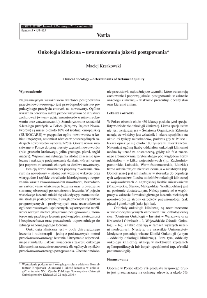 NOWOTWORY Journal of Oncology • 2010 • volume 60 Number 5 • 453–455 Varia Onkologia kliniczna – uwarunkowania jakości postępowania* Maciej Krzakowski Clinical oncology – determinants of tretament quality Wprowadzenie Najważniejszym wskaźnikiem wartości postępowania przeciwnowotworowego jest prawdopodobieństwo populacyjnego przeżycia chorych na nowotwory. Ogólne wskaźniki przeżycia zależą przede wszystkim od struktury zachorowań (w tym – udział nowotworów o różnym rokowaniu oraz zaawansowaniu). Standaryzowane wskaźniki 5-letniego przeżycia w Polsce (Krajowy Rejestr Nowotworów) są niższe o około 10% od średniej europejskiej (EUROCARE) w przypadku ogółu nowotworów u kobiet i mężczyzn, natomiast różnice w poszczególnych rodzajach nowotworów wynoszą 1-25%. Gorsze wyniki uzyskiwane w Polsce dotyczą niestety częstych nowotworów (rak: gruczołu krokowego, jelita grubego, piersi, szyjki macicy). Wspomniana sytuacja ma istotne znaczenie społeczne i nakazuje podejmowanie działań, których celem jest poprawa rokowania chorych na złośliwe nowotwory. Istnieją liczne możliwości poprawy rokowania chorych na nowotwory – istotne jest wczesne wykrycie oraz wiarygodne i szybkie określenie histologicznego rozpoznania wraz z zaawansowaniem nowotworu, bezzwłoczne zastosowanie właściwego leczenia oraz prowadzenie starannej obserwacji po zakończeniu leczenia. W pojęciu właściwego leczenia mieści się wielodyscyplinarne ustalenie strategii postępowania, z uwzględnieniem czynników prognostycznych i predykcyjnych oraz uwarunkowań ogólnozdrowotnych i społecznych, wykorzystanie możliwości różnych metod (skojarzone postępowanie), monitorowanie przebiegu leczenia pod względem skuteczności i bezpieczeństwa oraz prowadzenie odpowiedniego do sytuacji wspomagającego leczenia. Onkologia kliniczna jest – obok chirurgicznego leczenia i radioterapii – jedną z podstawowych metod przeciwnowotworowego leczenia. Utrzymanie odpowiedniego standardu i jakości świadczeń z zakresu onkologii klinicznej ma zasadnicze znaczenie dla ogólnych wyników przeciwnowotworowego postępowania. Obecne omówie- nie przedstawia najważniejsze czynniki, które warunkują zachowanie i poprawę jakości postępowania w zakresie onkologii klinicznej – w skrócie prezentuje obecny stan oraz kierunki zmian. Lekarze i ośrodki W Polsce obecnie około 450 lekarzy posiada tytuł specjalisty w dziedzinie onkologii klinicznej. Liczba specjalistów nie jest wystarczająca – Światowa Organizacja Zdrowia uznaje, że właściwy jest wskaźnik 1 lekarz-specjalista na około 65 tysięcy mieszkańców, podczas gdy w Polsce 1 lekarz opiekuje się około 100 tysiącami mieszkańców. Natomiast ogólną liczbę oddziałów onkologii klinicznej można by uznać za dostateczną, gdyby nie fakt znacznego zróżnicowania terytorialnego pod względem liczby oddziałów – w kilku województwach (np. Zachodniopomorskie, Lubuskie, Warmińskomazurskie, Łódzkie) liczba oddziałów jest niedostateczna, a w niektórych (np. Dolnośląskie) jest ich nadmiar w stosunku do populacji tych województw. Liczba oddziałów onkologii klinicznej w województwach o największej liczbie mieszkańców (Mazowieckie, Śląskie, Małopolskie, Wielkopolskie) jest na poziomie dostatecznym. Należy pamiętać o współpracy w zakresie farmakologicznego leczenia niektórych nowotworów ze strony ośrodków pneumonologii (rak płuca) i ginekologii (raka jajnika). Oddziały onkologii klinicznej są rozmieszczone w wielospecjalistycznych ośrodkach tzw. onkologicznej sieci (Centrum Onkologii – Instytut w Warszawie oraz Krakowie i Gliwicach – 3, Wojewódzkie Ośrodki Onkologii – 16), a także działają w ramach wyższych uczelni medycznych. Niestety, nie wszystkie Uniwersytety Medyczne posiadają własne Kliniki Onkologii (w tym – oddziały onkologii klinicznej). Poza tym, oddziały onkologii klinicznej istnieją w niektórych szpitalach ogólnoprofilowych lub innych specjalności (np. ośrodki pneumonologii). Finansowanie * Wystąpienie podczas sesji okrągłego stołu z udziałem Konsultantów Krajowych „Standard i jakość leczenia w onkologii” w trakcie XVI Zjazdu Polskiego Towarzystwa Chirurgii Onkologicznej w Kielcach 20-22 maja 2010 r. Obecnie w Polsce około 7% produktu krajowego brutto jest przeznaczane na ochronę zdrowia, a około 5% 454 wydatków w ochronie zdrowia stanowią środki na onkologię. Porównanie tzw. bezpośrednich kosztów onkologicznej opieki w krajach Unii Europejskiej wskazuje, że w Polsce przeznacza się najmniejszą kwotę w przeliczeniu na mieszkańca (równowartość około 35 euro) – wymienione środki są zdecydowanie nieadekwatne wobec wzrostu kosztów przeciwnowotworowego leczenia (przede wszystkim – leki nowej generacji). Należy pamiętać, że koszt leków (przeciwnowotworowe i wspomagające) stanowi około 10-20% wszystkich wydatków w onkologii. Koszt farmakologicznego leczenia chorych na nowotwory wzrasta o około 20% rocznie, co wynika głównie z wprowadzenia metod ukierunkowanych molekularnie. Z drugiej strony, szersze spektrum możliwości i skuteczność leczenia powoduje wydłużenie czasu przeżycia chorych na wiele nowotworów – nowotwory staje się chorobami przewlekłymi, co skutkuje koniecznością wieloletniej opieki nad chorymi i przyczynia się do zwiększenia finansowych obciążeń. Dominacja kosztów farmakologicznego leczenia chorych na nowotwory jest widoczna w Polsce – ogólne wydatki na onkologię wzrosły o około 50% w ciągu ostatnich 2-3 lat, co było – przede wszystkim – konsekwencją zwiększenia kosztów leków (wzrost – 130%), a w mniejszym stopniu wynikało z przeznaczania większych środków na chirurgiczne leczenie (wzrost – 54%) i radioterapię (wzrost – 39%). W 2009 r. na konwencjonalne (standardowe) leczenie przeciwnowotworowe wydatkowano około 700 milionów złotych, a do wymienionej kwoty n