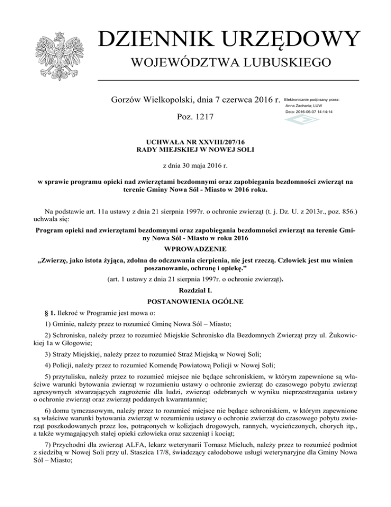 DZIENNIK URZĘDOWY WOJEWÓDZTWA LUBUSKIEGO Gorzów Wielkopolski, dnia 7 czerwca 2016 r. Elektronicznie podpisany przez: Anna Zacharia; LUW Poz. 1217 Data: 2016-06-07 14:14:14 UCHWAŁA NR XXVIII/207/16 RADY MIEJSKIEJ W NOWEJ SOLI z dnia 30 maja 2016 r. w sprawie programu opieki nad zwierzętami bezdomnymi oraz zapobiegania bezdomności zwierząt na terenie Gminy Nowa Sól - Miasto w 2016 roku. Na podstawie art. 11a ustawy z dnia 21 sierpnia 1997r. o ochronie zwierząt (t. j. Dz. U. z 2013r., poz. 856.) uchwala się: Program opieki nad zwierzętami bezdomnymi oraz zapobiegania bezdomności zwierząt na terenie Gminy Nowa Sól - Miasto w roku 2016 WPROWADZENIE „Zwierzę, jako istota żyjąca, zdolna do odczuwania cierpienia, nie jest rzeczą. Człowiek jest mu winien poszanowanie, ochronę i opiekę.” (art. 1 ustawy z dnia 21 sierpnia 1997r. o ochronie zwierząt). Rozdział I. POSTANOWIENIA OGÓLNE § 1. Ilekroć w Programie jest mowa o: 1) Gminie, należy przez to rozumieć Gminę Nowa Sól – Miasto; 2) Schronisku, należy przez to rozumieć Miejskie Schronisko dla Bezdomnych Zwierząt przy ul. Żukowickiej 1a w Głogowie; 3) Straży Miejskiej, należy przez to rozumieć Straż Miejską w Nowej Soli; 4) Policji, należy przez to rozumieć Komendę Powiatową Policji w Nowej Soli; 5) przytulisku, należy przez to rozumieć miejsce nie będące schroniskiem, w którym zapewnione są właściwe warunki bytowania zwierząt w rozumieniu ustawy o ochronie zwierząt do czasowego pobytu zwierząt agresywnych stwarzających zagrożenie dla ludzi, zwierząt odebranych w wyniku nieprzestrzegania ustawy o ochronie zwierząt oraz zwierząt poddanych kwarantannie; 6) domu tymczasowym, należy przez to rozumieć miejsce nie będące schroniskiem, w którym zapewnione są właściwe warunki bytowania zwierząt w rozumieniu ustawy o ochronie zwierząt do czasowego pobytu zwierząt poszkodowanych przez los, potrąconych w kolizjach drogowych, rannych, wycieńczonych, chorych itp., a także wymagających stałej opieki człowieka oraz szczeniąt i kociąt; 7) Przychodni dla zwierząt ALFA, lekarz weterynarii Tomasz Mieluch, należy przez to rozumieć podmiot z siedzibą w Nowej Soli przy ul. Staszica 17/8, świadczący całodobowe usługi weterynaryjne dla Gminy Nowa Sól – Miasto; Dziennik Urzędowy Województwa Lubuskiego –2– Poz. 1217 8) Przychodni weterynaryjnej Centaur Grzegorz Nowacki, podmiot z siedzibą w Głogowie przy ul. Rycerskiej 23, świadczący usługi odławiania bezdomnych zwierząt pochodzących z terenu Gminy Nowa Sól – Miasto; 9) gospodarstwie rolnym, należy przez to rozumieć gospodarstwo położone Lubieszów 7, 67-100 Nowa Sól, w którym zapewnione jest miejsce dla zwierząt gospodarskich; 10) zwierzętach bezdomnych, należy przez to rozumieć zwierzęta domowe lub gospodarskie, które uciekły, zabłąkały się lub zostały porzucone przez człowieka, a nie ma możliwości ustalenia ich właściciela lub innej osoby, pod której opieką trwale dotąd pozostawały; 11) zwierzętach domowych, należy przez to rozumieć zwierzęta tradycyjnie przebywające wraz z człowiekiem w jego domu lub odpowiednim pomieszczeniu, utrzymywane przez człowieka w charakterze jego towarzysza; 12) kotach wolno żyjących, należy przez to rozumieć koty urodzone lub żyjące na wolności (żyjące w otoczeniu człowieka w stanie dzikim); 13) Programie, należy przez to rozumieć Program opieki nad zwierzętami bezdomnymi oraz zapobiegania bezdomności zwierząt na terenie Gminy Nowa Sól-Miasto w 2016 roku. Rozdział II. CEL, ZADANIA I WYKONAWCY PROGRAMU § 2. 1. Celem Programu jest zapobieganie bezdomności zwierząt na terenie Gminy oraz opieka nad zwierzętami bezdomnymi. 2. Zadania priorytetowe Programu to: 1) elektroniczne znakowanie (czipowanie) psów; 2) obligatoryjna sterylizacja albo kastracja zwierząt w Schronisku; 3) usypianie ślepych miotów; 4) zapewnienie opieki bezdomnym zwierzętom z Gminy; a) sprawowanie opieki nad kotami wolno żyjącymi, w tym ich dokarmianie, b) poszukiwanie nowych właścicieli dla bezdomnych zwierząt; 5) zapewnienie całodobowej opieki weterynaryjnej w przypadkach zdarzeń drogowych z udziałem zwierząt; 6) odławianie bezdomnych zwierząt. 3. Wykonawcami programu są: 1) Gmina; 2) Straż Miejska i Policja; 3) Organizacje społeczne, których statutowym celem działania jest ochrona zwierząt; 4) Miejskie Schronisko dla Bezdomnych Zwierząt przy ul. Żukowickiej 1a w Głogowie; 5) Przychodnia dla zwierząt ALFA, lek. wet. Tomasz Mieluch przy ul. Staszica 17/8 w Nowej Soli; 6) Przychodnia weterynaryjna Centaur Grzegorz Nowacki, przy ul. Rycerskiej 23 w Głogowie; 7) Gospodarstwo rolne położone w Lubieszów 7, 67-100 Nowa Sól, Rozdział III. ELEKTRONICZNE ZNAKOWANIE (CZIPOWANIE) PSÓW § 3. Elektroniczne znakowanie (czipowanie) zwierząt to jedna z głównych metod zapobiegania bezdomności zwierząt, realizowana przez: 1) Gminę poprzez: Dziennik Urzędowy Województwa Lubuskiego –3– Poz. 1217 a) prowadzenie od 2009 roku akcji bezpłatnego czipowania psów, których właściciele zamieszkują na terenie Gminy oraz bezdomnych psów z terenu Gminy, b) wprowadzanie danych o zaczipowanych zwierzętach do bazy Safe-Animal, zrzeszonej w European Pet Network; 2) Schronisko poprzez: a) znakowanie (czipowanie) bezdomnych zwierząt przyjmowanych do Schroniska, b) bieżące wprowadzanie danych o zaczipowanych zwierzętach do Międzynarodowej Bazy Danych SafeAnimal, zrzeszonej w European Pet Network. Rozdział IV. STERYLIZACJA ALBO KASTRACJA BEZDOMNYCH ZWIERZĄT § 4. 1. Gmina realizuje obligatoryjną sterylizację albo kastrację zwierząt w Schronisku. 2. Zabiegom, o których mowa w ust. 1, nie podlegają: 1) zwierzęta w okresie 14 dni od umieszczenia ich w Schronisku, z uwagi na możliwość zgłoszenia się właściciela lub opiekuna; 2) zwierzęta, u których istnieją przeciwwskazania do wykonania zabiegów z uwagi na stan zdrowia lub wiek. R