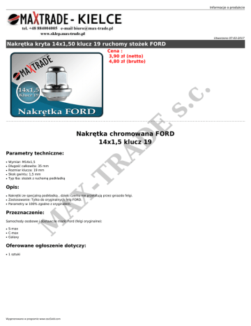 Informacje o produkcie Utworzono 07-03-2017 Nakrętka kryta 14x1,50 klucz 19 ruchomy stożek FORD E s. c. Cena : 3,90 zł (netto) 4,80 zł (brutto) AD Nakrętka chromowana FORD 14x1,5 klucz 19 ● ● ● ● ● Wymiar: M14x1,5 Długość całkowita: 35 mm Rozmiar klucza: 19 mm Skok gwintu: 1,5 mm Typ łba: stożek z ruchomą podkładką Opis: ● ● Nakrętki ze specjalną podkładką , dzięki czemu nie przelatują przez gniazdo felgi. Zastosowanie: Tylko do oryginalnych felg FORD. Parametry w 100% zgodne z oryginałem. Przeznaczenie: AX ● -T R Parametry techniczne: ● ● ● S-max C-max Galaxy M Samochody osobowe i dostawcze marki Ford (felgi oryginalne): Oferowane ogłoszenie dotyczy: ● 1 sztuki Wygenerowano w programie www.oscGold.com AD -T R AX M E s. c. M AX -T R AD E s. c. Informacje o produkcie Wygenerowano w programie www.oscGold.com AD -T R AX M E s. c.