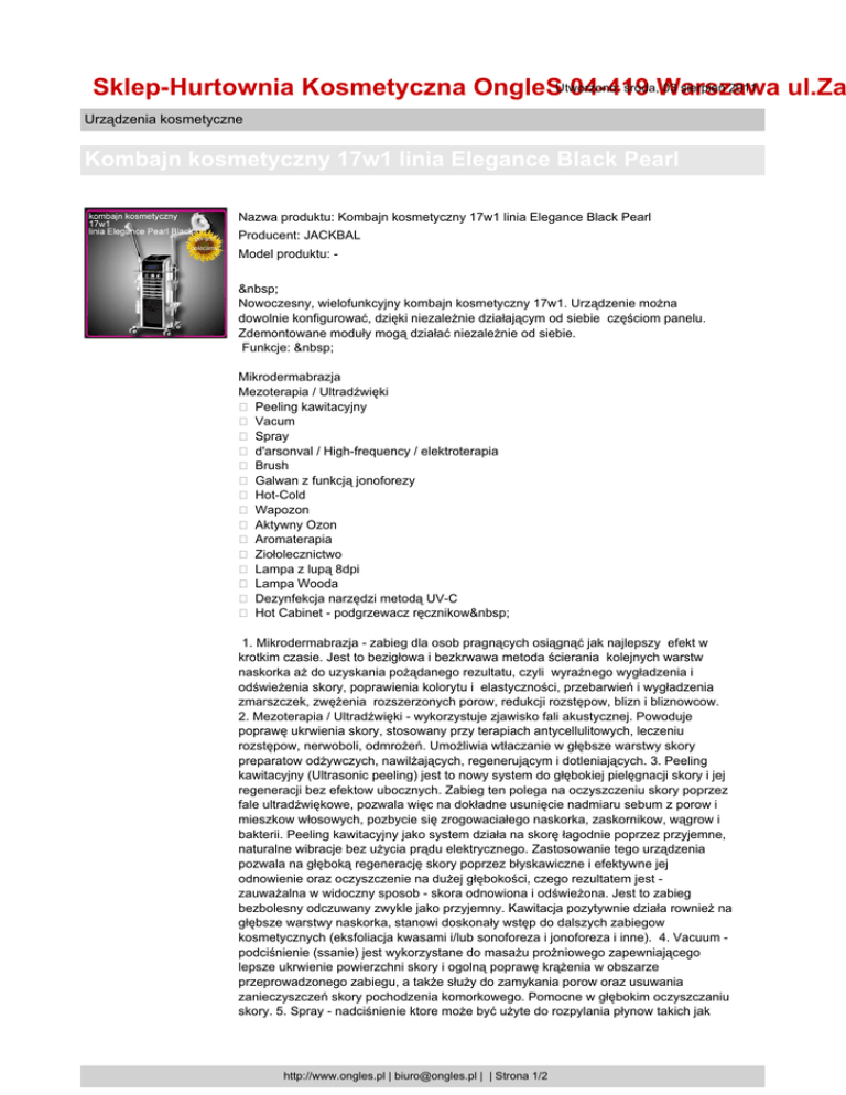 środa,Warszawa 03 sierpień 2011 Sklep-Hurtownia Kosmetyczna OngleSUtworzono: 04-419 ul.Za Urządzenia kosmetyczne Kombajn kosmetyczny 17w1 linia Elegance Black Pearl Nazwa produktu: Kombajn kosmetyczny 17w1 linia Elegance Black Pearl Producent: JACKBAL Model produktu: Nowoczesny, wielofunkcyjny kombajn kosmetyczny 17w1. Urządzenie można dowolnie konfigurować, dzięki niezależnie działającym od siebie częściom panelu. Zdemontowane moduły mogą działać niezależnie od siebie. Funkcje: Mikrodermabrazja Mezoterapia / Ultradźwięki Peeling kawitacyjny Vacum Spray d'arsonval / High-frequency / elektroterapia Brush Galwan z funkcją jonoforezy Hot-Cold Wapozon Aktywny Ozon Aromaterapia Ziołolecznictwo Lampa z lupą 8dpi Lampa Wooda Dezynfekcja narzędzi metodą UV-C Hot Cabinet - podgrzewacz ręcznikow 1. Mikrodermabrazja - zabieg dla osob pragnących osiągnąć jak najlepszy efekt w krotkim czasie. Jest to bezigłowa i bezkrwawa metoda ścierania kolejnych warstw naskorka aż do uzyskania pożądanego rezultatu, czyli wyraźnego wygładzenia i odświeżenia skory, poprawienia kolorytu i elastyczności, przebarwień i wygładzenia zmarszczek, zwężenia rozszerzonych porow, redukcji rozstępow, blizn i bliznowcow. 2. Mezoterapia / Ultradźwięki - wykorzystuje zjawisko fali akustycznej. Powoduje poprawę ukrwienia skory, stosowany przy terapiach antycellulitowych, leczeniu rozstępow, nerwoboli, odmrożeń. Umożliwia wtłaczanie w głębsze warstwy skory preparatow odżywczych, nawilżających, regenerującym i dotleniających. 3. Peeling kawitacyjny (Ultrasonic peeling) jest to nowy system do głębokiej pielęgnacji skory i jej regeneracji bez efektow ubocznych. Zabieg ten polega na oczyszczeniu skory poprzez fale ultradźwiękowe, pozwala więc na dokładne usunięcie nadmiaru sebum z porow i mieszkow włosowych, pozbycie się zrogowaciałego naskorka, zaskornikow, wągrow i bakterii. Peeling kawitacyjny jako system działa na skorę łagodnie poprzez przyjemne, naturalne wibracje bez użycia prądu elektrycznego. Zastosowanie tego urządzenia pozwala na głęboką regenerację skory poprzez błyskawiczne i efektywne jej odnowienie oraz oczyszczenie na dużej głębokości, czego rezultatem jest zauważalna w widoczny sposob - skora odnowiona i odświeżona. Jest to zabieg bezbolesny odczuwany zwykle jako przyjemny. Kawitacja pozytywnie działa rownież na głębsze warstwy naskorka, stanowi doskonały wstęp do dalszych zabiegow kosmetycznych (eksfoliacja kwasami i/lub sonoforeza i jonoforeza i inne). 4. Vacuum podciśnienie (ssanie) jest wykorzystane do masażu prożniowego zapewniającego lepsze ukrwienie powierzchni skory i ogolną poprawę krążenia w obszarze przeprowadzonego zabiegu, a także służy do zamykania porow oraz usuwania zanieczyszczeń skory pochodzenia komorkowego. Pomocne w głębokim oczyszczaniu skory. 5. Spray - nadciśnienie ktore może być użyte do rozpylania płynow takich jak http://www.ongles.pl | [email protected] | | Strona 1/2 środa,Warszawa 03 sierpień 2011 Sklep-Hurtownia Kosmetyczna OngleSUtworzono: 04-419 ul.Za Urządzenia kosmetyczne Kombajn kosmetyczny 17w1 linia Elegance Black Pearl toniki, wody lub olejki zapachowe czy inne preparaty kosmetyczne ( np. preparaty do opalania natryskowego) oraz do nawilżania metodą zimnego natrysku. 6. d'arsonval / High-Frequency / elektroterapia - umożliwia wykonywanie elektromasaży z wykorzystaniem tzw. prądow d'Arsonvala. Występujące przy kontakcie szklanej elektrody ze skorą iskrzenie ma wpływ pobudzający na skorę i tkanki podskorne, mięśnie oraz pośrednio na narządy wewnętrzne, a wytwarzany przy zabiegu ozon ma działanie bakteriobojcze. Działanie ładunkow elektrycznych powoduje rozszerzenie naczyń krwionośnych skory, przyspiesza przemianę materii, co jest ważnym czynnikiem zwiększenia absorbcji substancji odżywczych i leczniczych zawartych w preparatach kosmetycznych. 7. Brush - umożliwia perfekcyjny masaż skory oraz wspomaga peeling w dowolnym miejscu ciała. Przez możliwość stosowania wymiennych, rożnorodnych nasadek daje nieocenione wsparcie w zabiegach kosmetycznych, zwiększając intensywność oddziaływania substancji czynnych zawartych w kosmetykach jak i przyśpieszając ich działanie. Wzrasta przez to skuteczność zabiegu i skraca się wydatnie jego wykonanie. 8. Galwan - służy do galwanizacji i jonoforezy oraz innych zabiegow kosmetycznych wykorzystujących oddziaływania prądu galwanicznego na tkanki. Może być stosowany przy nerwobolach, przewlekłych zapaleniach nerwow, zaburzeniach naczyniowych, odmrożeniach, trądziku rożowatym i pospolitym, zwiotczeniach skory i mięśni, bliznach, uczuleniach i innych schorzeniach, przy usuwaniu ktorych korzysta się z pozytywnego oddziaływania prądu galwanicznego na organizm ludzki. 9. Hot-Cold- czyli głowica Ciepło-Zimno. Głowica rozgrzewająca stosowana przed zabiegiem w celu rozszerzenia naczyń krwionośnych i szybkiego wchłonięcia substancji odżywczych. Po zabiegu, głowica chłodząca łagodzi końcowki nerwowe, podrażnienia i zaczerwienienia skory oraz zamyka pory. 10. Wapozon, ozon, aromaterapia - Nawilża skorę za pomocą pary, zmiękcza skorę, otwiera pory, rozluźnia mięśnie twarzy co ułatwia zabieg oczyszczania oraz przygotowuje skorę do dalszych zabiegow. Umożliwia stosowania aromaterapii oraz ziołoterapii. Dodatkowy ozon działa bakteriobojczo. 11. Lampa z lupą - Łatwa do ustawienia lampa powiększająca, posiada wysokiej jakości refrakcyjne szkło powiększające oraz wbudowany system oświetlający, ktore pozwalają na optymalne diagnozowanie skory. Głowica lampy umieszczona jest na wysięgniku, ułatwiającym jej ustawienie na określoną odległość i wysokość. Ułatwia pracę podczas zabiegow kosmetycznych. 12. Lampa Wooda - Specjalna lampa emitująca długofalowe promieniowanie ultrafioletowe, dająca możliwość dokładnego obejrzenia skory. W zależności od