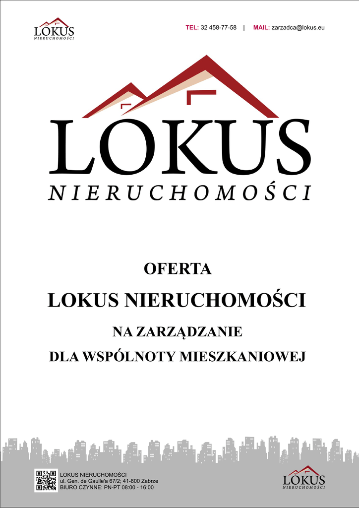 TEL: 32 458-77-58 | MAIL: [email protected] Oferta Firmy Lokus Nieruchomości na Zarządzanie dla Wspólnot Mieszkaniowych OFERTA LOKUS NIERUCHOMOŚCI NA ZARZĄDZANIE DLA WSPÓLNOTY MIESZKANIOWEJ LOKUS NIERUCHOMOŚCI ul. Gen. de Gaulle'a 67/2; 41-800 Zabrze BIURO CZYNNE: PN-PT 08:00 - 16:00 TEL: 32 458-77-58 | MAIL: [email protected] Firma Lokus Nieruchomości od 2008 roku dynamicznie działa na lokalnym rynku nieruchomości. Dziś Lokus Nieruchomości to znana i ceniona marka. Naszą firmę tworzą doświadczeni ludzie cechujący się dużym zaangażowaniem i wysoką kulturą osobistą. Stale podnosimy nasze kwalifikacje zawodowe, aby zapewnić Państwu najwyższą jakość świadczonych usług. Specjalizujemy się w obsłudze wspólnot mieszkaniowych oraz nieruchomości należących do prywatnych właścicieli. Nasi pracownicy posiadają licencje zawodowe zarządców nieruchomości. Jesteśmy objęci ubezpieczeniem od odpowiedzialności cywilnej z tytułu wykonywania czynności zarządzania nieruchomościami. Naszą misją jest zapewnienie naszym Klientom poczucia bezpieczeństwa oraz osiągnięcie satysfakcjonującego poziomu kosztów utrzymania nieruchomości poprzez dostarczenie pakietu usług najwyższej klasy. Zarządzamy w oparciu o nowoczesne narzędzia poprzez autorski system do zarządzania nieruchomościami oraz możliwość komunikacji za pomocą poczty elektronicznej. Współpraca z nami jest wygodna i bezpieczna. Dodatkowo świadczymy usługi w zakresie pośrednictwa w obrocie nieruchomościami, doradztwa kredytowego i ubezpieczeniowego, aranżacji wnętrz, projektowania, remontów wnętrz oraz opróżniania nieruchomości. Lokus Nieruchomości oferuje pełen pakiet usług niezbędnych do prawidłowego zarządzania nieruchomością, które można podzielić na pięć podstawowych grup: obsługa prawna, obsługa księgowa i bankowa, obsługa techniczna, obsługa administracyjna, zawieranie umów. Wspólnoty Mieszkaniowe, które zawarły z Lokus Nieruchomości umowę o zarządzanie mają zapewnione wszystkie usługi zawarte w w/w. grupach w ramach kompleksowej obsługi nieruchomości. LOKUS NIERUCHOMOŚCI ul. Gen. de Gaulle'a 67/2; 41-800 Zabrze BIURO CZYNNE: PN-PT 08:00 - 16:00 TEL: 32 458-77-58 | MAIL: [email protected] OBSŁUGA PRAWNA: Lokus Nieruchomości współpracuje ze sprawdzoną kancelarią prawną specjalizującą się w tematyce związanej z rynkiem nieruchomości, której na podstawie odrębnego zlecenia można powierzyć prowadzenie spraw sądowych. W ramach obsługi prawnej zapewniamy: organizację wspólnoty mieszkaniowej, weryfikację stanu prawnego i faktycznego nieruchomości, kontrolę i egzekwowanie obowiązków wynikających z umów zawieranych z dostawcami mediów oraz podwykonawcami, pomoc i obsługę prawną w przypadku ewentualnych sporów z podwykonawcami z tytułu wykonywanych przez nich umów. OBSŁUGA KSIĘGOWA I BANKOWA: Każda wspólnota jest samodzielna pod względem finansowym co oznacza, że posiada niezależne konta bankowe. W wyniku stosowania tych zasad rozliczenia finansowe w poszczególnych nieruchomościach są przejrzyste i czytelne. Obsługa księgowa i bankowa obejmuje następujące czynności: wystawianie faktur dla najemców, dzierżawców i pozostałych użytkowników nieruchomości, kontrolę finansów wspólnoty oraz obsługę rachunku bankowego wspólnoty, prowadzenie indywidualnych rozliczeń mediów dla poszczególnych właścicieli lokali, windykację należności stanowiących pożytki i inne przychody z nieruchomości niezwłocznie po wystąpieniu zaległości w ich wpłacaniu przez zobowiązane strony, prowadzenie ksiąg rachunkowych w wersji elektronicznej, wykonywanie sprawozdania dla Głównego Urzędu Statystycznego, sporządzanie sprawozdania rocznego wraz z deklaracją dla Urzędu Skarbowego, przechowywanie dokumentacji statystycznej i księgowej wspólnoty, sporządzanie rocznych planów gospodarczych. LOKUS NIERUCHOMOŚCI ul. Gen. de Gaulle'a 67/2; 41-800 Zabrze BIURO CZYNNE: PN-PT 08:00 - 16:00 TEL: 32 458-77-58 | MAIL: [email protected] OBSŁUGA TECHNICZNA: Obsługa techniczna obejmuje następujące czynności: dbanie o stan techniczny nieruchomości w oparciu o przepisy ustawy Prawo budowlane, prowadzenie dokumentacji technicznej nieruchomości, zlecanie przeglądów rocznych oraz pięcioletnich przeglądów budowlanych nieruchomości zgodnie z przepisami ustawy Prawo budowlane, zapewnianie prawidłowej gospodarki remontowo – budowlanej, bieżącą konserwację nieruchomości oraz znajdujących się w niej urządzeń, zlecanie i kontrolę bieżących napraw i konserwacji budynku, przygotowywanie planów remontów, wyszukiwanie wykonawców robót budowlanych, negocjowanie cen i warunków umów, przedkładanie najkorzystniejszych ofert, nadzór nad pracami firm wykonujących remonty i modernizacje oraz uczestnictwo w komisji przy odbiorze ilościowym i jakościowym wykonywanych robót i usług. OBSŁUGA ADMINISTRACYJNA: Obsługa administracyjna obejmuje następujące czynności: weryfikację wpłacanych czynszów i opłat związanych z najmem lokali, dzierżawą gruntów, opłat za reklamy i z innych tytułów, prowadzenie spraw związanych z ewidencją lokatorów oraz udziałami w nieruchomości wspólnej przypadającymi właścicielom lokali, organizację zebrań wspólnoty w miarę potrzeby, nie rzadziej jednak niż raz w roku, zapewnianie członkom wspólnoty dostępu do dokumentacji związanej z funkcjonowaniem nieruchomości, informowanie członków wspólnoty o zmianach wysokości opłat na rzecz wspólnoty oraz innych podmiotów, informowanie członków wspólnoty o brakach, szkodach i zaniedbaniach podlegających LOKUS NIERUCHOMOŚCI ul. Gen. de Gaulle'a 67/2; 41-800 Zabrze BIURO CZYNNE: PN-PT 08:00 - 16:00 TEL: 32 458-77-58 | MAIL: [email protected] obowiązkowi usunięcia, składanie rocznych sprawozdań dotyczących zarządzanej nieruchomości najpóźniej do końca pierwszego kwartału każdego r