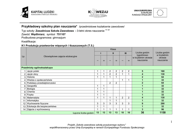 Przykładowy szkolny plan nauczania* /przedmiotowe kształcenie zawodowe/ Typ szkoły: Zasadnicza Szkoła Zawodowa - 3-letni okres nauczania /1/ /2/ Zawód: Wędliniarz; symbol 751107 Podbudowa programowa: gimnazjum Kwalifikacje: K1 Produkcja przetworów mięsnych i tłuszczowych (T.5.) Klasa I III II I II I II Obowiązkowe zajęcia edukacyjne I Lp. II 1 1 1 1 1 1 2 2 1 2 2 1 2 1 2 1 Liczba godzin tygodniowo w trzyletnim okresie nauczania Liczba godzin w trzyletnim okresie nauczania 5 4 2 1 2 1 1 1 1 4 1 9 1 3 160 130 64 32 64 32 32 32 32 130 32 290 32 96 36 1158 Przedmioty ogólnokształcące 1 2 3 4 5 6 7 8 9 10 11 12 13 14 Język polski Język obcy Historia Wiedza o społeczeństwie Podstawy przedsiębiorczości Geografia Biologia Chemia Fizyka Matematyka Informatyka Wychowanie fizyczne Edukacja dla bezpieczeństwa Zajęcia z wychowawcą Łączna liczba godzin 1 1 1 1 1 1 1 1 1 1 3 1 1 13 3 1 1 13 1 1 1 1 3 2 2 3 3 1 13 1 10 1 10 2 2 1 1 3 1 13 1 Projekt „Szkoła zawodowa szkołą pozytywnego wyboru” współfinansowany przez Unię Europejską w ramach Europejskiego Funduszu Społecznego Przedmioty w kształceniu zawodowym teoretycznym 1 Technika w przetwórstwie mięsa 2 Technologie produkcji przetworów mięsnych i tłuszczowych 3 3 2 2 3 3 4 4 3 Podstawy działalności gospodarczej 4 Język obcy zawodowy Łączna liczba godzin Przedmioty w kształceniu zawodowym praktycznym ** 1 Gospodarka magazynowa w zakładzie przetwórstwa mięsa 2 Pracownia technologiczna – zajęcia praktyczne Łączna liczba godzin Tygodniowy wymiar godzin obowiązkowych zajęć edukacyjnych 6 6 6 6 8 27 10 10 10 10 29 160 4 4 11 352 3 3 3 96 1 1 1 32 8 8 20 640 4 138 26 832 30 970 86 2768 8 8 8 5 12 12 12 12 30 /1/ (do celów obliczeniowych przyjęto 32 tygodnie w ciągu jednego roku szkolnego) w zasadniczej szkole zawodowej praktyczna nauka zawodu realizowana jest w formie zajęć praktycznych *w szkolnym planie uwzględnia się również wymiar godzin zajęć określonych w par. 4 ust. 2 rozporządzenia w sprawie ramowych planów nauczania, t.j. m.in. religii lub etyki oraz wychowania do życia w rodzinie. /2/ ** dla młodocianych pracowników wymiar godzin określają przepisy Kodeksu Pracy Egzamin potwierdzający kwalifikację (K1) odbywa się pod koniec drugiego semestru klasy trzeciej 2 Projekt „Szkoła zawodowa szkołą pozytywnego wyboru” współfinansowany przez Unię Europejską w ramach Europejskiego Funduszu Społecznego Tabela efektów kształcenia X X X X X X X X X X X X X X X X X X X (10) rozpoznaje instalacje techniczne stosowane w zakładach przetwórstwa spożywczego; X X X X (11) rozpoznaje urządzenia do uzdatniania wody, oczyszczania ścieków i powietrza oraz urządzenia energetyczne; X X X X II semestr X Uczeń: I semestr II semestr III I semestr II II semestr I Liczba godzin przeznaczona na realizację efektów kształcenia Klasa I semestr Efekty kształcenia /umiejętności, wiedza oraz kompetencje personalne i społeczne/ Efekty wspólne dla wszystkich zawodów / wspólne dla zawodów w ramach obszaru T/ kwalifikacje Nazwa przedmiotu / pracowni Tabela przyporządkowania poszczególnym przedmiotom efektów kształcenia dla zawodu: Wędliniarz; symbol 751107 Kształcenie zawodowe teoretyczne (6) interpretuje rysunki techniczne i schematy maszyn i urządzeń stosowanych w produkcji wyrobów spożywczych; (7) rozróżnia części oraz zespoły maszyn i urządzeń; (8) rozróżnia maszyny i urządzenia stosowane w produkcji wyrobów spożywczych; (9) posługuje się instrukcjami obsługi maszyn stosowanych w produkcji oraz dokumentacją technologiczną; PKZ (T.b.) Technika w produkcji przetworów mięsnych (1) stosuje przepisy prawa dotyczące produkcji wyrobów spożywczych; 96 3 Projekt „Szkoła zawodowa szkołą pozytywnego wyboru” współfinansowany przez Unię Europejską w ramach Europejskiego Funduszu Społecznego X X X X (1) rozróżnia pojęcia związane z bezpieczeństwem i higieną pracy, ochroną przeciwpożarową, ochroną środowiska i ergonomią; X X X X (2) rozróżnia zadania i uprawnienia instytucji oraz służb działających w zakresie ochrony pracy i ochrony środowiska w Polsce; X X X X (3) określa prawa i obowiązki pracownika oraz pracodawcy w zakresie bezpieczeństwa i higieny pracy; X X X X (4) przewiduje zagrożenia dla zdrowia i życia człowieka oraz mienia i środowiska związane z wykonywaniem zadań zawodowych; X X X X X X X X (6) określa skutki oddziaływania czynników szkodliwych na organizm człowieka; X X X X (7) organizuje stanowisko pracy zgodnie z obowiązującymi wymaganiami ergonomii, przepisami bezpieczeństwa i higieny pracy, ochrony przeciwpożarowej i ochrony środowiska; X X X X (9) przestrzega zasad bezpieczeństwa i higieny pracy oraz stosuje przepisy prawa dotyczące ochrony przeciwpożarowej i ochrony środowiska; X X X X (10) udziela pierwszej pomocy poszkodowanym w wypadkach przy pracy oraz w stanach zagrożenia zdrowia i życia; X X X X X X X X X X 1(1) przestrzega norm i stosuje instrukcje technologiczne dotyczące rozbioru i wykrawania mięsa zwierząt rzeźnych; 1(5) obsługuje maszyny, urządzenia i sprzęt podczas rozbioru i wykrawania mięsa; 2(2) dobiera metody i techniki wychładzania oraz zamrażania mięsa i tłuszczów surowych; T.5. (5) określa zagrożenia związane z występowaniem szkodliwych czynników w środowisku pracy; BHP (12) posługuje się aparaturą kontrolno-pomiarową stosowaną w przetwórstwie spożywczym; 8 56 4 Projekt „Szkoła zawodowa szkołą pozytywnego wyboru” współfinansowany przez Unię Europejską w ramach Europejskiego Funduszu Społecznego 2(4) obsługuje urządzenia i aparaturę kontrolno-pomiarową stosowaną w pomieszczeniach chłodni i zamrażalniach; X X X X 3(4) dobiera maszyny i urządzenia, sprzęt oraz aparaturę kontrolno-pomiarową do produkcji przetworów mięsnych i tłuszczowych; X X 3(6) obsługuje maszyny i urządzenia, sprzęt oraz aparaturę kontrolno-pomi