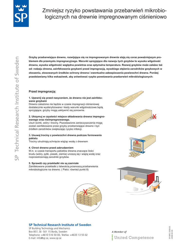 Grzyby przebarwiające drewno, rozwijające się na impregnowanym drewnie stają się coraz poważniejszym problemem dla przemysłu impregnacyjnego. Warunki sprzyjające dla rozwoju tych grzybów to wysoka wilgotność drewna, wysoka wilgotność względna powietrza oraz optymalna temperatura. Rozwoj grzybów może zależec też od: rodzaju drewna, zainfekowania grzybami przed impregnacją, wysokiego stężenia zarodników grzybowych w otoczeniu, stosowanych środków ochrony drewna i ewentualne zabezpieczenia powierzchni drewna. Poniżej przedstawiamy kilka wskazówek, aby zniwelować ryzyko powstawania przebarwień mikrobiologicznych: Przed impregnacją: 1. Upewnij się przed nasyceniem, że drewno nie jest zainfekowane grzybami Drewno zakażone nie będzie w czasie impregnacji ciśnieniowej dostatecznie wysterylizowane i kiedy warunki wilgotnościowe będą sprzyjające, grzyby mogą uaktywnić się ponownie. 8 2. Utrzymuj w czystości miejsce składowania drewna impregnowanego oraz nieimpregnowanego. Usuń ścinki, wióry i trociny. Pozostawione zanieczyszczenia mogą zostać zainfekowane przez grzyby przebarwiające drewno i być źródłem zarodników zwiększając ryzyko infekcji. 3. Usuwaj trociny z powierzchni drewna podczas formowania pakietu Trociny utrudniają schnięcie wiążąc wodę z drewnem 8 4. Chroń drewno przed zabrudzeniem M.in. w czasie transportu pakietów drewna znaczące ilości brudu (wióry, pyłki, piasek, ziemia) unoszą się i wiążą wodę oraz rozprzestrzeniają zarodniki grzybów. 5. Sprawdź czy przekładki nie są zasiniałe Zainfekowane przekładki z łatwością przenoszą przebarwienia mikrobiologiczne na drewno. ( Patrz: również punkt 8) 8 SP Technical Research Institute of Sweden SP Building Technology and Mechanics Box 857, SE- 501 15 Borås, Sweden Telephone: +4610 516 50 00, Telefax: +4633 13 55 02 E-mail: [email protected], www.sp.se SP INFO 2008:05 2008-02-06 SP Technical Research Institute of Sweden Zmniejsz ryzyko powstawania przebarwień mikrobiologicznych na drewnie impregnowanym ciśnieniowo W trakcie impregnacji: 6. Ochrona przed pleśniami w roztworze impregnacyjnym to tylko tymczasowe rozwiązanie Dostępne na rynku środki przeciwpleśniowe, które dodaje się do roztworu impregnacyjnego, działają jedynie przez ograniczony czas i maja głównie za zadanie ochronę drewna przed grzybami przebarwiającymi w okresie schnięcia. Jednakże czas trwania naturalnego procesu suszenia jest zależny od pory roku. Dlatego należy uzgodnić z dostawcą impregnatu, ilosc dozowania środka antypleśniowego. Jeżeli na powierzchni drewna wilgotność wynosi poniżej 25%, wówczas ryzyko infekcji pleśniami uznaje sie za stosunkowo niskie. Suszenie drewna w suszarniach skraca czas, w którym drewno jest ze względu na swoją wilgotność podatne na rozwój pleśni i grzybów przebarwiających drewno. Po impregnacji: 7. Kiedy impregnowane drewno jest suszone w suszarni Pamiętaj o utrzymywaniu czystości w komorach. Szybkie przesuszenie powierzchni drewna minimalizuje ryzyko zapleśnienia. 8. Kiedy impregnowane drewno jest sezonowane Aby ograniczyć zagrożenie zainfekowania drewna grzybami przebarwiającymi drewno, należy zapewnić dobry przepływ powietrza między warstwami drewna w pakiecie. • Zachowaj odstep miedzy pakietami, formuj pakiety wysokie i wąskie, stosuj przekładki możliwie grube najlepiej aż do 32 mm. Zbyt cienkie przekładki ograniczają przepływ powietrza i tym samym zwiększają ryzyko infekcji grzybami pleśniowymi i przebarwiającymi drewno. Przekładki należy umieszczać w ten sposób, by deski nie mogły zginać się, wpadac między nimi i w ten sposób ograniczać cyrkulację powietrza. • Formuj stosy na betonowych podstawach o wysokości 30 do 40 cm w celu zapewnienia przewiewnego składowania. • Układaj stosy wykorzystując przeważnie panujący kierunek wiatru. • Chroń pakiety przed opadami np. składując pod zadaszeniem. Folia, papa lub podobne materiały używane do przykrywania drewna nie powinny leżeć bezpośrednio na drewnie. Mokre drewno nie powinno być pakowane w folię. Składowanie mokrego drewna w zamkniętych pomieszczeniach bez wymiany powietrza zwiększa ryzyko zapleśnienia. 9. Zaimpregnowane drewno chroń przed kurzem i zabrudzeniami ( patrz punkt 4.) Po dostawie 10. Składuj drewno zabezpieczając przed deszczem Drewno musi być po dostawie, zabezpieczone przed wilgocią w celu zapobieżenia atakowi grzybów przebarwiających drewno. Przestrzeganie powyższych zasad, konieczne jest podczas składowania zaimpregnowanego drewna. Pamiętaj także, że działanie środka przeciwpleśniowego szybko słabnie.