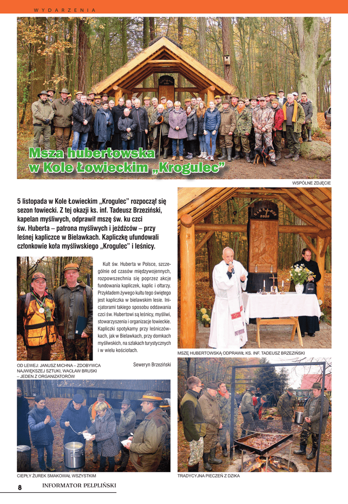 W Y D A R Z E N I A Msza hubertowska w Kole Łowieckim „Krogulec” WSPÓLNE ZDJĘCIE 5 listopada w Kole Łowieckim „Krogulec” rozpoczął się sezon łowiecki. Z tej okazji ks. inf. Tadeusz Brzeziński, kapelan myśliwych, odprawił mszę św. ku czci św. Huberta – patrona myśliwych i jeźdźców – przy leśnej kapliczce w Bielawkach. Kapliczkę ufundowali członkowie koła myśliwskiego „Krogulec” i leśnicy. Kult św. Huberta w Polsce, szczególnie od czasów międzywojennych, rozpowszechnia się poprzez akcje fundowania kapliczek, kaplic i ołtarzy. Przykładem żywego kultu tego świętego jest kapliczka w bielawskim lesie. Inicjatorami takiego sposobu oddawania czci św. Hubertowi są leśnicy, myśliwi, stowarzyszenia i organizacje łowieckie. Kapliczki spotykamy przy leśniczówkach, jak w Bielawkach, przy domkach myśliwskich, na szlakach turystycznych i w wielu kościołach. OD LEWEJ: JANUSZ MICHNA – ZDOBYWCA NAJWIĘKSZEJ SZTUKI, WACŁAW BRUSKI – JEDEN Z ORGANIZATORÓW CIEPŁY ŻUREK SMAKOWAŁ WSZYSTKIM 8 INFORMATOR PELPLIŃSKI MSZĘ HUBERTOWSKĄ ODPRAWIŁ KS. INF. TADEUSZ BRZEZIŃSKI Seweryn Brzeziński TRADYCYJNA PIECZEŃ Z DZIKA