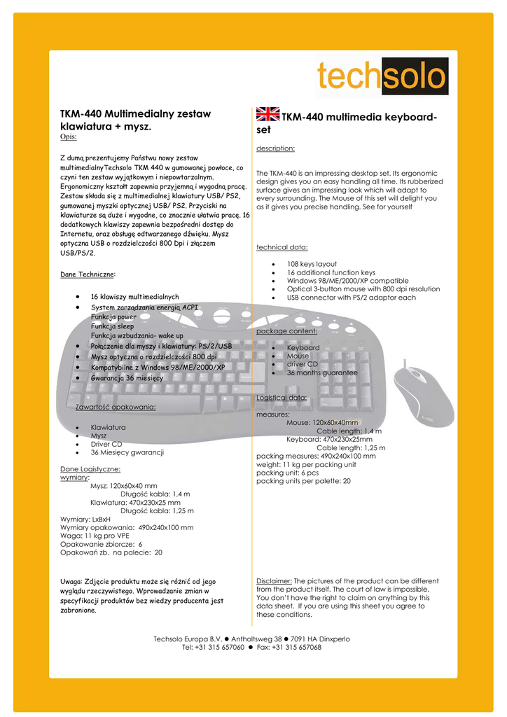 TKM-440 Multimedialny zestaw klawiatura + mysz. Opis: TKM-440 multimedia keyboardset description: Z dumą prezentujemy Państwu nowy zestaw multimedialnyTechsolo TKM 440 w gumowanej powłoce, co czyni ten zestaw wyjątkowym i niepowtarzalnym. Ergonomiczny kształt zapewnia przyjemną i wygodną pracę. Zestaw składa się z multimedialnej klawiatury USB/ PS2, gumowanej myszki optycznej USB/ PS2. Przyciski na klawiaturze są duże i wygodne, co znacznie ułatwia pracę. 16 dodatkowych klawiszy zapewnia bezpośredni dostęp do Internetu, oraz obsługę odtwarzanego dźwięku. Mysz optyczna USB o rozdzielczości 800 Dpi i złączem USB/PS/2. Dane Techniczne: • • • • • • 16 klawiszy multimedialnych System zarządzania energią ACPI Funkcja power Funkcja sleep Funkcja wzbudzania- wake up Połączenie dla myszy i klawiatury: PS/2/USB Mysz optyczna o rozdzielczości 800 dpi Kompatybilne z Windows 98/ME/2000/XP Gwarancja 36 miesięcy The TKM-440 is an impressing desktop set. Its ergonomic design gives you an easy handling all time. Its rubberized surface gives an impressing look which will adapt to every surrounding. The Mouse of this set will delight you as it gives you precise handling. See for yourself technical data: • • • • • 108 keys layout 16 additional function keys Windows 98/ME/2000/XP compatible Optical 3-button mouse with 800 dpi resolution USB connector with PS/2 adaptor each package content: • • • • Keyboard Mouse driver CD 36 months guarantee Logistical data: Zawartość opakowania: • • • • Klawiatura Mysz Driver CD 36 Miesięcy gwarancji Dane Logistyczne: wymiary: Mysz: 120x60x40 mm Długość kabla: 1,4 m Klawiatura: 470x230x25 mm Długość kabla: 1,25 m Wymiary: LxBxH Wymiary opakowania: 490x240x100 mm Waga: 11 kg pro VPE Opakowanie zbiorcze: 6 Opakowań zb. na palecie: 20 Uwaga: Zdjęcie produktu może się różnić od jego wyglądu rzeczywistego. Wprowadzanie zmian w specyfikacji produktów bez wiedzy producenta jest zabronione. measures: Mouse: 120x60x40mm Cable length: 1,4 m Keyboard: 470x230x25mm Cable length: 1,25 m packing measures: 490x240x100 mm weight: 11 kg per packing unit packing unit: 6 pcs packing units per palette: 20 Disclaimer: The pictures of the product can be different from the product itself. The court of law is impossible. You don’t have the right to claim on anything by this data sheet. If you are using this sheet you agree to these conditions. Techsolo Europa B.V. z Antholtsweg 38 z 7091 HA Dinxperlo Tel: +31 315 657060 z Fax: +31 315 657068