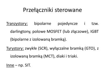 Przełączniki sterowane Tranzystory: bipolarne pojedyncze i tzw. darlingtony, polowe MOSFET (lub złączowe), IGBT (bipolarne z izolowaną bramką). Tyrystory: zwykłe (SCR), wyłączalne bramką (GTO), z izolowaną bramką (MCT), diaki i triaki. Inne – np. SIT. Przełączniki sterowane Tranzystory bipolarne zwykłe – współcześnie rzadko stosowane; tyrystory – do przełączania dużych mocy, przy niewielkich częstotliwościach kluczowania (do kilkunastu kHz). Największe znaczenie –MOSFET i IGBT. Przełączniki sterowane MOSFET: szybsze przełączanie ale (typowo) nieco większy spadek napięcia w stanie przewodzenia niż w IGBT; korzystniejsze od IGBT przy sterowaniu niezbyt dużymi mocami (do kilku kW); zastosowania: przetwornice DCDC, aktywne korektory współczynnika mocy, praca z dużymi częstotliwościami kluczowania (kilkadziesiąt kHz do powyżej 1 MHz). Tranzystory MOSFET Zasada budowy: wykorzystanie struktury metalizolator-półprzewodnik z dodatkowymi obszarami źródła (source) i drenu (drain). Zakres rozwiązao konstrukcyjnych i zastosowao bardzo szeroki. Struktury MOS o bardzo małych rozmiarach to główne elementy układów scalonych. W najnowszych typach układów scalonych – do jednego miliarda elementarnych tranzystorów MOSFET. Tranzystory MOSFET Kanał wbudowany n: Tranzystory MOSFET Kanał indukowany n: • Najczęściej kanał n (Si: mn = 3mp). • Obszary pracy (dla uBS = 0) • Normalny (uDS>0) i odwrotny (uDS<0). • Normalny: • Odcięcie uGS < UP • Nienasycenie uGS – UP > uDS > 0 • Nasycenie 0 < uGS – UP < uDS. • Model stałoprądowy wielkosygnałowy: •Odcięcie : iDS = 0 •Nienasycenie: iDS B uGS U P u DS 2 DS u 2 •Nasycenie: iDS B0 1 2 1 uDS U D 0 uGS U P uGS U P Przybliżenie: iDS B uGS 2 UP 2 2 B W COX L W 0 L tOX OX Charakterystyka przenoszenia dla uDS = const. Charakterystyki wyjściowe: uGS 3 uGS 2 uGS1 UP Tranzystory MOSFET Praca w charakterze przełącznika sterowanego (kanał n) • Odcięcie (przełącznik rozwarty), uGS < UP ; iD = 0. • Zakres „liniowy” (silne nienasycenie), uGS – UP >> uDS (przełącznik prawie zwarty). • Zakres pośredni – obszar nasycenia. Tranzystory MOSFET W zakresie „liniowym”: Tranzystory MOSFET Całkowita rezystancja D-S w zakresie liniowym: Tranzystory MOSFET rS – pasożytnicza rezystancja półprzewodnika i doprowadzeo, głównie rezystancja warstwy drenu. Potrzebne małe rCH i małe rS. Wymagane duże B; równoległe łączenie wielu struktur elementarnych. Wskazane silne domieszkowanie obszaru drenu, ale wtedy małe napięcie przebicia. Model wielkosygnałowy dynamiczny dla u BS 0 MOSFET-y dyskretne dużej mocy: specjalne konstrukcje drenu, wielosegmentowe. wspólny dla wielu Obszar segmentów, połączony z metalową częścią obudowy (dołączaną do radiatora). MOSFET-y dyskretne dużej mocy: specjalne konstrukcje drenu, wielosegmentowe. wspólny dla wielu Obszar segmentów, połączony z metalową częścią obudowy (dołączaną do radiatora). Przykład informacji katalogowych